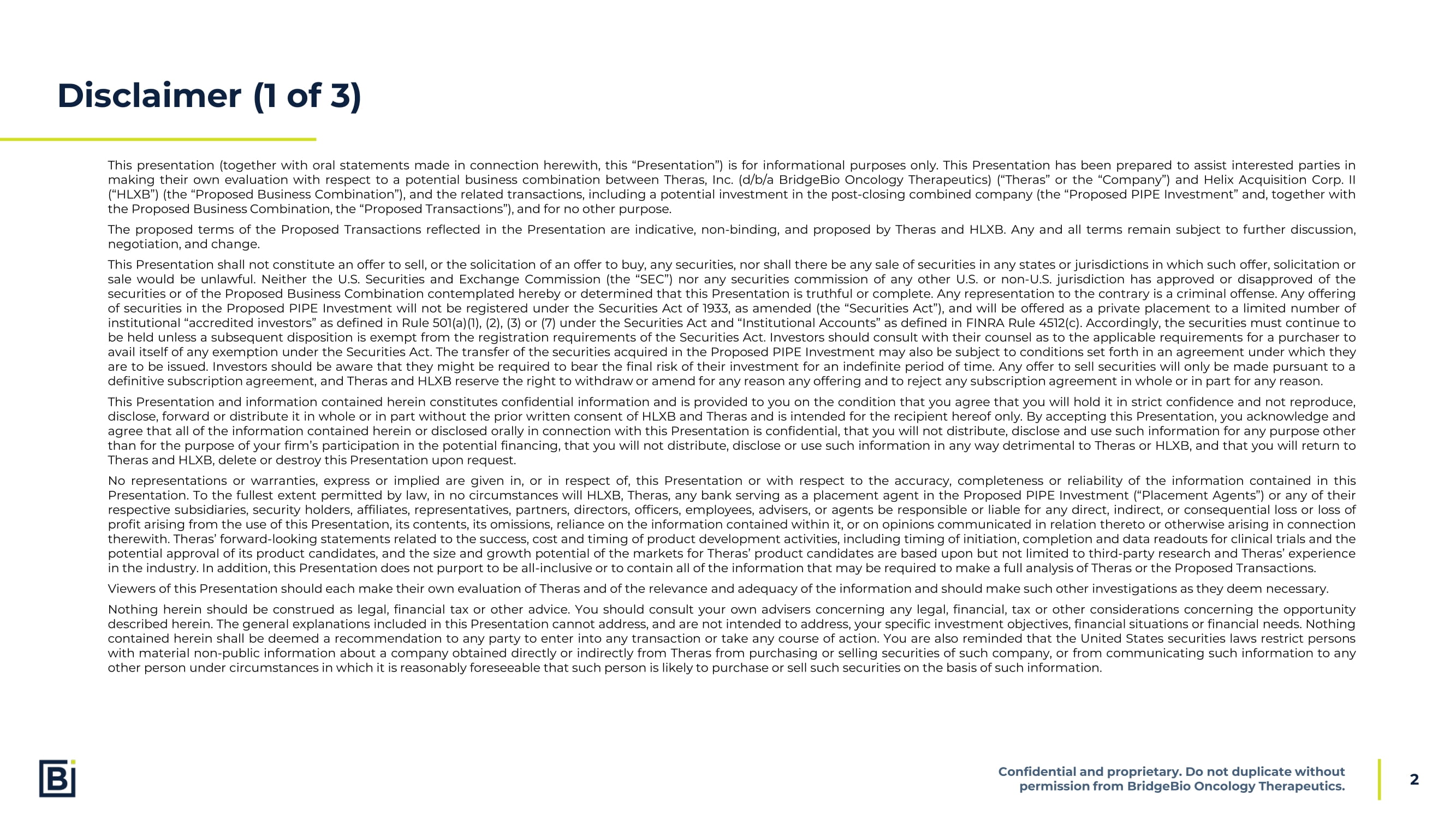 Do not duplicate without permission from BridgeBio Oncology Therapeutics. This presentation (together with oral statements made in connection herewith, this “Presentation”) is for informational purposes only . This Presentation has been prepared to assist interested parties in making their own evaluation with respect to a potential business combination between Theras , Inc . (d/b/a BridgeBio Oncology Therapeutics) (“ Theras ” or the “Company”) and Helix Acquisition Corp . II (“HLXB”) (the “Proposed Business Combination”), and the related transactions, including a potential investment in the post - closing combined company (the “Proposed PIPE Investment” and, together with the Proposed Business Combination, the “Proposed Transactions”), and for no other purpose . The proposed terms of the Proposed Transactions reflected in the Presentation are indicative, non - binding, and proposed by Theras and HLXB . Any and all terms remain subject to further discussion, negotiation, and change . This Presentation shall not constitute an offer to sell, or the solicitation of an offer to buy, any securities, nor shall there be any sale of securities in any states or jurisdictions in which such offer, solicitation or sale would be unlawful . Neither the U . S . Securities and Exchange Commission (the “SEC”) nor any securities commission of any other U . S . or non - U . S . jurisdiction has approved or disapproved of the securities or of the Proposed Business Combination contemplated hereby or determined that this Presentation is truthful or complete . Any representation to the contrary is a criminal offense . Any offering of securities in the Proposed PIPE Investment will not be registered under the Securities Act of 1933 , as amended (the “Securities Act”), and will be offered as a private placement to a limited number of institutional “accredited investors” as defined in Rule 501 (a)( 1 ), ( 2 ), ( 3 ) or ( 7 ) under the Securities Act and “Institutional Accounts” as defined in FINRA Rule 4512 (c) . Accordingly, the securities must continue to be held unless a subsequent disposition is exempt from the registration requirements of the Securities Act . Investors should consult with their counsel as to the applicable requirements for a purchaser to avail itself of any exemption under the Securities Act . The transfer of the securities acquired in the Proposed PIPE Investment may also be subject to conditions set forth in an agreement under which they are to be issued . Investors should be aware that they might be required to bear the final risk of their investment for an indefinite period of time . Any offer to sell securities will only be made pursuant to a definitive subscription agreement, and Theras and HLXB reserve the right to withdraw or amend for any reason any offering and to reject any subscription agreement in whole or in part for any reason . This Presentation and information contained herein constitutes confidential information and is provided to you on the condition that you agree that you will hold it in strict confidence and not reproduce, disclose, forward or distribute it in whole or in part without the prior written consent of HLXB and Theras and is intended for the recipient hereof only . By accepting this Presentation, you acknowledge and agree that all of the information contained herein or disclosed orally in connection with this Presentation is confidential, that you will not distribute, disclose and use such information for any purpose other than for the purpose of your firm’s participation in the potential financing, that you will not distribute, disclose or use such information in any way detrimental to Theras or HLXB, and that you will return to Theras and HLXB, delete or destroy this Presentation upon request . No representations or warranties, express or implied are given in, or in respect of, this Presentation or with respect to the accuracy, completeness or reliability of the information contained in this Presentation . To the fullest extent permitted by law, in no circumstances will HLXB, Theras , any bank serving as a placement agent in the Proposed PIPE Investment (“Placement Agents”) or any of their respective subsidiaries, security holders, affiliates, representatives, partners, directors, officers, employees, advisers, or agents be responsible or liable for any direct, indirect, or consequential loss or loss of profit arising from the use of this Presentation, its contents, its omissions, reliance on the information contained within it, or on opinions communicated in relation thereto or otherwise arising in connection therewith . Theras ’ forward - looking statements related to the success, cost and timing of product development activities, including timing of initiation, completion and data readouts for clinical trials and the potential approval of its product candidates, and the size and growth potential of the markets for Theras ’ product candidates are based upon but not limited to third - party research and Theras ’ experience in the industry . In addition, this Presentation does not purport to be all - inclusive or to contain all of the information that may be required to make a full analysis of Theras or the Proposed Transactions . Viewers of this Presentation should each make their own evaluation of Theras and of the relevance and adequacy of the information and should make such other investigations as they deem necessary . Nothing herein should be construed as legal, financial tax or other advice . You should consult your own advisers concerning any legal, financial, tax or other considerations concerning the opportunity described herein . The general explanations included in this Presentation cannot address, and are not intended to address, your specific investment objectives, financial situations or financial needs . Nothing contained herein shall be deemed a recommendation to any party to enter into
