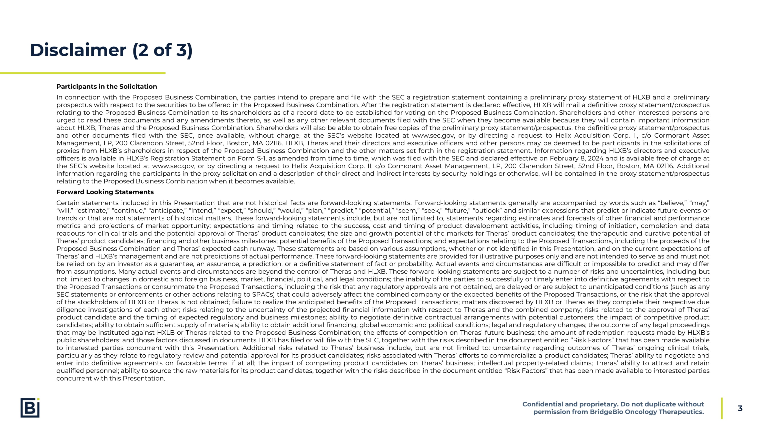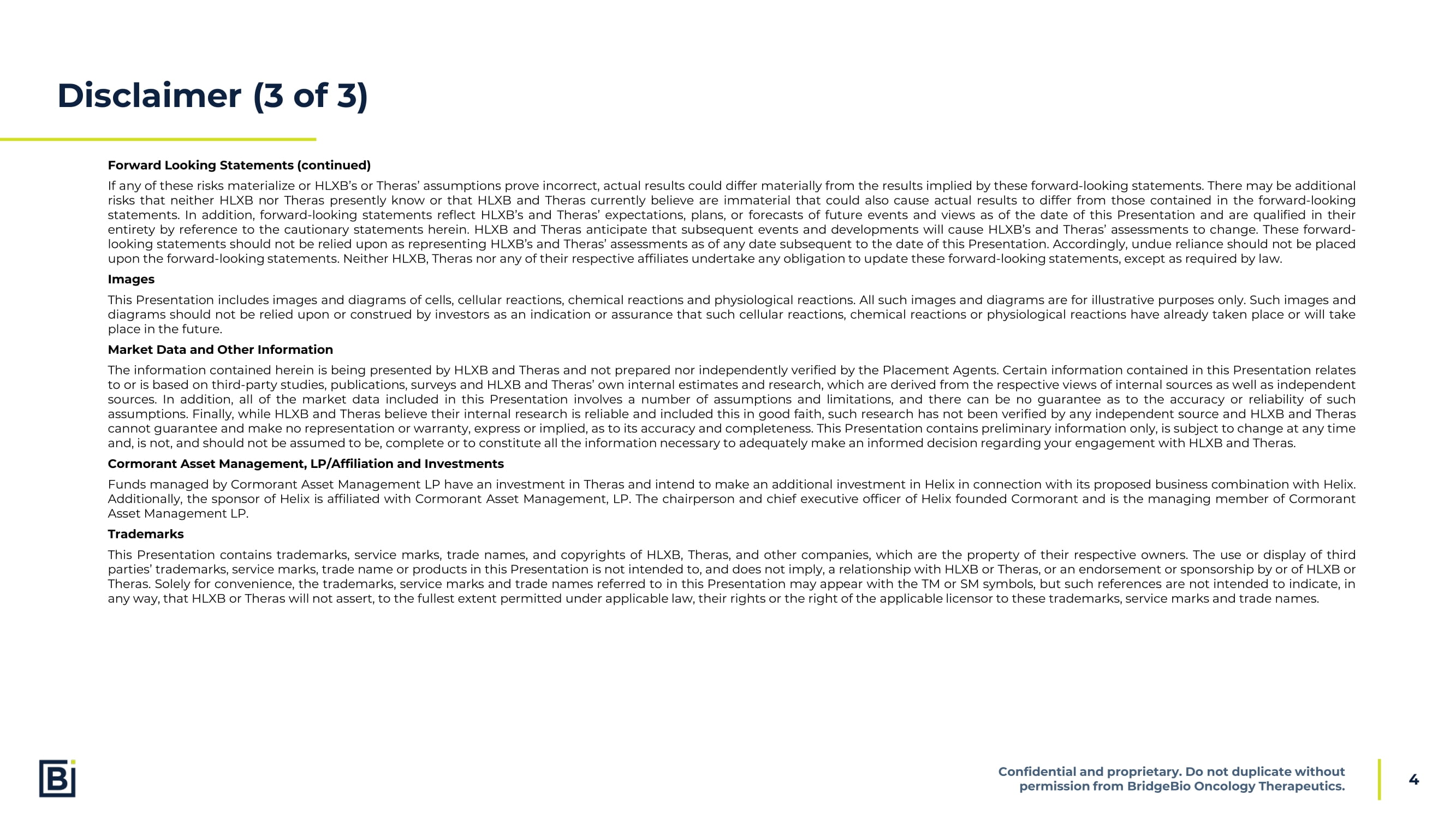 Disclaimer (2 of 3) 3 Confidential and proprietary. Do not duplicate without permission from BridgeBio Oncology Therapeutics. Participants in the Solicitation In connection with the Proposed Business Combination, the parties intend to prepare and file with the SEC a registration statement containing a preliminary proxy statement of HLXB and a preliminary prospectus with respect to the securities to be offered in the Proposed Business Combination . After the registration statement is declared effective, HLXB will mail a definitive proxy statement/prospectus relating to the Proposed Business Combination to its shareholders as of a record date to be established for voting on the Proposed Business Combination . Shareholders and other interested persons are urged to read these documents and any amendments thereto, as well as any other relevant documents filed with the SEC when they become available because they will contain important information about HLXB, Theras and the Proposed Business Combination . Shareholders will also be able to obtain free copies of the preliminary proxy statement/prospectus, the definitive proxy statement/prospectus and other documents filed with the SEC, once available, without charge, at the SEC’s website located at www . sec . gov, or by directing a request to Helix Acquisition Corp . II, c/o Cormorant Asset Management, LP, 200 Clarendon Street, 52 nd Floor, Boston, MA 02116 . HLXB, Theras and their directors and executive officers and other persons may be deemed to be participants in the solicitations of proxies from HLXB’s shareholders in respect of the Proposed Business Combination and the other matters set forth in the registration statement . Information regarding HLXB’s directors and executive officers is available in HLXB’s Registration Statement on Form S - 1 , as amended from time to time, which was filed with the SEC and declared effective on February 8 , 2024 and is available free of charge at the SEC’s website located at www . sec . gov, or by directing a request to Helix Acquisition Corp . II, c/o Cormorant Asset Management, LP, 200 Clarendon Street, 52 nd Floor, Boston, MA 02116 . Additional information regarding the participants in the proxy solicitation and a description of their direct and indirect interests by security holdings or otherwise, will be contained in the proxy statement/prospectus relating to the Proposed Business Combination when it becomes available . Forward Looking Statements Certain statements included in this Presentation that are not historical facts are forward - looking statements . Forward - looking statements generally are accompanied by words such as “believe,” “may,” “will,” “estimate,” “continue,” “anticipate,” “intend,” “expect,” “should,” “would,” “plan,” “predict,” “potential,” “seem,” “seek,” “future,” “outlook” and similar expressions that predict or indicate future events or trends or that are not statements of historical matters . These forward - looking statements include, but are not limited to, statements regarding estimates and forecasts of other financial and performance metrics and projections of market opportunity ; expectations and timing related to the success, cost and timing of product development activities, including timing of initiation, completion and data readouts for clinical trials and the potential approval of Theras ’ product candidates ; the size and growth potential of the markets for Theras ’ product candidates ; the therapeutic and curative potential of Theras ’ product candidates ; financing and other business milestones ; potential benefits of the Proposed Transactions ; and expectations relating to the Proposed Transactions, including the proceeds of the Proposed Business Combination and Theras ’ expected cash runway . These statements are based on various assumptions, whether or not identified in this Presentation, and on the current expectations of Theras ’ and HLXB’s management and are not predictions of actual performance . These forward - looking statements are provided for illustrative purposes only and are not intended to serve as and must not be relied on by an investor as a guarantee, an assurance, a prediction, or a definitive statement of fact or probability . Actual events and circumstances are difficult or impossible to predict and may differ from assumptions . Many actual events and circumstances are beyond the control of Theras and HLXB . These forward - looking statements are subject to a number of risks and uncertainties, including but not limited to changes in domestic and foreign business, market, financial, political, and legal conditions ; the inability of the parties to successfully or timely enter into definitive agreements with respect to the Proposed Transactions or consummate the Proposed Transactions, including the risk that any regulatory approvals are not obtained, are delayed or are subject to unanticipated conditions (such as any SEC statements or enforcements or other actions relating to SPACs) that could adversely affect the combined company or the expected benefits of the Proposed Transactions, or the risk that the approval of the stockholders of HLXB or Theras is not obtained ; failure to realize the anticipated benefits of the Proposed Transactions ; matters discovered by HLXB or Theras as they complete their respective due diligence investigations of each other ; risks relating to the uncertainty of the projected financial information with respect to Theras and the combined company ; risks related to the approval of Theras ’ product candidate and the timing of expected regulatory and business milestones ; ability to negotiate definitive contractual arrangements with potential customers ; the impact of competitive product candidates ; ability to obtain sufficient supply of materials ; ability to obtain additional financing ; global economic and political condit