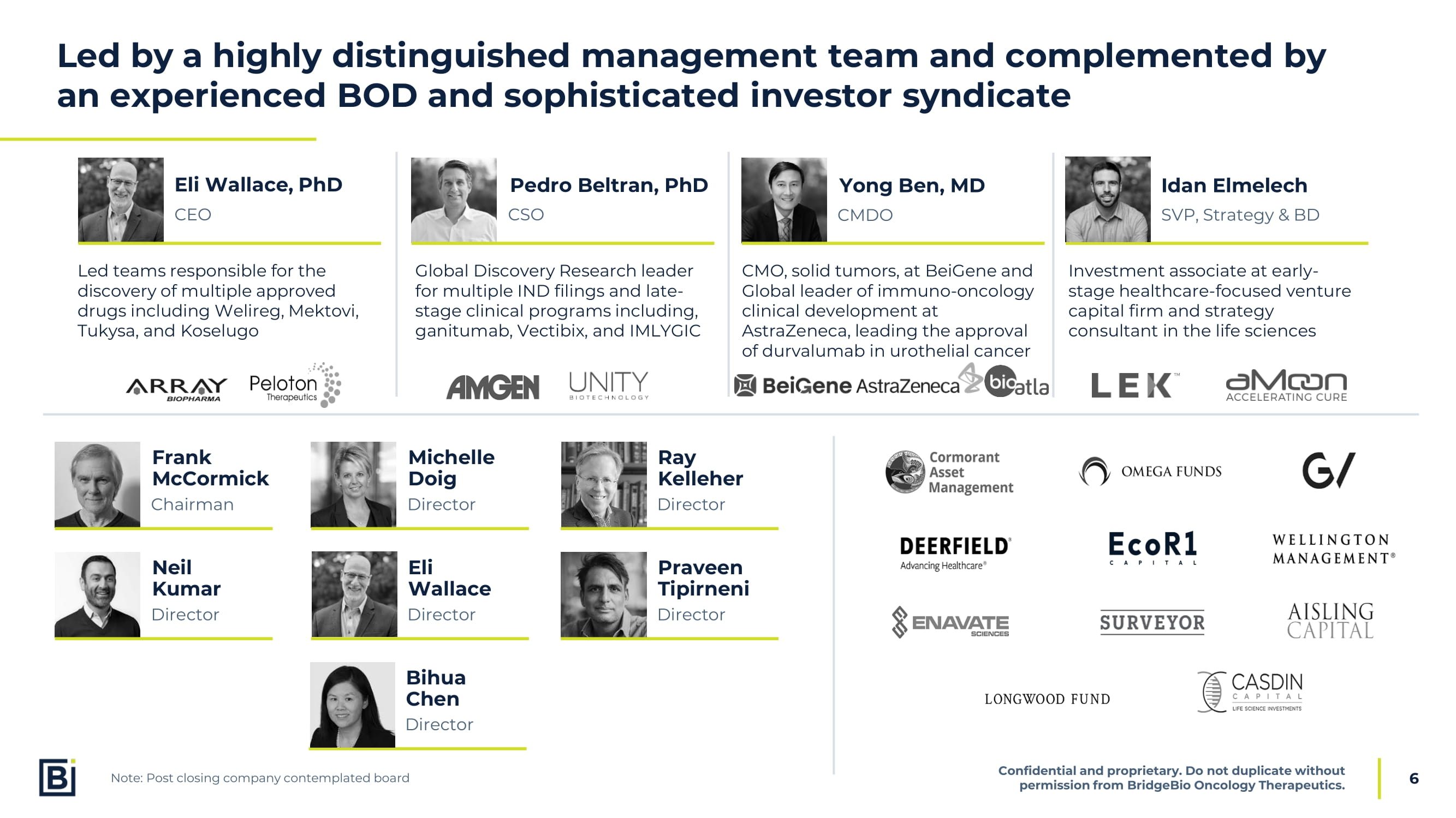 Advancing next generation RAS - pathway targeted small molecules 5 Financing Multiple clinical assets with anticipated value inflection points over the next 9 - 18 months , and a proven drug discovery engine Total cash of $500M * at closing (exp. mid - 2025) provides runway into mid - 2027 to execute across multiple clinical programs Pipeline Optimized target coverage for patients with tumors driven by RAS and PI3K and a synergistic portfolio that is designed to enable targeted KRAS combinations Differentiation Confidential and proprietary. Do not duplicate without permission from BridgeBio Oncology Therapeutics.