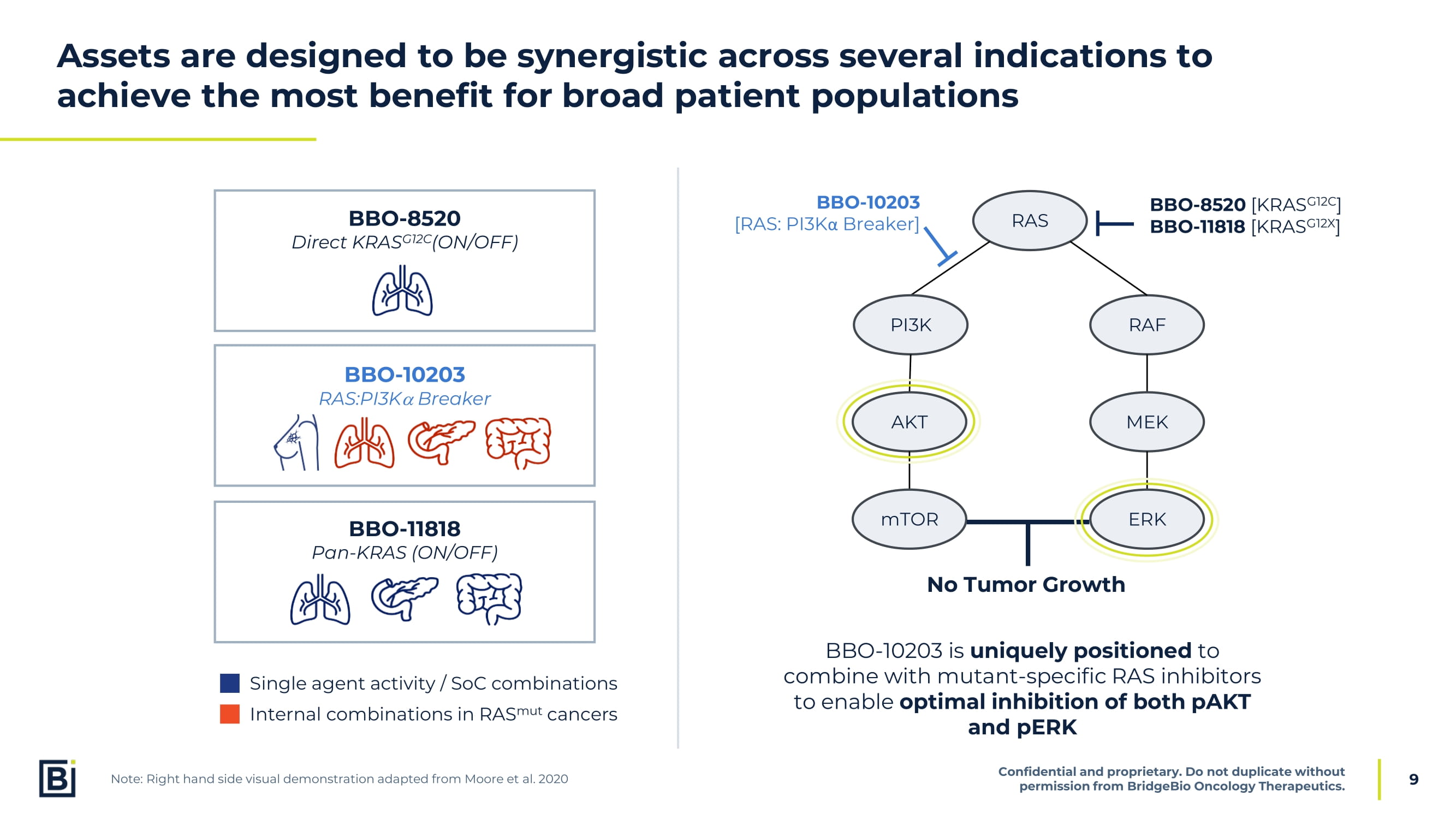 Source: Skoulidis et al., 2021 NEJM; Janne et al., 2022 NEJM; FDA BBOT’s pipeline is poised to close key activity gaps in the RAS - focused therapeutic space 8 Opportunity Status Mechanism of Action Program / Target KRAS G12C NSCLC Phase 1 monotherapy and PD - 1 combination dose escalation enrolling ▪ First direct inhibitor of KRAS G12C (ON) ▪ Inhibits both KRAS G12C GTP (active) and GDP (inactive) states ▪ Differentiates from KRAS G12C GDP (inactive) - only inhibitors BBO - 8520 KRAS G12C (ON / OFF) PIK3CA mut BC HER2 amp BC KRAS mut NSCLC KRAS mut PDAC KRAS mut CRC Phase 1 monotherapy dose escalation enrolling ▪ Blocks specific interaction between RAS and PI3K ▪ RAS driver agnostic (KRAS, HRAS and NRAS) ▪ Selectively blocks PI3K / AKT effector signaling in the tumor ▪ Decreased risk for hyperglycemia / hyperinsulinemia BBO - 10203 RAS:PI3K α Breaker KRAS G12X NSCLC KRAS G12X PDAC KRAS G12X CRC IND submission planned Q1 - 2025 ▪ Direct inhibitor of KRAS G12X (ON/OFF) ▪ Potent pan - KRAS inhibitor ▪ Directly binds mutant KRAS BBO - 11818 Pan - KRAS (ON / OFF) Pipeline overview Confidential and proprietary. Do not duplicate without permission from BridgeBio Oncology Therapeutics. Note: Projections are subject to inherent limitations and ongoing development results. Actual results may differ from expecta tio ns. The timing of regulatory submissions is subject to additional discussions with regulators.