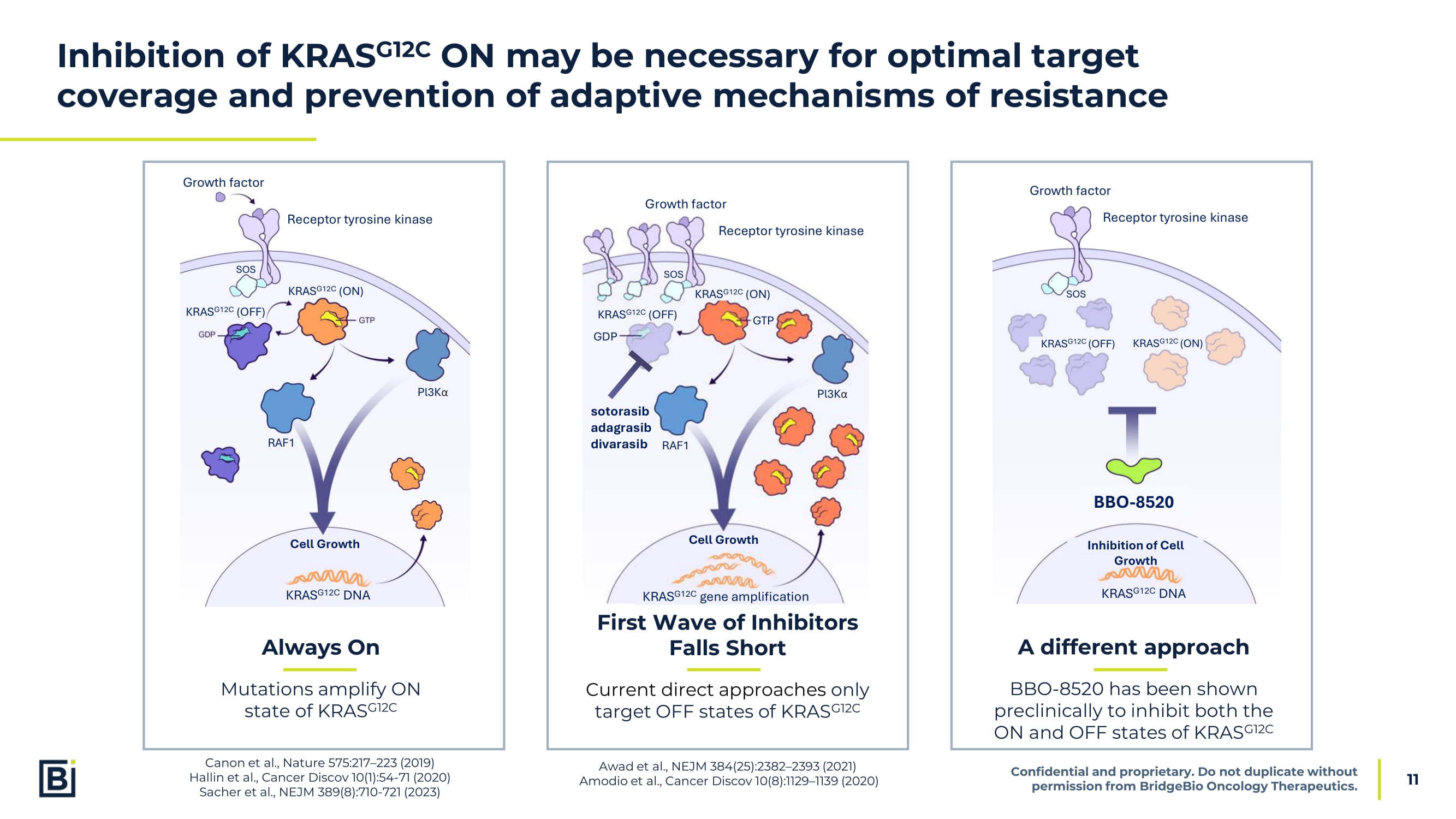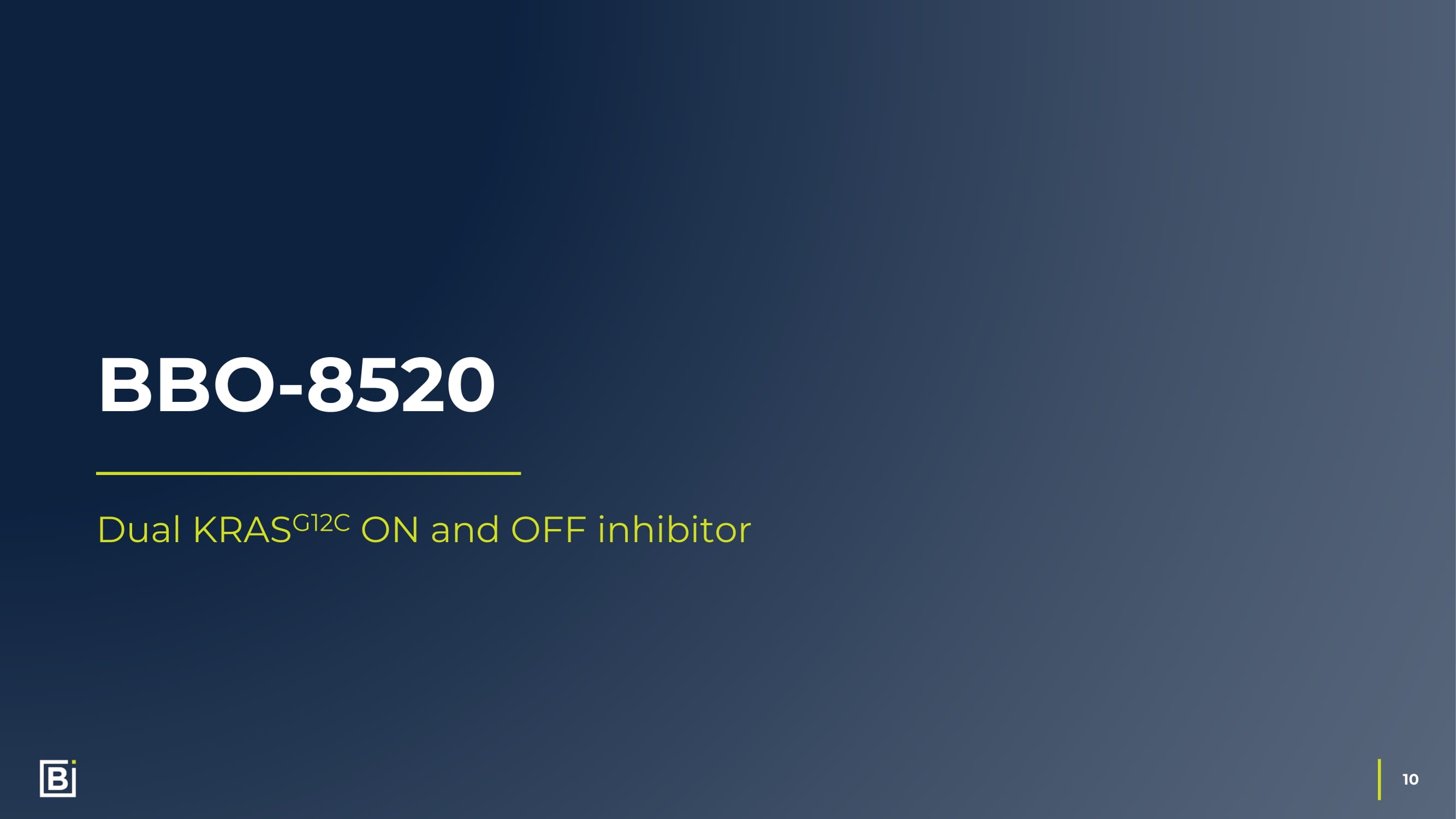 BC = breast cancer; NSCLC = non - small cell lung cancer; CRC = colorectal cancer; PDAC = pancreatic ductal adenocarcinoma ~250K annual incident patients in the US Assets are designed to be synergistic across several indications to achieve the most benefit for broad patient populations 9 BBO - 8520 Direct KRAS G12C (ON/ OFF ) BBO - 11818 Pan - KRAS (ON/OFF) BBO - 10203 RAS:PI3K Breaker BBO - 10203 is uniquely positioned to combine with mutant - specific RAS inhibitors to enable optimal inhibition of both pAKT and pERK BBO - 10203 [RAS: PI3K α Breaker] RAS PI3K AKT RAF MEK mTOR ERK No Tumor Growth BBO - 8520 [KRAS G12C ] BBO - 11818 [KRAS G12X ] Single agent activity / SoC combinations Internal combinations in RAS mut cancers Confidential and proprietary. Do not duplicate without permission from BridgeBio Oncology Therapeutics. Note: Right hand side visual demonstration adapted from Moore et al. 2020 BBO - 8520 10 Dual KRAS G12C ON and OFF inhibitor