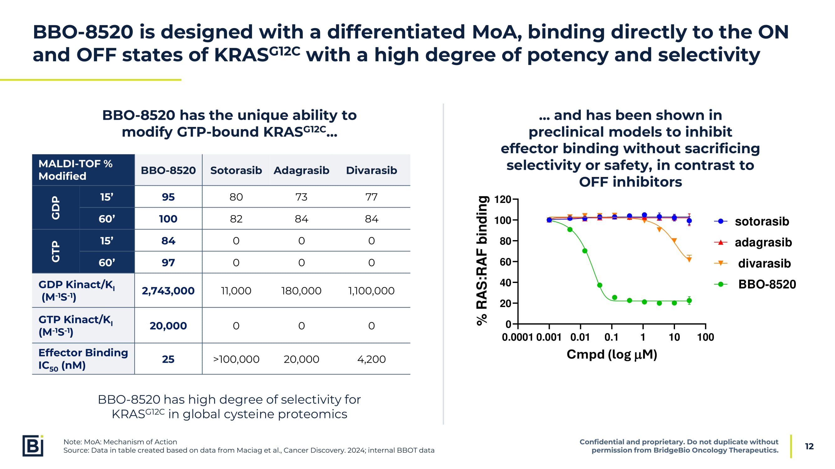 Inhibition of KRAS G12C ON may be necessary for optimal target coverage and prevention of adaptive mechanisms of resistance 11 Always On Mutations amplify ON state of KRAS G12C First Wave of Inhibitors Falls Short Current direct approaches only target OFF states of KRAS G12C A different approach BBO - 8520 has been shown preclinically to inhibit both the ON and OFF states of KRAS G12C BBO - 8520 Growth factor Receptor tyrosine kinase KRAS G12C (OFF) KRAS G12C (ON) SOS KRAS G12C DNA Inhibition of Cell Growth sotorasib adagrasib divarasib KRAS G12C gene amplification Growth factor Receptor tyrosine kinase Cell Growth KRAS G12C (OFF) KRAS G12C (ON) RAF1 Pl3K α GDP GTP SOS Growth factor Receptor tyrosine kinase Cell Growth KRAS G12C DNA Pl3K α RAF1 KRAS G12C (OFF) KRAS G12C (ON) SOS Confidential and proprietary. Do not duplicate without permission from BridgeBio Oncology Therapeutics. Canon et al., Nature 575:217 – 223 (2019) Hallin et al., Cancer Discov 10(1):54 - 71 (2020) Sacher et al., NEJM 389(8):710 - 721 (2023) Awad et al., NEJM 384(25):2382 – 2393 (2021) Amodio et al., Cancer Discov 10(8):1129 – 1139 (2020)