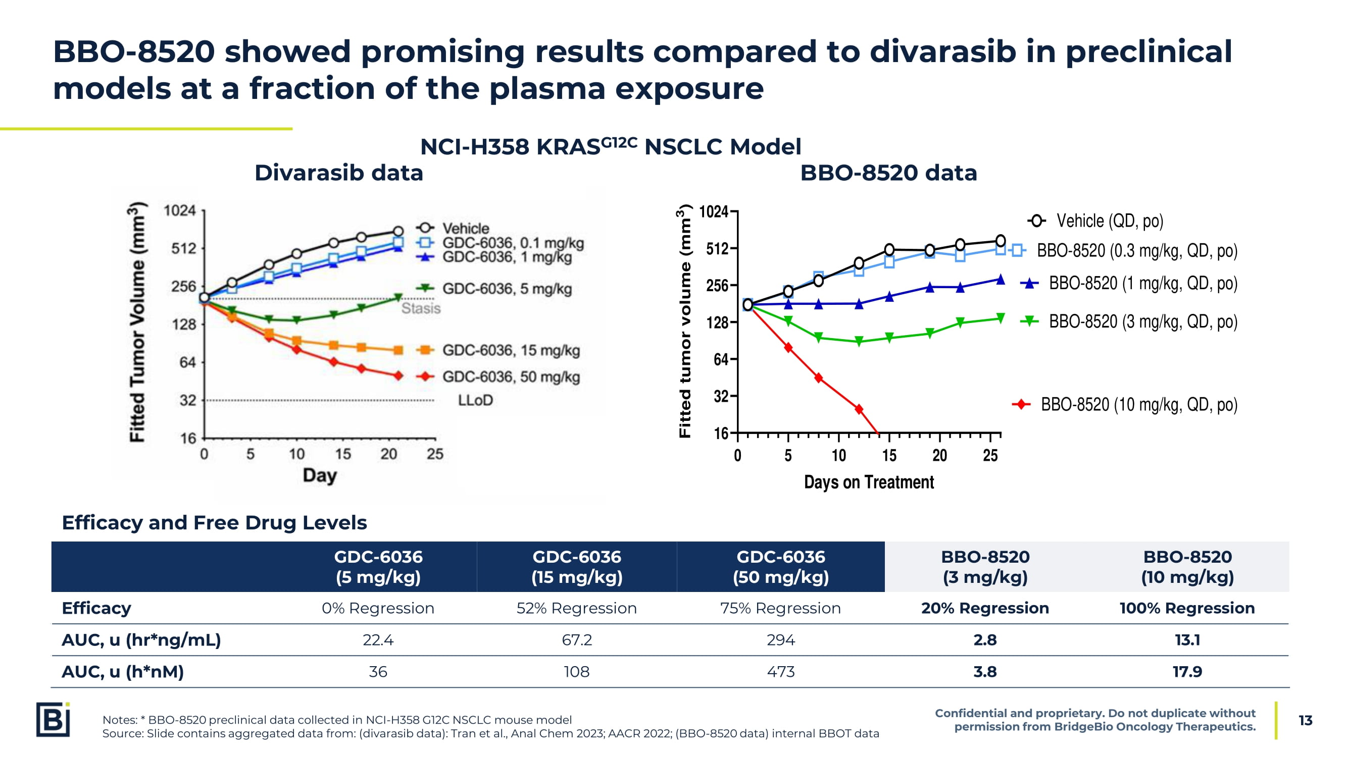 BBO - 8520 is designed with a differentiated MoA , binding directly to the ON and OFF states of KRAS G12C with a high degree of potency and selectivity 12 Confidential and proprietary. Do not duplicate without permission from BridgeBio Oncology Therapeutics. Note: MoA : Mechanism of Action Source: Data in table created based on data from Maciag et al., Cancer Discovery. 2024; internal BBOT data Divarasib Adagrasib Sotorasib BBO - 8520 MALDI - TOF % Modified 77 73 80 95 15’ GDP 84 84 82 100 60’ 0 0 0 84 15’ GTP 0 0 0 97 60’ 1,100,000 180,000 11,000 2,743,000 GDP Kinact /K I (M - 1 S - 1 ) 0 0 0 20,000 GTP Kinact /K I (M - 1 S - 1 ) 4,200 20,000 >100,000 25 Effector Binding IC 50 ( nM ) BBO - 8520 has the unique ability to modify GTP - bound KRAS G12C … BBO - 8520 has high degree of selectivity for KRAS G12C in global cysteine proteomics … and has been shown in preclinical models to inhibit effector binding without sacrificing selectivity or safety, in contrast to OFF inhibitors 0.00010.001 0.01 0.1 1 10 100 0 20 40 60 80 100 120 Cmpd (logM) % R A S : R A F b i n d i n g BBO-8520 sotorasib adagrasib divarasib Cmpd (log M)