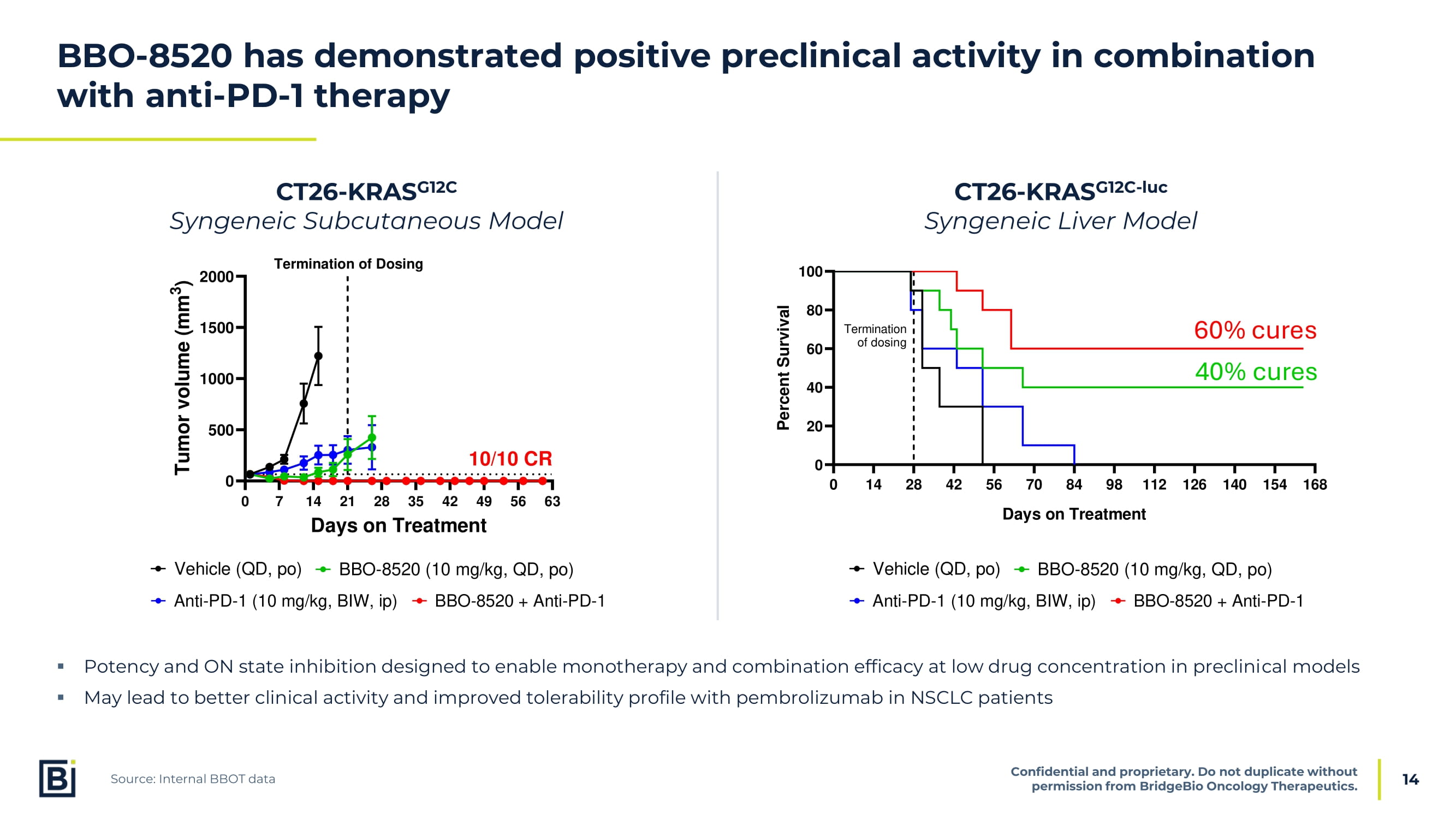 BBO - 8520 showed promising results compared to divarasib in preclinical models at a fraction of the plasma exposure 13 Notes: * BBO - 8520 preclinical data collected in NCI - H358 G12C NSCLC mouse model Source: Slide contains aggregated data from: ( divarasib data): Tran et al., Anal Chem 2023; AACR 2022; (BBO - 8520 data) internal BBOT data 0 5 10 15 20 25 16 32 64 128 256 512 1024 Days on Treatment F i t t e d t u m o r v o l u m e ( m m 3 ) Vehicle (QD, po) BBO-8520 (0.3 mg/kg, QD, po) BBO-8520 (1 mg/kg, QD, po) BBO-8520 (3 mg/kg, QD, po) BBO-8520 (10 mg/kg, QD, po) Efficacy and Free Drug Levels BBO - 8520 (10 mg/kg) BBO - 8520 (3 mg/kg) GDC - 6036 (50 mg/kg) GDC - 6036 (15 mg/kg) GDC - 6036 (5 mg/kg) 100% Regression 20% Regression 75% Regression 52% Regression 0% Regression Efficacy 13.1 2.8 294 67.2 22.4 AUC, u ( hr *ng/mL) 17.9 3.8 473 108 36 AUC, u (h* nM ) BBO - 8520 data Divarasib data Confidential and proprietary. Do not duplicate without permission from BridgeBio Oncology Therapeutics.