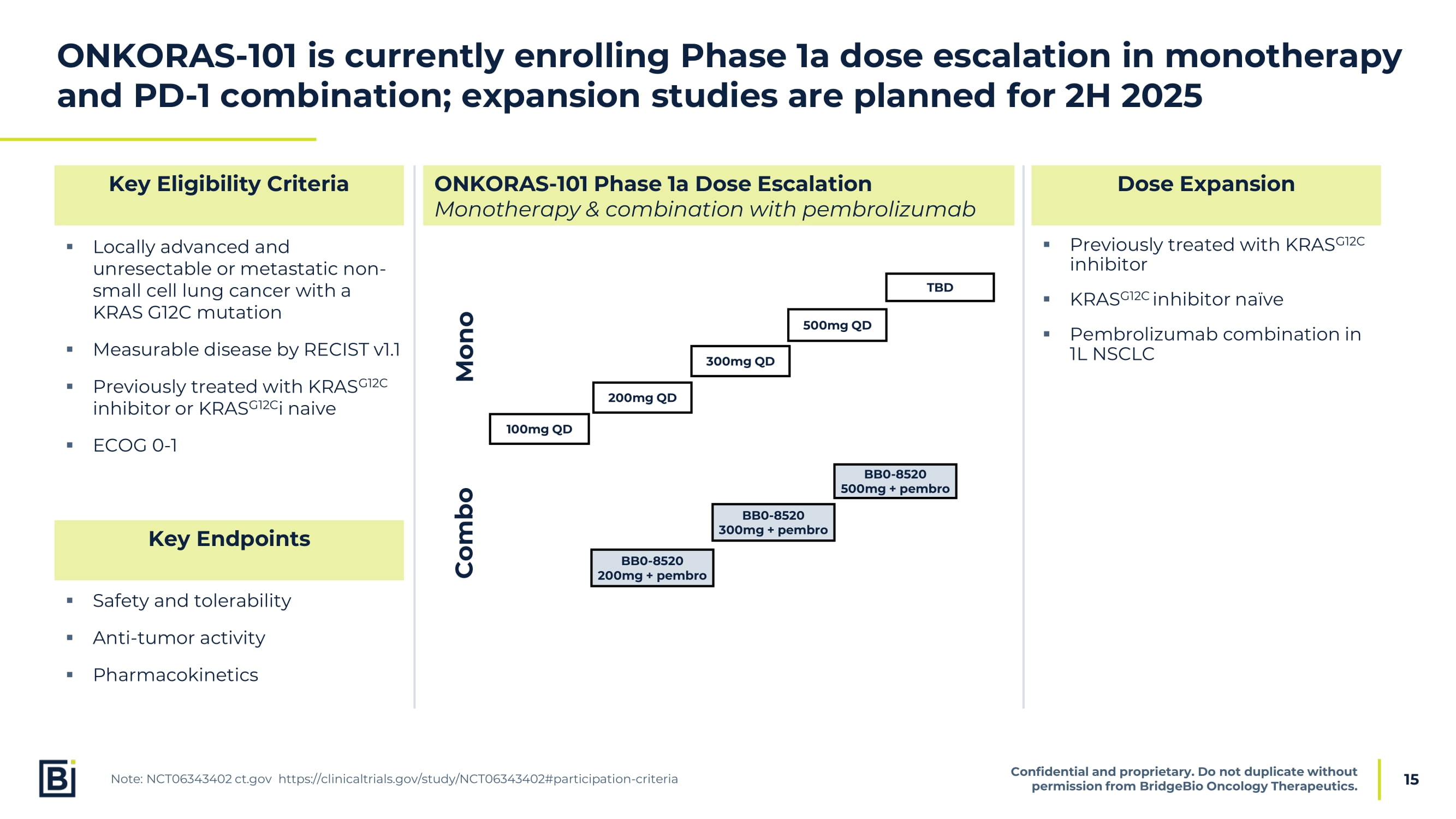 NCI - H358 KRAS G12C NSCLC Model BBO - 8520 has demonstrated positive preclinical activity in combination with anti - PD - 1 therapy 14 CT26 - KRAS G12C - luc Syngeneic Liver Model CT26 - KRAS G12C Syngeneic Subcutaneous Model 0 7 14 21 28 35 42 49 56 63 0 500 1000 1500 2000 Days on Treatment T u m o r v o l u m e ( m m 3 ) Termination of Dosing 10/10 CR 0 14 28 42 56 70 84 98 112 126 140 154 168 0 20 40 60 80 100 Days on Treatment P e r c e n t S u r v i v a l Termination of dosing 60% cures 40% cures ▪ Potency and ON state inhibition designed to enable monotherapy and combination efficacy at low drug concentration in preclini cal models ▪ May lead to better clinical activity and improved tolerability profile with pembrolizumab in NSCLC patients Confidential and proprietary. Do not duplicate without permission from BridgeBio Oncology Therapeutics.
