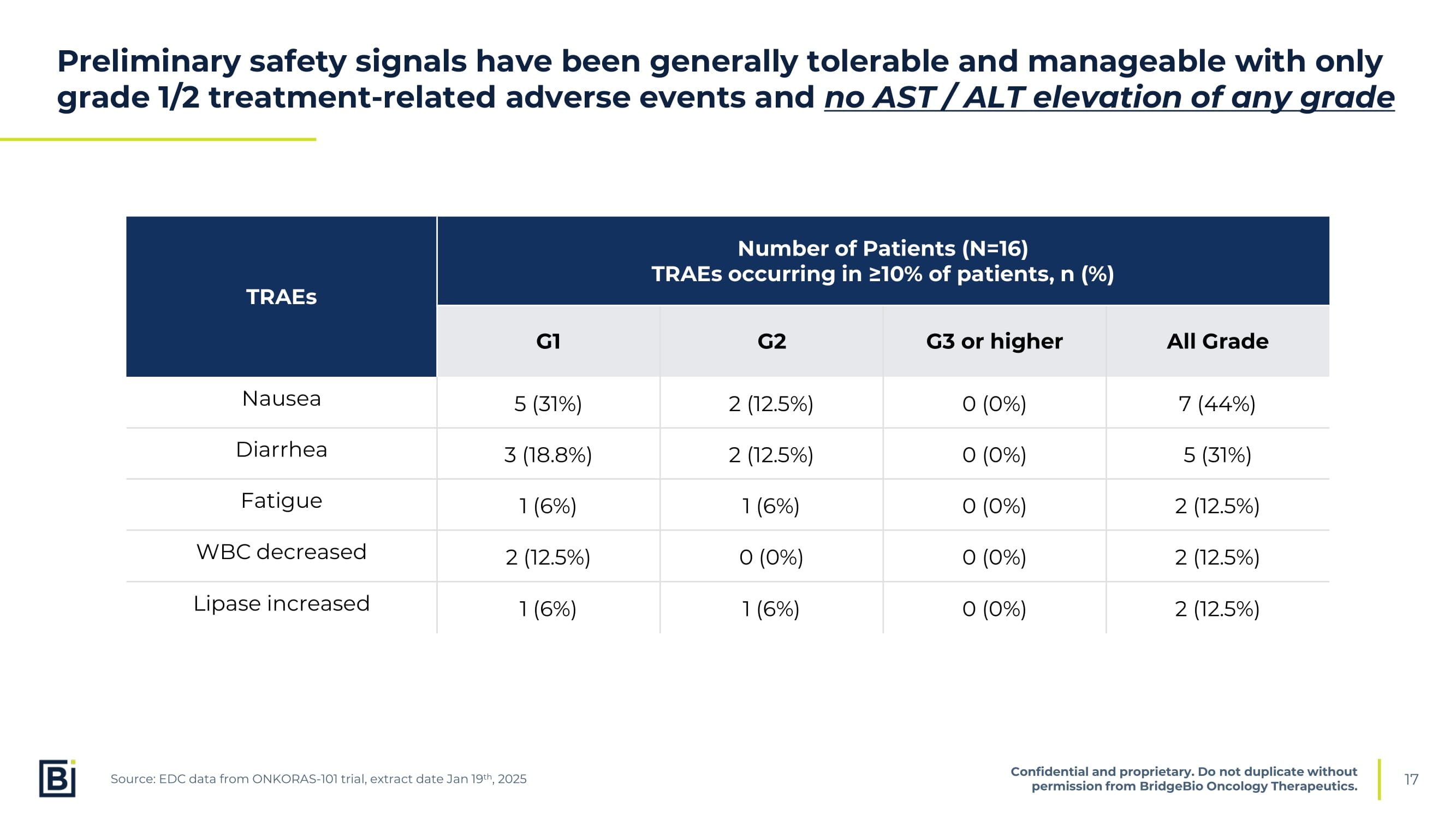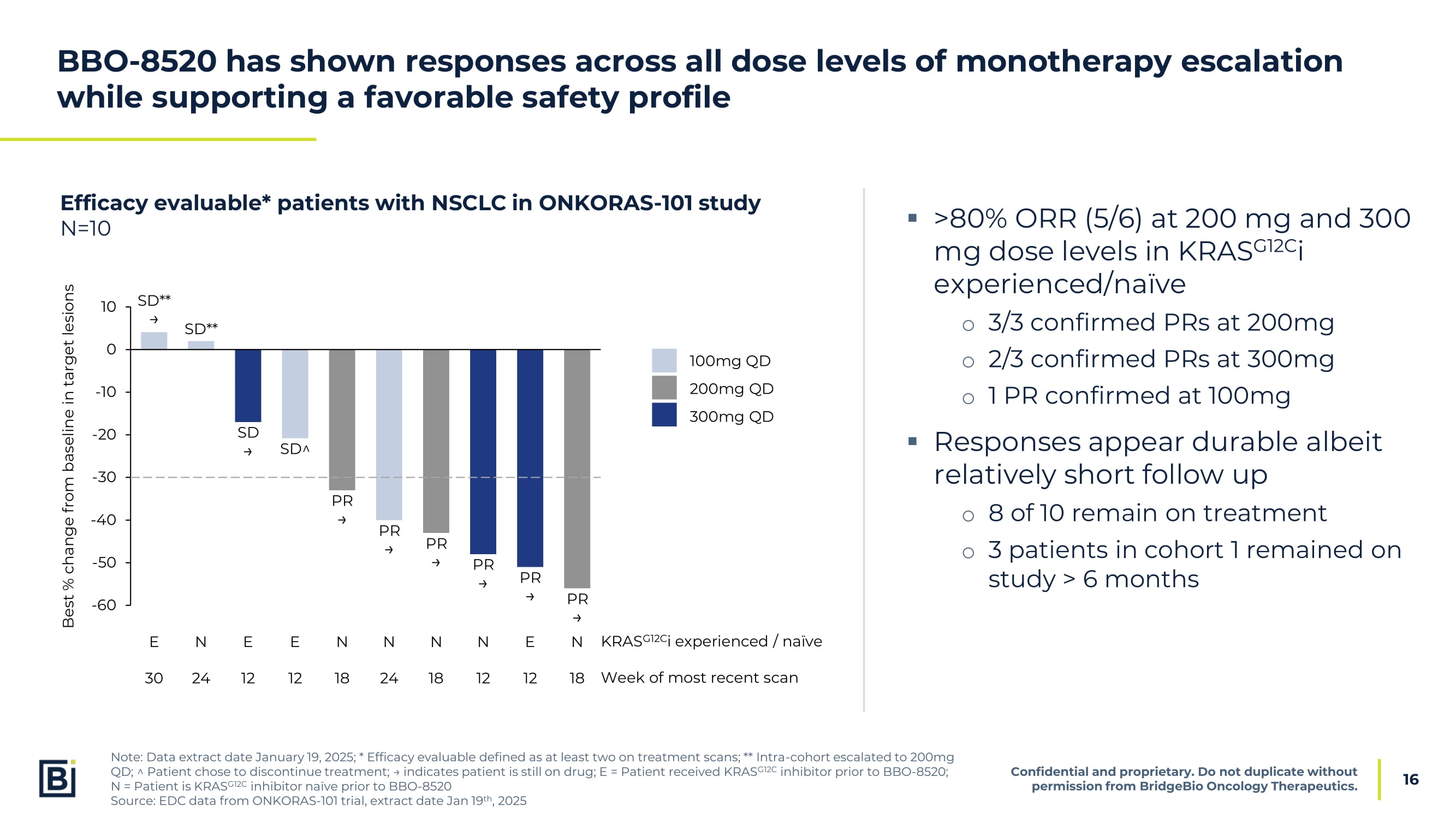 Source: Internal BBOT data ONKORAS - 101 is currently enrolling Phase 1a dose escalation in monotherapy and PD - 1 combination; expansion studies are planned for 2H 2025 15 ONKORAS - 101 Phase 1a Dose Escalation Monotherapy & combination with pembrolizumab Confidential and proprietary. Do not duplicate without permission from BridgeBio Oncology Therapeutics. Mono Combo 5 00mg QD TBD 200mg QD 300mg QD 100mg QD BB0 - 8520 200mg + pembro BB0 - 8520 300mg + pembro BB0 - 8520 500mg + pembro Key Eligibility Criteria Dose Expansion Key Endpoints ▪ Safety and tolerability ▪ Anti - tumor activity ▪ Pharmacokinetics ▪ Previously treated with KRAS G12C inhibitor ▪ KRAS G12C inhibitor naïve ▪ Pembrolizumab combination in 1L NSCLC ▪ Locally advanced and unresectable or metastatic non - small cell lung cancer with a KRAS G12C mutation ▪ Measurable disease by RECIST v1.1 ▪ Previously treated with KRAS G12C inhibitor or KRAS G12C i naive ▪ ECOG 0 - 1 Note: NCT06343402 ct.gov https://clinicaltrials.gov/study/NCT06343402#participation - criteria BBO - 8520 has shown responses across all dose levels of monotherapy escalation while supporting a favorable safety profile 16 -60 -50 -40 -30 -20 -10 0 10 Best % change from baseline in target lesions E 30 N 24 E 12 E 12 N 18 N 24 N 18 N 12 E 12 N 18 SD** → SD** SD → SD^ PR → PR → PR → PR → PR → PR → Efficacy evaluable* patients with NSCLC in ONKORAS - 101 study N=10 KRAS G12C i experienced / naïve Week of most recent scan 100mg QD 200mg QD 300mg QD Confidential and proprietary.