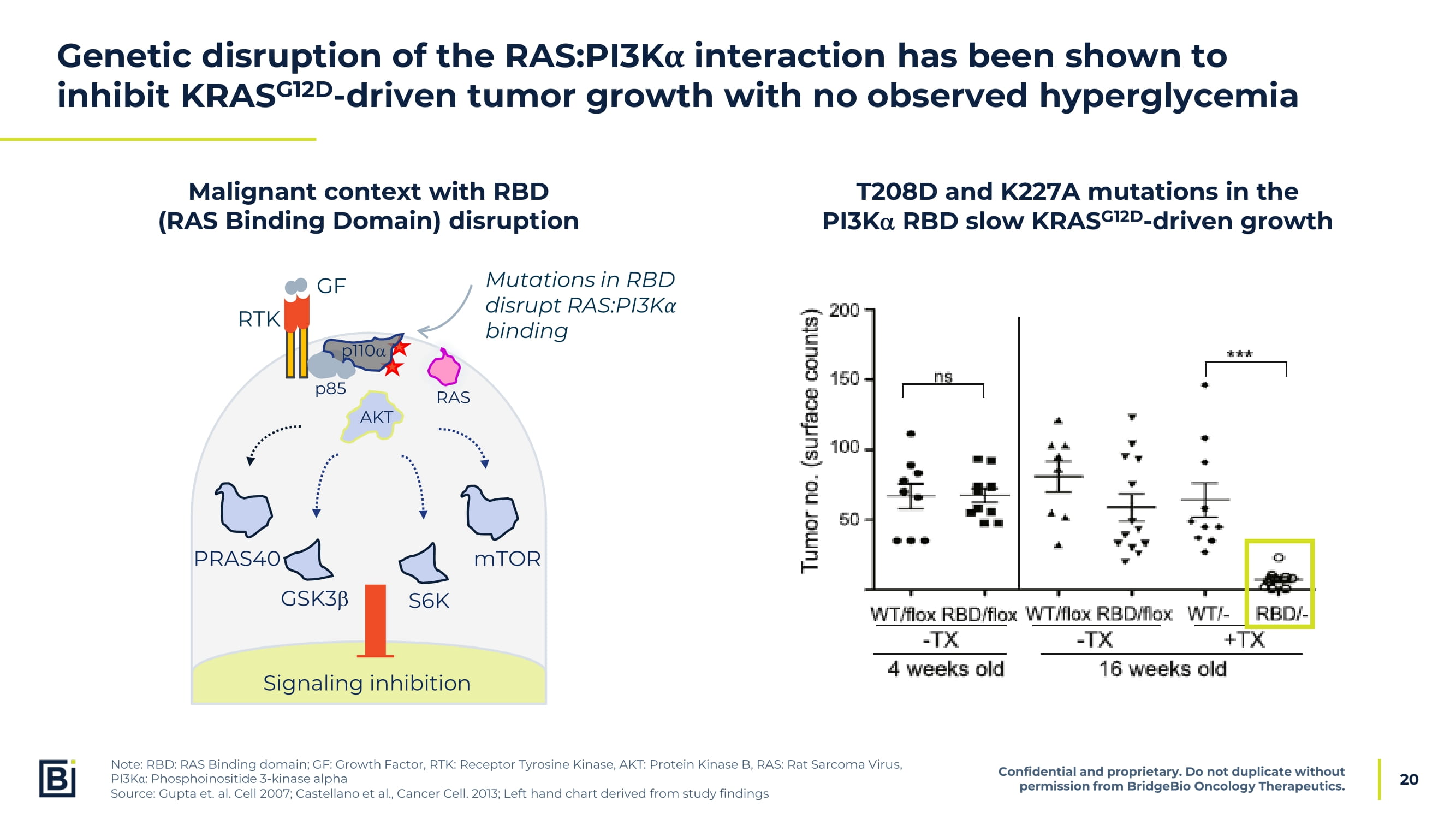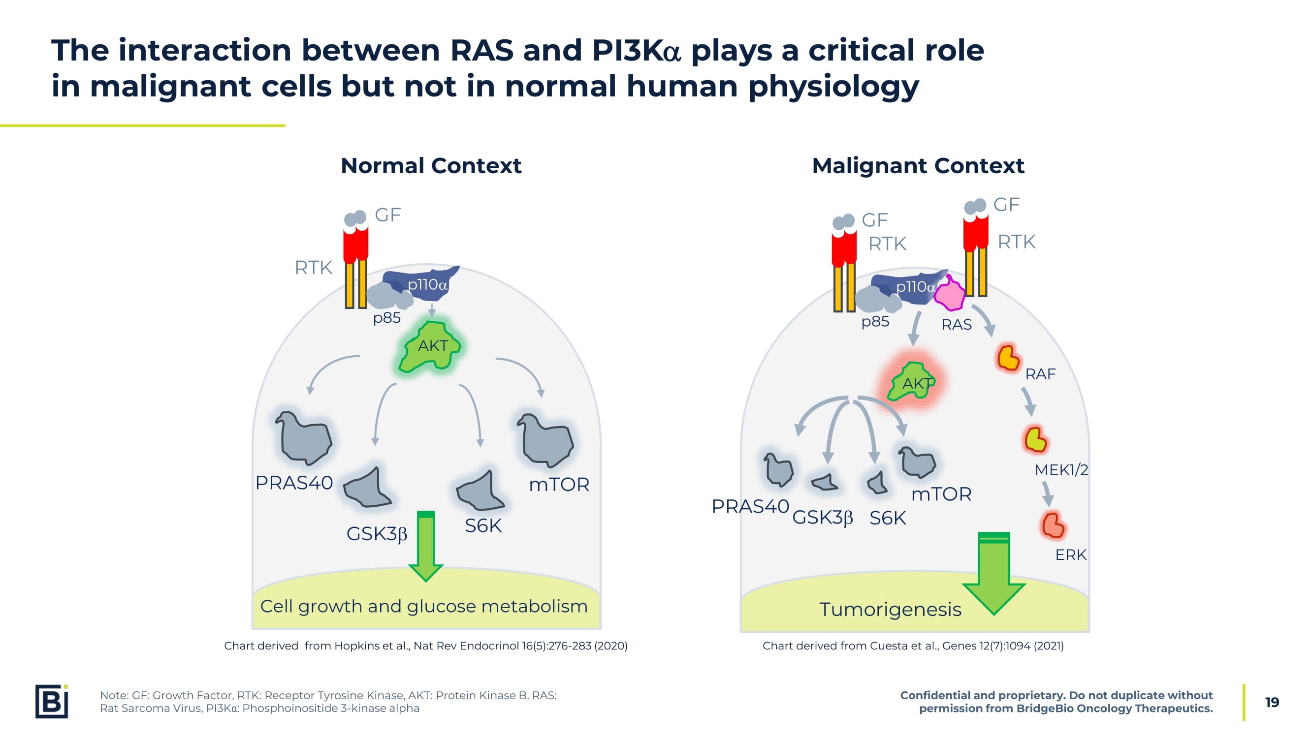 The interaction between RAS and PI3K plays a critical role in malignant cells but not in normal human physiology Note: GF: Growth Factor, RTK: Receptor Tyrosine Kinase, AKT: Protein Kinase B, RAS: Rat Sarcoma Virus, PI3K α : Phosphoinositide 3 - kinase alpha 19 Normal Context Malignant Context Cell growth and glucose metabolism p85 AKT mTOR PRAS40 S6K RTK GF GSK3 p110 Tumorigenesis p85 RAS AKT mTOR PRAS40 S6K RTK GF RAF MEK1/2 ERK RTK GF GSK3 p110 Confidential and proprietary. Do not duplicate without permission from BridgeBio Oncology Therapeutics. Chart derived from Hopkins et al., Nat Rev Endocrinol 16(5):276 - 283 (2020) . Chart derived from Cuesta et al., Genes 12(7):1094 (2021)