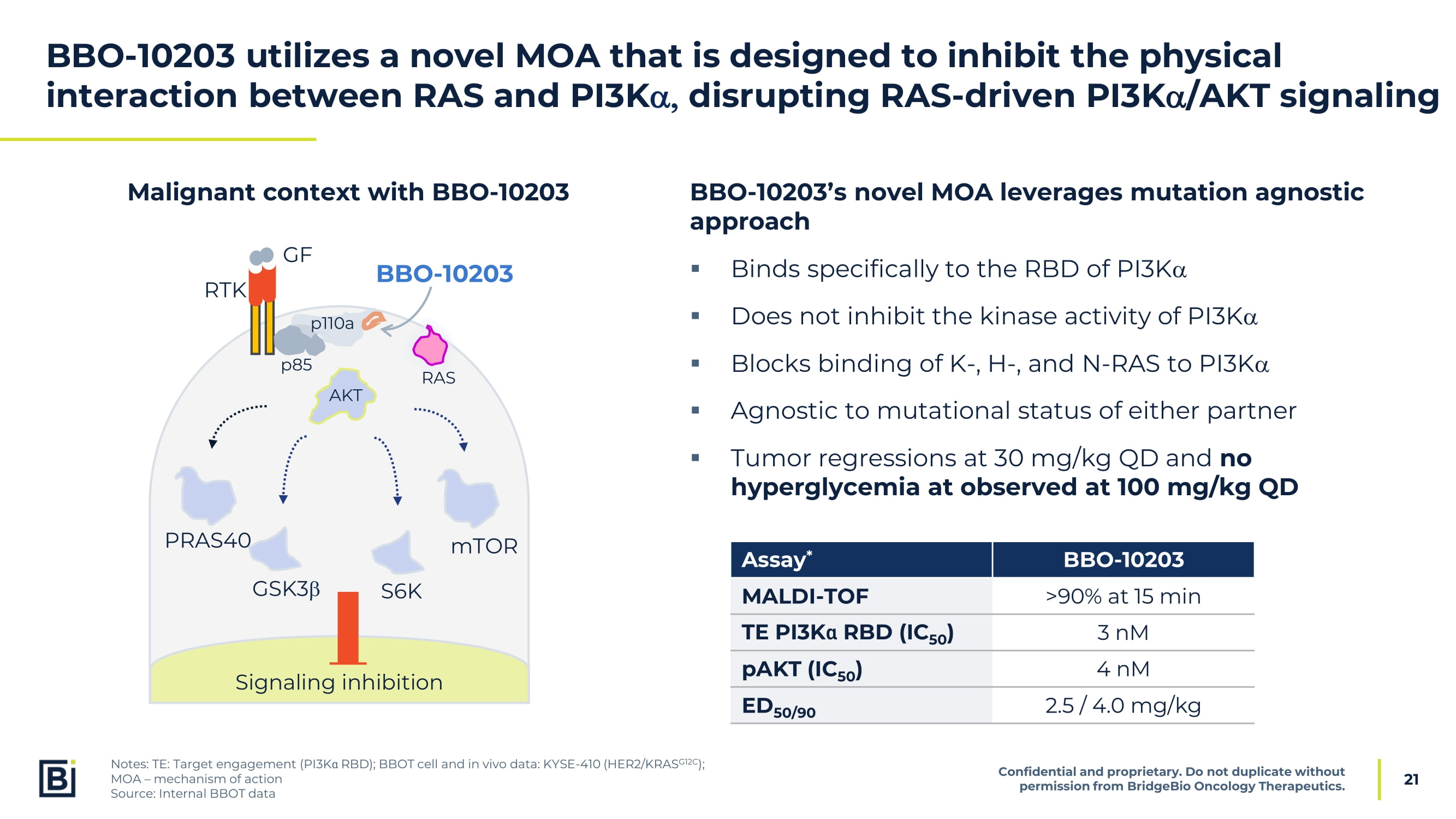 Genetic disruption of the RAS:PI3K α interaction has been shown to inhibit KRAS G12D - driven tumor growth with no observed hyperglycemia Note: RBD: RAS Binding domain; GF: Growth Factor, RTK: Receptor Tyrosine Kinase, AKT: Protein Kinase B, RAS: Rat Sarcoma Viru s, PI3K α : Phosphoinositide 3 - kinase alpha Source: Gupta et. al. Cell 2007; Castellano et al., Cancer Cell. 2013; Left hand chart derived from study findings 20 Malignant context with RBD (RAS Binding Domain) disruption Signaling inhibition p85 RAS AKT mTOR PRAS40 GSK3 S6K Mutations in RBD disrupt RAS:PI3K α binding RTK GF p110 T208D and K227A mutations in the PI3K RBD slow KRAS G12D - driven growth Confidential and proprietary. Do not duplicate without permission from BridgeBio Oncology Therapeutics.