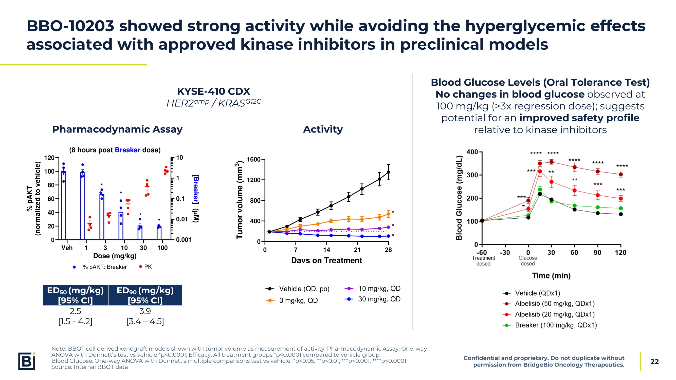 BBO - 10203 utilizes a novel MOA that is designed to inhibit the physical interaction between RAS and PI3K disrupting RAS - driven PI3K /AKT signaling Notes: TE: Target engagement (PI3K α RBD); BBOT cell and in vivo data: KYSE - 410 (HER2/KRAS G12C ); MOA – mechanism of action Source: Internal BBOT data 21 Malignant context with BBO - 10203 Signaling inhibition p85 p110a RAS AKT mTOR PRAS40 GSK3 S6K BBO - 10203 RTK GF BBO - 10203’s novel MOA leverages mutation agnostic approach ▪ Binds specifically to the RBD of PI3K ▪ Does not inhibit the kinase activity of PI3K ▪ Blocks binding of K - , H - , and N - RAS to PI3K ▪ Agnostic to mutational status of either partner ▪ Tumor regressions at 30 mg/kg QD and no hyperglycemia at observed at 100 mg/kg QD BBO - 10203 Assay * >90% at 15 min MALDI - TOF 3 nM TE PI3K α RBD (IC 50 ) 4 nM pAKT (IC 50 ) 2.5 / 4.0 mg/kg ED 50/90 Confidential and proprietary. Do not duplicate without permission from BridgeBio Oncology Therapeutics.