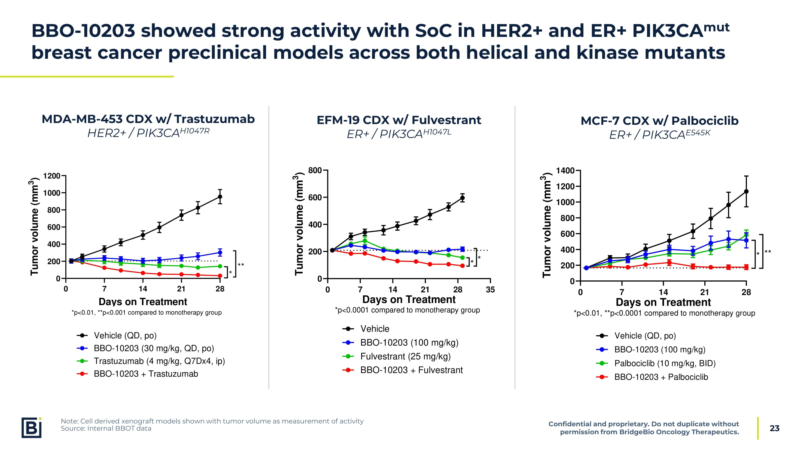 BBO - 10203 showed strong activity while avoiding the hyperglycemic effects associated with approved kinase inhibitors in preclinical models 22 KYSE - 410 CDX HER2 amp / KRAS G12C ED 90 (mg/kg) [95% CI] ED 50 (mg/kg) [95% CI] 3.9 [3.4 – 4.5] 2.5 [1.5 - 4.2] Pharmacodynamic Assay Blood Glucose Levels (Oral Tolerance Test) No changes in blood glucose observed at 100 mg/kg (>3x regression dose); suggests potential for an improved safety profile relative to kinase inhibitors Veh 1 3 10 30 100 0 20 40 60 80 100 120 0.001 0.01 0.1 1 10 (8 hours postBreaker dose) Dose (mg/kg) % p A K T ( n o r m a l i z e d t o v e h i c l e ) [ B r e a k e r ] ( μ M ) % pAKT: Breaker PK One-way ANOVA with Dunnett's test vs vehicle *p<0.0001 * * * * 0 7 14 21 28 0 400 800 1200 1600 Days on Treatment T u m o r v o l u m e ( m m 3 ) Vehicle (QD, po) 10 mg/kg, QD 30 mg/kg, QD 3 mg/kg, QD All treatment groups *p<0.0001 compared to vehicle group * * * Note: BBOT cell derived xenograft models shown with tumor volume as measurement of activity; Pharmacodynamic Assay: One - way ANOVA with Dunnett’s test vs vehicle *p<0.0001; Efficacy: All treatment groups *p<0.0001 compared to vehicle group; Blood Glucose: One - way ANOVA with Dunnett’s multiple comparisons test vs vehicle: *p<0.05, **p<0.01, ***p<0.001, ****p<0.0001 Source: Internal BBOT data Confidential and proprietary. Do not duplicate without permission from BridgeBio Oncology Therapeutics.