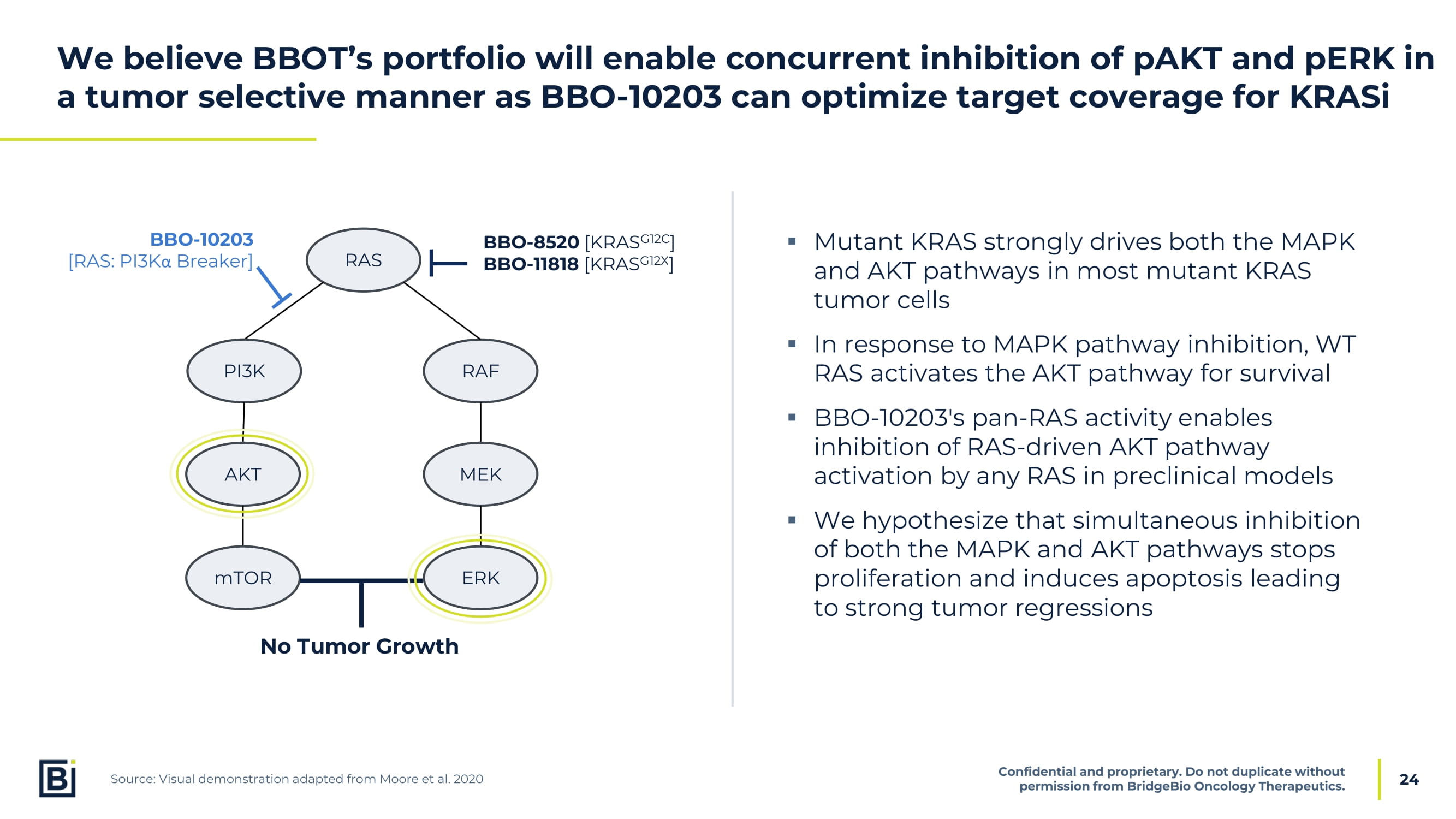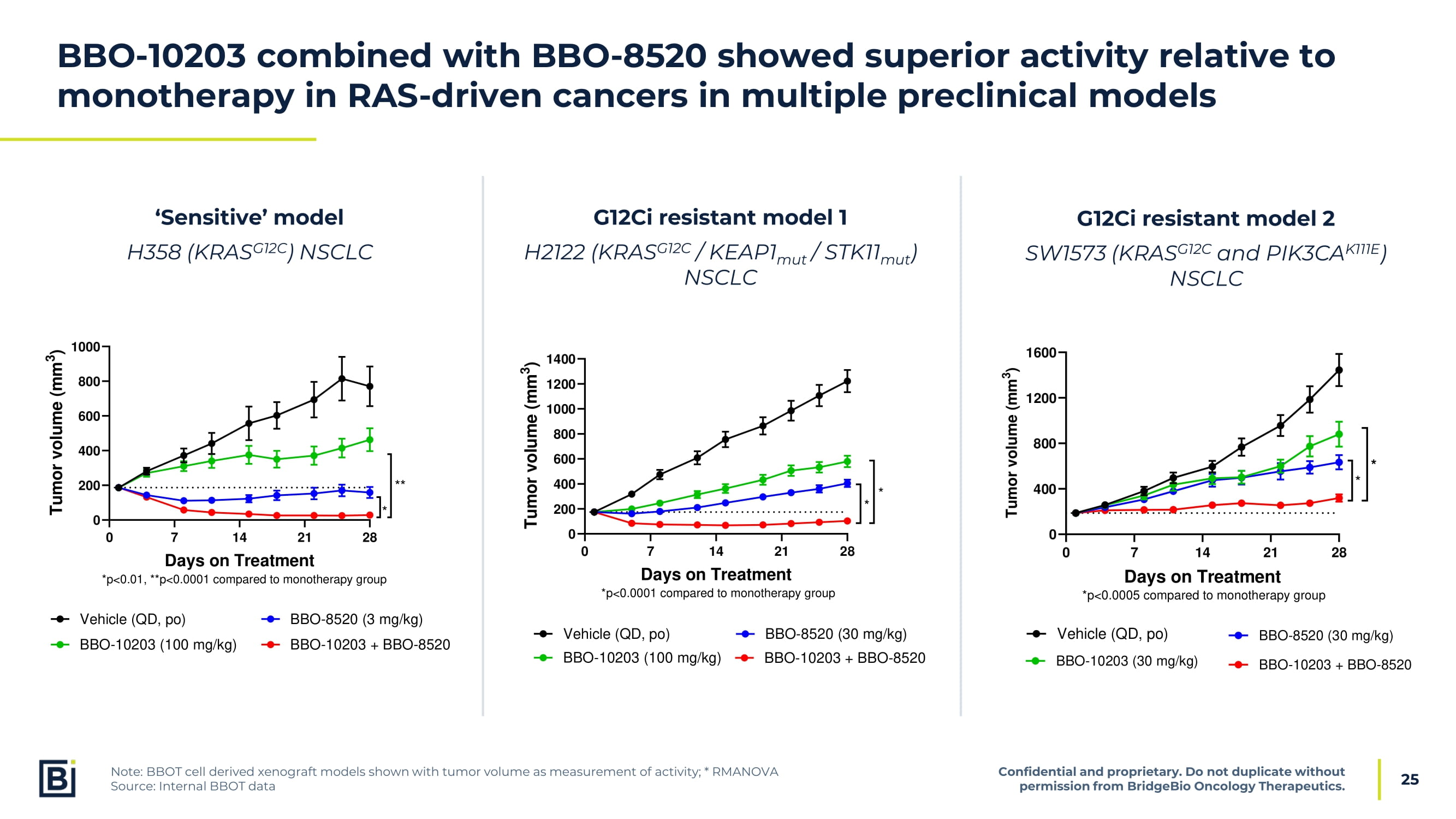 Note: Cell derived xenograft models shown with tumor volume as measurement of activity Source: Internal BBOT data We believe BBOT’s portfolio will enable concurrent inhibition of pAKT and pERK in a tumor selective manner as BBO - 10203 can optimize target coverage for KRASi ▪ Mutant KRAS strongly drives both the MAPK and AKT pathways in most mutant KRAS tumor cells ▪ In response to MAPK pathway inhibition, WT RAS activates the AKT pathway for survival ▪ BBO - 10203's pan - RAS activity enables inhibition of RAS - driven AKT pathway activation by any RAS in preclinical models ▪ We hypothesize that simultaneous inhibition of both the MAPK and AKT pathways stops proliferation and induces apoptosis leading to strong tumor regressions 24 BBO - 10203 [RAS: PI3K α Breaker] RAS PI3K AKT RAF MEK mTOR ERK No Tumor Growth BBO - 8520 [KRAS G12C ] BBO - 11818 [KRAS G12X ] Confidential and proprietary. Do not duplicate without permission from BridgeBio Oncology Therapeutics. Source: Visual demonstration adapted from Moore et al.