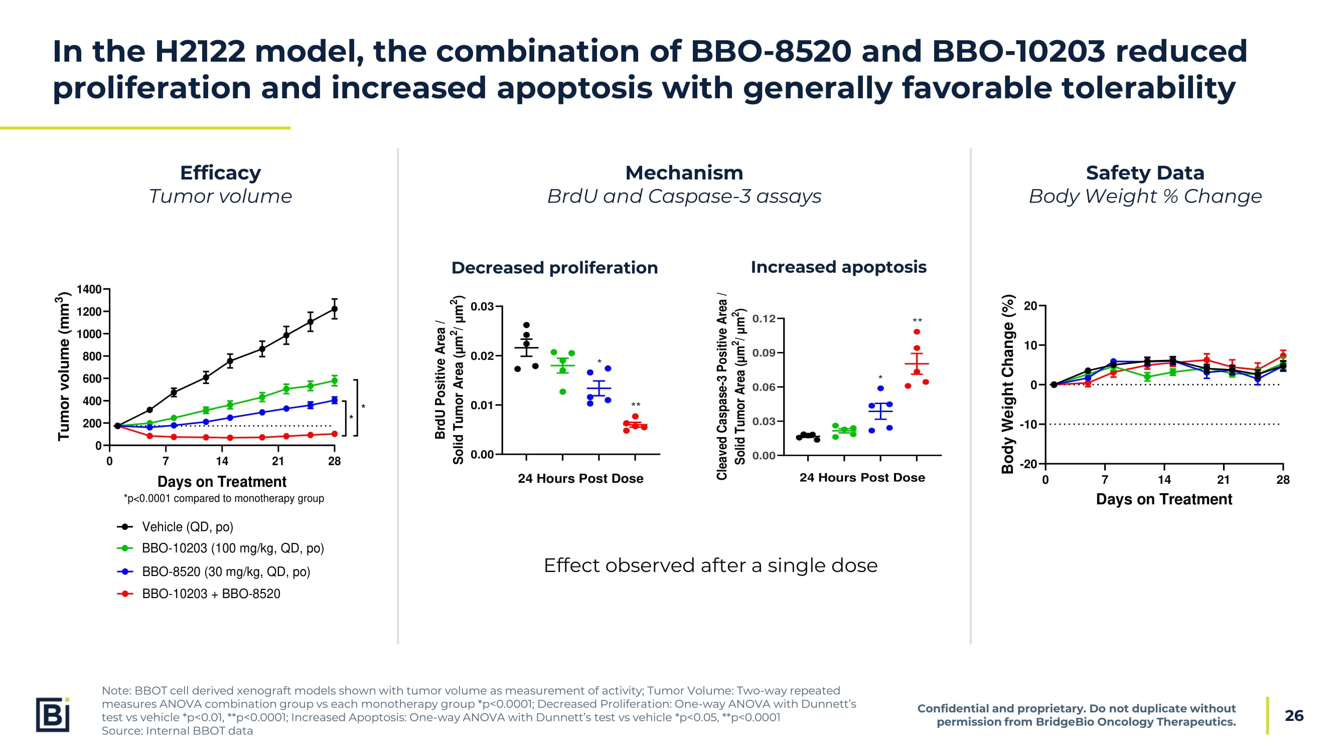 2020 BBO - 10203 combined with BBO - 8520 showed superior activity relative to monotherapy in RAS - driven cancers in multiple preclinical models 25 Note: BBOT cell derived xenograft models shown with tumor volume as measurement of activity; * RMANOVA Source: Internal BBOT data 0 7 14 21 28 0 200 400 600 800 1000 Days on Treatment T u m o r v o l u m e ( m m 3 ) Vehicle (QD, po) BBO-8520 (3 mg/kg) BBO-10203 (100 mg/kg) BBO-10203 + BBO-8520 *p<0.01, **p<0.0001 compared to monotherapy group ** * 0 7 14 21 28 0 200 400 600 800 1000 1200 1400 Days on Treatment T u m o r v o l u m e ( m m 3 ) Vehicle (QD, po) BBO-8520 (30 mg/kg) BBO-10203 (100 mg/kg) BBO-10203 + BBO-8520 * * *p<0.0001 compared to monotherapy group ‘Sensitive’ model H358 (KRAS G12C ) NSCLC G12Ci resistant model 1 H2122 (KRAS G12C / KEAP1 mut / STK11 mut ) NSCLC G12Ci resistant model 2 SW1573 (KRAS G12C and PIK3CA K111E ) NSCLC Confidential and proprietary. Do not duplicate without permission from BridgeBio Oncology Therapeutics.