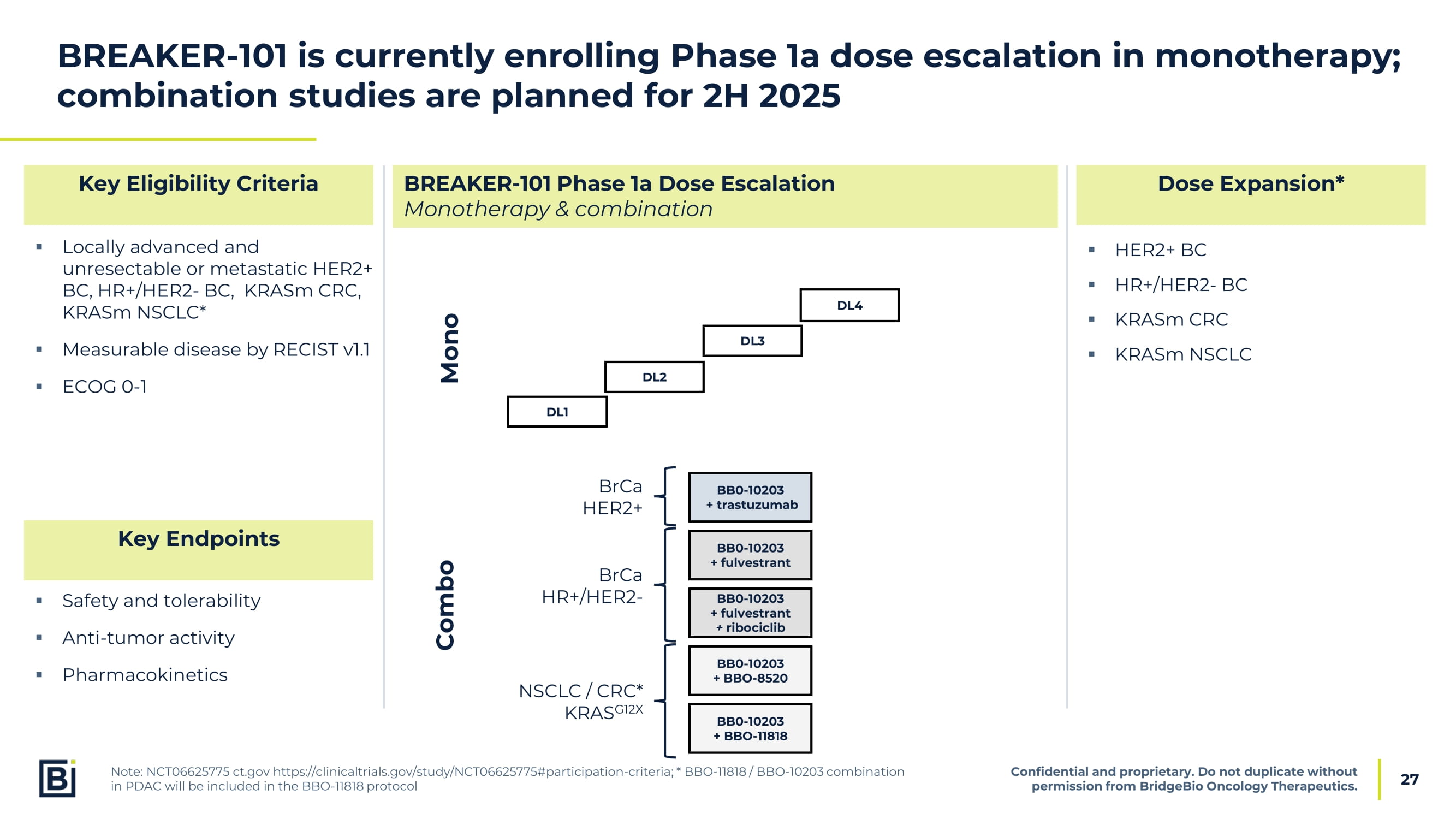 Safety Data Body Weight % Change In the H2122 model, the combination of BBO - 8520 and BBO - 10203 reduced proliferation and increased apoptosis with generally favorable tolerability Note: BBOT cell derived xenograft models shown with tumor volume as measurement of activity; Tumor Volume: Two - way repeated measures ANOVA combination group vs each monotherapy group *p<0.0001; Decreased Proliferation: One - way ANOVA with Dunnett’s test vs vehicle *p<0.01, **p<0.0001; Increased Apoptosis: One - way ANOVA with Dunnett’s test vs vehicle *p<0.05, **p<0.0001 Source: Internal BBOT data 26 0 7 14 21 28 0 200 400 600 800 1000 1200 1400 Days on Treatment T u m o r v o l u m e ( m m 3 ) Vehicle (QD, po) BBO-8520 (30 mg/kg, QD, po) BBO-10203 (100 mg/kg, QD, po) BBO-10203 + BBO-8520 * * *p<0.0001 compared to monotherapy group Decreased proliferation Increased apoptosis 0.00 0.01 0.02 0.03 24 Hours Post Dose B r d U P o s i t i v e A r e a / S o l i d T u m o r A r e a ( μ m 2 / μ m 2 ) ** * 0.00 0.03 0.06 0.09 0.12 24 Hours Post Dose C l e a v e d C a s p a s e - 3 P o s i t i v e A r e a / S o l i d T u m o r A r e a ( μ m 2 / μ m 2 ) * ** Efficacy Tumor volume Mechanism BrdU and Caspase - 3 assays Confidential and proprietary. Do not duplicate without permission from BridgeBio Oncology Therapeutics. Effect observed after a single dose BREAKER - 101 is currently enrolling Phase 1a dose escalation in monotherapy; combination studies are planned for 2H 2025 27 BREAKER - 101 Phase 1a Dose Escalation Monotherapy & combination Confidential and proprietary.