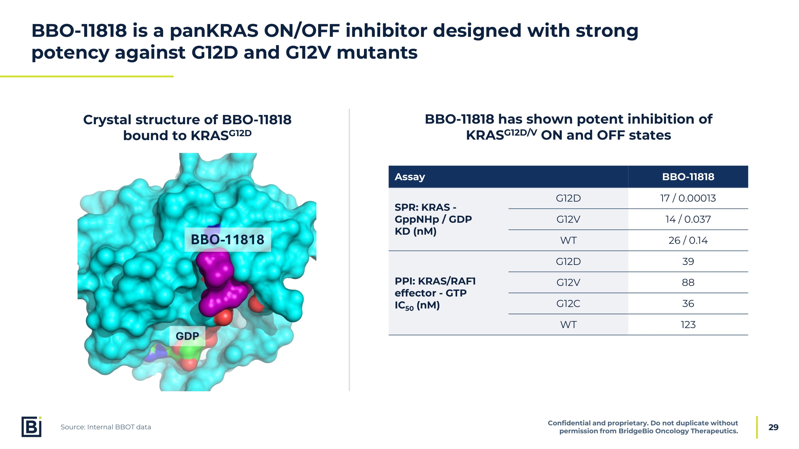 Do not duplicate without permission from BridgeBio Oncology Therapeutics. Mono Combo DL4 DL2 DL3 DL1 BB0 - 10203 + trastuzumab BB0 - 10203 + fulvestrant + ribociclib Key Eligibility Criteria Dose Expansion* Key Endpoints ▪ Safety and tolerability ▪ Anti - tumor activity ▪ Pharmacokinetics ▪ HER2+ BC ▪ HR+/HER2 - BC ▪ KRASm CRC ▪ KRASm NSCLC ▪ Locally advanced and unresectable or metastatic HER2+ BC, HR+/HER2 - BC, KRASm CRC, KRASm NSCLC* ▪ Measurable disease by RECIST v1.1 ▪ ECOG 0 - 1 BB0 - 10203 + fulvestrant BB0 - 10203 + BBO - 8520 BB0 - 10203 + BBO - 11818 BrCa HER2+ BrCa HR+/HER2 - NSCLC / CRC* KRAS G12X Note: NCT06625775 ct.gov https://clinicaltrials.gov/study/NCT06625775#participation - criteria; * BBO - 11818 / BBO - 10203 combinatio n in PDAC will be included in the BBO - 11818 protocol BBO - 11818 28 Dual panKRAS ON and OFF inhibitor