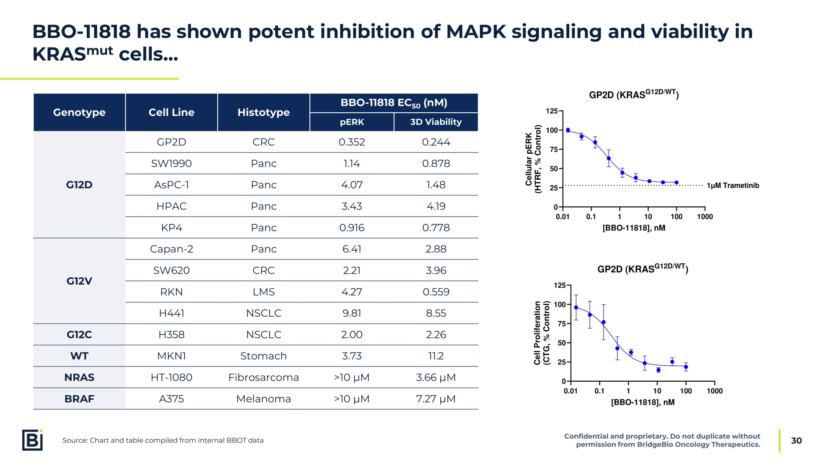 BBO - 11818 is a panKRAS ON/OFF inhibitor designed with strong potency against G12D and G12V mutants 29 Crystal structure of BBO - 11818 bound to KRAS G12D BBO - 11818 Assay 17 / 0.00013 G12D SPR: KRAS - GppNHp / GDP KD ( nM ) 14 / 0.037 G12V 26 / 0.14 WT 39 G12D PPI: KRAS/RAF1 effector - GTP IC 50 ( nM ) 88 G12V 36 G12C 123 WT BBO - 11818 has shown potent inhibition of KRAS G12D/V ON and OFF states BBO - 11818 GDP Confidential and proprietary. Do not duplicate without permission from BridgeBio Oncology Therapeutics.