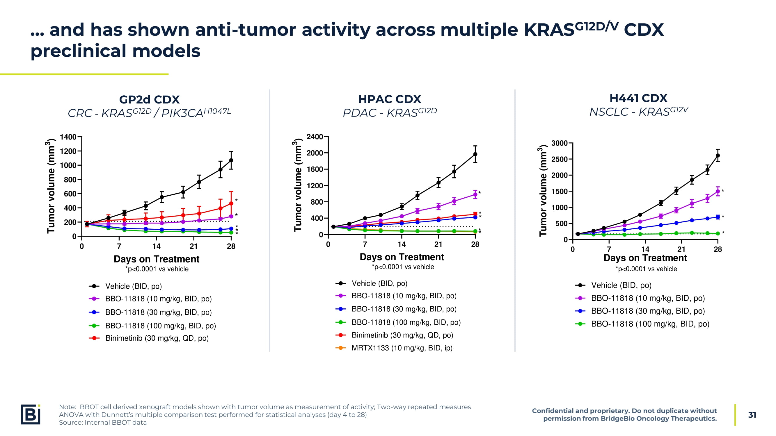 Source: Internal BBOT data BBO - 11818 has shown potent inhibition of MAPK signaling and viability in KRAS mut cells… 30 BBO - 11818 EC 50 (nM) Histotype Cell Line Genotype 3D Viability pERK 0.244 0.352 CRC GP2D G12D 0.878 1.14 Panc SW1990 1.48 4.07 Panc AsPC - 1 4.19 3.43 Panc HPAC 0.778 0.916 Panc KP4 2.88 6.41 Panc Capan - 2 G12V 3.96 2.21 CRC SW620 0.559 4.27 LMS RKN 8.55 9.81 NSCLC H441 2.26 2.00 NSCLC H358 G12C 11.2 3.73 Stomach MKN1 WT 3.66 µM >10 µM Fibrosarcoma HT - 1080 NRAS 7.27 µM >10 µM Melanoma A375 BRAF 0.01 0.1 1 10 100 1000 0 25 50 75 100 125 GP2D (KRAS G12D/WT ) [BBO-11818], nM C e l l u l a r p E R K ( H T R F , % C o n t r o l ) 1μM Trametinib Confidential and proprietary. Do not duplicate without permission from BridgeBio Oncology Therapeutics.