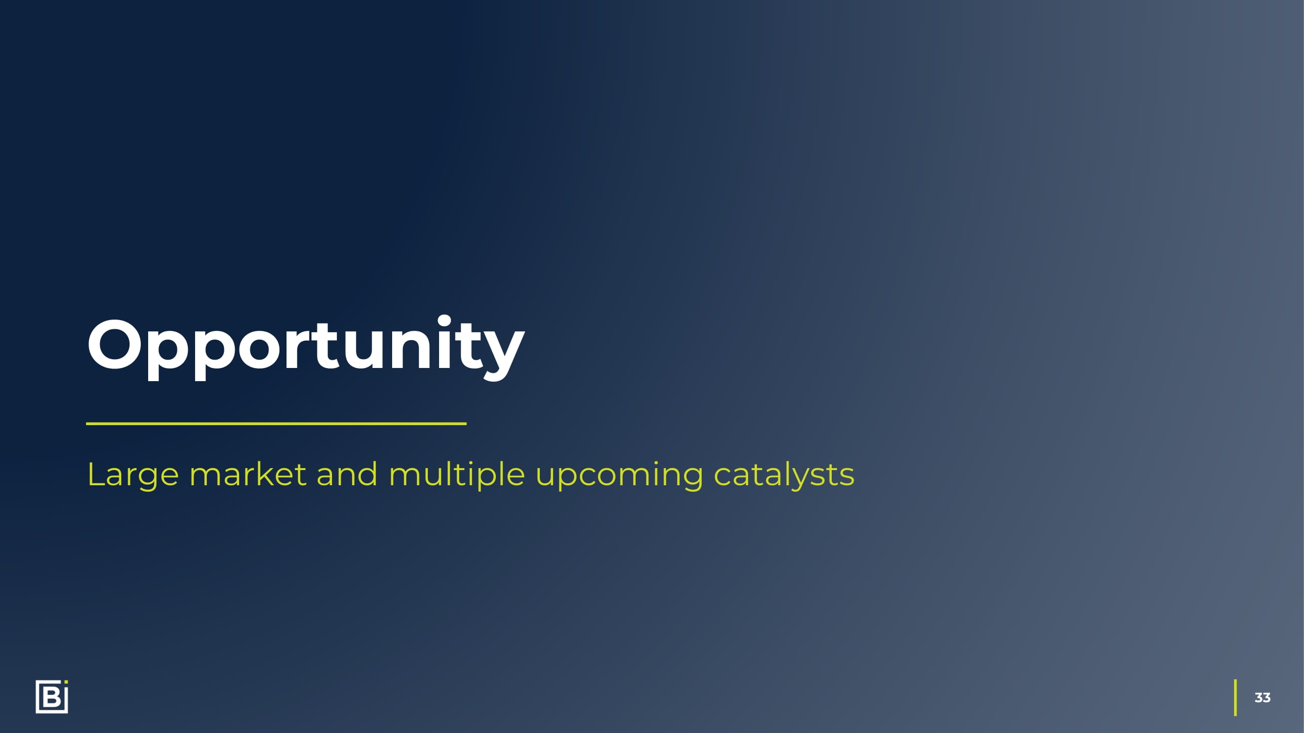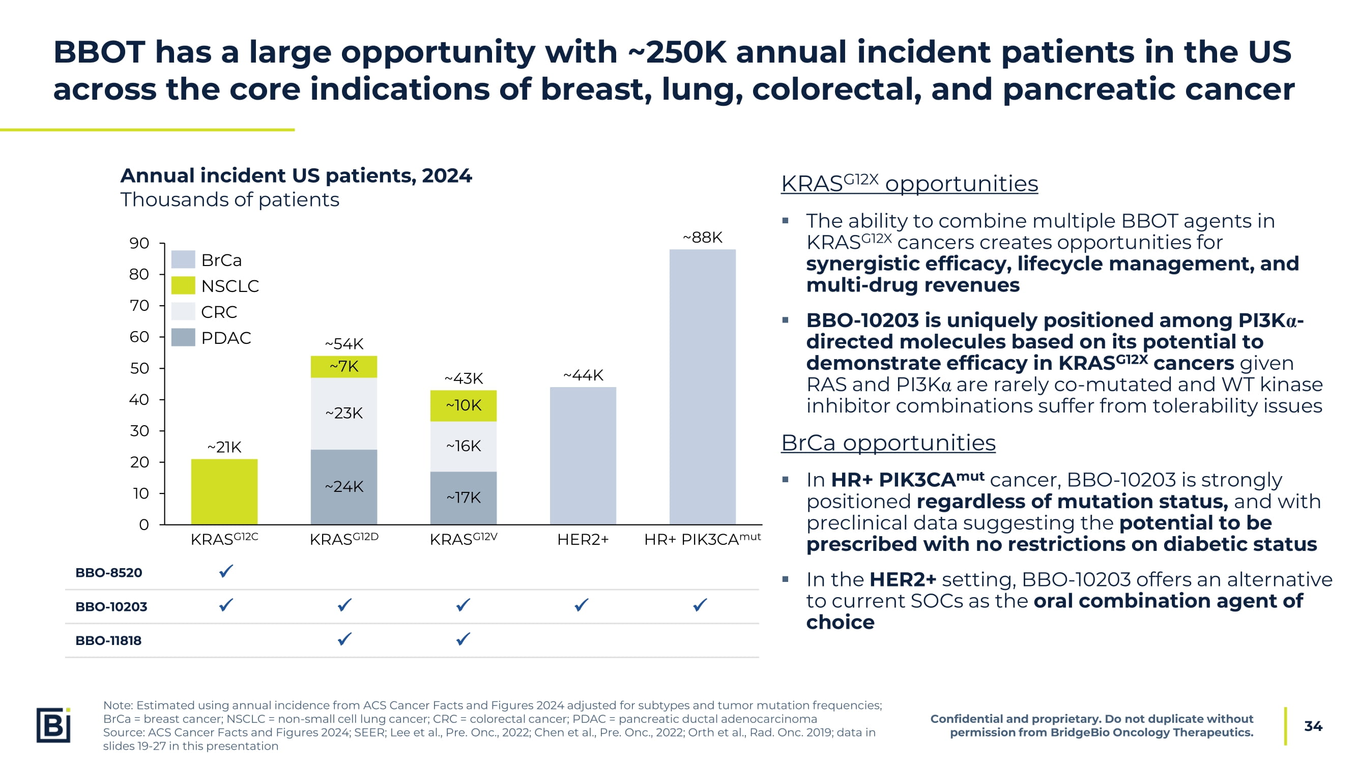 Note: BBOT cell derived xenograft models shown with tumor volume as measurement of activity; Two - way repeated measures ANOVA with Dunnett’s multiple comparison test performed for statistical analyses (day 4 to 28) Source: Internal BBOT data Safety Data Body Weight % Change BBO - 11818 in combination with BBO - 10203 showed tumor regression driven by decreased proliferation and increased apoptosis in preclinical models 32 Increased apoptosis Capan - 2 (G12V) Efficacy Tumor volume Mechanism BrdU and Caspase - 3 assays 0 7 14 21 28 0 200 400 600 800 Days on Treatment T u m o r v o l u m e ( m m 3 ) Vehicle (QD, po) BBO-10203 (100 mg/kg) BBO-11818 (100 mg/kg, BID) BBO-10203 + BBO-11818 * * 0.000 0.004 0.008 0.012 0.016 B r d U p o s i t i v e a r e a / s o l i d t u m o r a r e a ( μ m ^ 2 / μ m ^ 2 ) * ** ** 24 hours Decreased proliferation 0.000 0.002 0.004 0.006 0.008 0.010 0.012 C l e a v e d C a s p a s e - 3 p o s i t i v e a r e a / s o l i d t u m o r a r e a ( μ m 2 / μ m 2 ) ** * ** 24 hours Confidential and proprietary. Do not duplicate without permission from BridgeBio Oncology Therapeutics. Note: BBOT cell derived xenograft models shown with tumor volume as measurement of activity; Tumor Volume: Two - way repeated measures ANOVA combination group vs each monotherapy group *p<0.0001. Decreased Proliferation: One - way ANOVA with Dunnett’s test vs vehicle *p<0.01, **p<0.0001. Increased Apoptosis: One - way ANOVA with Dunnett’s test vs vehicle *p<0.05, **p<0.0001 Source: Internal BBOT data Effect observed after a single dose Opportunity 33 Large market and multiple upcoming catalysts
