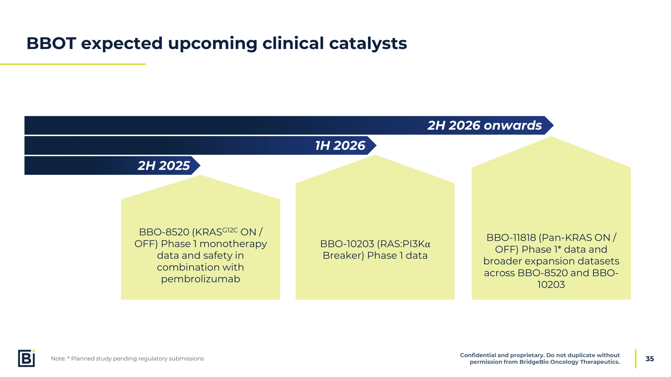 BBOT has a large opportunity with ~250K annual incident patients in the US across the core indications of breast, lung, colorectal, and pancreatic cancer KRAS G12X opportunities ▪ The ability to combine multiple BBOT agents in KRAS G12X cancers creates opportunities for synergistic efficacy, lifecycle management, and multi - drug revenues ▪ BBO - 10203 is uniquely positioned among PI3K α - directed molecules based on its potential to demonstrate efficacy in KRAS G12X cancers given RAS and PI3K α are rarely co - mutated and WT kinase inhibitor combinations suffer from tolerability issues BrCa opportunities ▪ In HR+ PIK3CA mut cancer, BBO - 10203 is strongly positioned regardless of mutation status, and with preclinical data suggesting the potential to be prescribed with no restrictions on diabetic status ▪ In the HER2+ setting, BBO - 10203 offers an alternative to current SOCs as the oral combination agent of choice 34 Note: Estimated using annual incidence from ACS Cancer Facts and Figures 2024 adjusted for subtypes and tumor mutation freque nci es; BrCa = breast cancer; NSCLC = non - small cell lung cancer; CRC = colorectal cancer; PDAC = pancreatic ductal adenocarcinoma Source: ACS Cancer Facts and Figures 2024; SEER; Lee et al., Pre. Onc ., 2022; Chen et al., Pre. Onc ., 2022; Orth et al., Rad. Onc . 2019; data in slides 19 - 27 in this presentation 20 30 40 50 60 70 80 0 10 90 ~7K ~23K ~24K KRAS G12D ~10K ~16K ~17K KRAS G12V HER2+ HR+ PIK3CA mut ~21K ~54K ~43K ~44K ~88K KRAS G12C Annual incident US patients, 2024 Thousands of patients BrCa NSCLC CRC PDAC x BBO - 8520 x x x x x BBO - 10203 x x BBO - 11818 Confidential and proprietary. Do not duplicate without permission from BridgeBio Oncology Therapeutics.