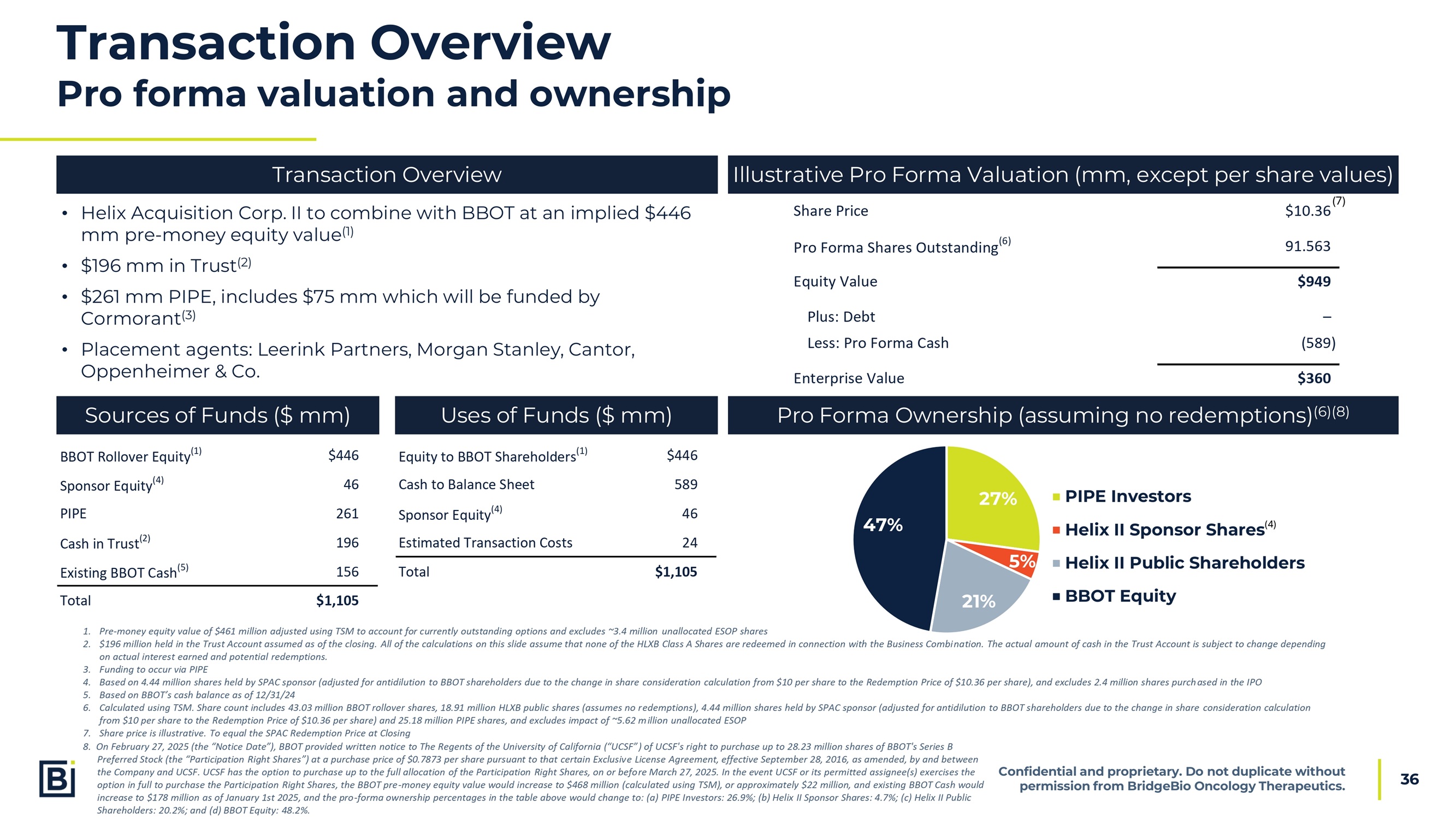 Do not duplicate without permission from BridgeBio Oncology Therapeutics. • Helix Acquisition Corp. II to combine with BBOT at an implied $446 mm pre - money equity value (1) • $196 mm in Trust (2) • $261 mm PIPE, includes $75 mm which will be funded by Cormorant (3) • Placement agents: Leerink Partners, Morgan Stanley, Cantor, Oppenheimer & Co. Transaction Overview Illustrative Pro Forma Valuation (mm, except per share values) Sources of Funds ($ mm) Pro Forma Ownership (assuming no redemptions) (6)(8) Uses of Funds ($ mm) (4) (7) 27% 5% 21% 47% PIPE Investors Helix II Sponsor Shares Helix II Public Shareholders BBOT Equity 1. Pre - money equity value of $461 million adjusted using TSM to account for currently outstanding options and excludes ~3.4 million unallocated ESOP shares 2. $196 million held in the Trust Account as of December 31, 2024. All of the calculations on this slide assume that none of the HL XB Class A Shares are redeemed in connection with the Business Combination. The actual amount of cash in the Trust Account is su bject to change depending on actual interest earned and potential redemptions. 3. Funding to occur via PIPE or by purchasing HLXB shares in the open market from HLXB shareholders who have not entered into no n - r edemption agreements and agreeing not to redeem those shares 4. Based on 4.44 million shares held by SPAC sponsor (adjusted for antidilution to BBOT shareholders due to the change in share con sideration calculation from $10 per share to the Redemption Price of $10.36 per share), and excludes 2.4 million shares purch ase d in the IPO 5. Based on BBOT’s cash balance as of 12/31/24 6. Calculated using TSM. Share count includes 43.03 million BBOT rollover shares, 18.91 million HLXB public shares (assumes no r ede mptions), 4.44 million shares held by SPAC sponsor (adjusted for antidilution to BBOT shareholders due to the change in share co nsideration calculation from $10 per share to the Redemption Price of $10.36 per share) and 25.18 million PIPE shares, and excludes impact of ~5.62 m ill ion unallocated ESOP 7. Share price is illustrative. To equal the SPAC Redemption Price at Closing 8. On February 27, 2025 (the “Notice Date”), BBOT provided written notice to The Regents of the University of California (“UCSF” ) o f UCSF's right to purchase up to 28.23 million shares of BBOT's Series B Preferred Stock (the “Participation Right Shares”) at a purchase price of $0.7873 per share pursuant to that certain Exclusiv e L icense Agreement, effective September 28, 2016, as amended, by and between the Company and UCSF. UCSF has the option to purchase up to the full allocation of the Participation Right Shares, on or befo re March 27, 2025. In the event UCSF or its permitted assignee(s) exercises the option in full to purchase the Participation Right Shares, the BBOT pre - money equity value would increase to $468 million (calcu lated using TSM), or approximately $22 million, and existing BBOT Cash would increase to $178 million as of January 1st 2025, and the pro - forma ownership percentages in the table above would change to: (a) PIPE Investors: 26.9%; (b) Helix II Sponsor Shares: 4.7%; (c) Helix II Public Shareholders: 20.2%; and (d) BBOT Equity: 48.2%.