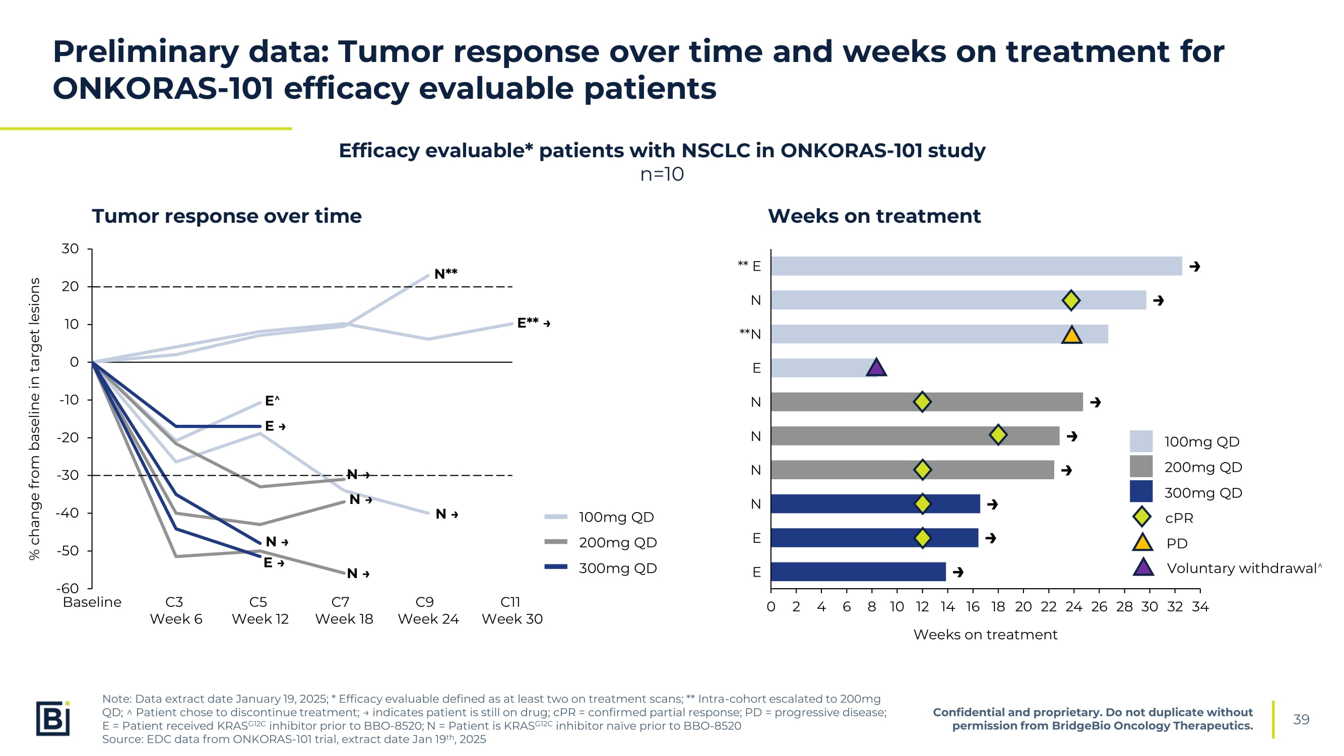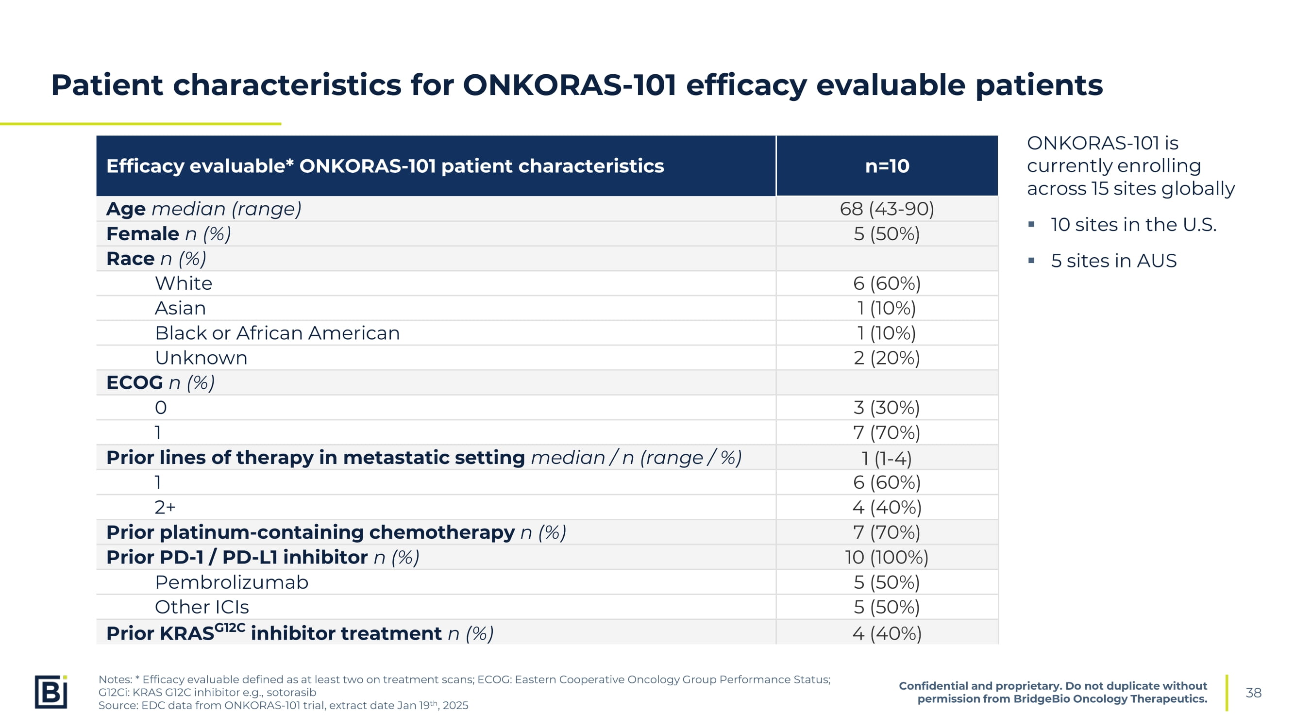 BBOT Rollover Equity (1) $446 Sponsor Equity (4) 46 PIPE 261 Cash in Trust (2) 196 Existing BBOT Cash (5) 156 Total $1,105 Equity to BBOT Shareholders (1) $446 Cash to Balance Sheet 589 Sponsor Equity (4) 46 Estimated Transaction Costs 24 Total $1,105 Share Price $10.36 Pro Forma Shares Outstanding (6) 91.563 Equity Value $949 Plus: Debt – Less: Pro Forma Cash (589) Enterprise Value $360 Patient characteristics for ONKORAS - 101 efficacy evaluable patients 38 n=10 Efficacy evaluable* ONKORAS - 101 patient characteristics 68 (43 - 90) Age median (range) 5 (50%) Female n (%) Race n (%) 6 (60%) White 1 (10%) Asian 1 (10%) Black or African American 2 (20%) Unknown ECOG n (%) 3 (30%) 0 7 (70%) 1 1 (1 - 4) Prior lines of therapy in metastatic setting median / n (range / %) 6 (60%) 1 4 (40%) 2+ 7 (70%) Prior platinum - containing chemotherapy n (%) 10 (100%) Prior PD - 1 / PD - L1 inhibitor n (%) 5 (50%) Pembrolizumab 5 (50%) Other ICIs 4 (40%) Prior KRAS G12C inhibitor treatment n (%) Confidential and proprietary. Do not duplicate without permission from BridgeBio Oncology Therapeutics. Notes: * Efficacy evaluable defined as at least two on treatment scans; ECOG: Eastern Cooperative Oncology Group Performance Sta tus; G12Ci: KRAS G12C inhibitor e.g., sotorasib Source: EDC data from ONKORAS - 101 trial, extract date Jan 19 th , 2025 ONKORAS - 101 is currently enrolling across 15 sites globally ▪ 10 sites in the U.S. ▪ 5 sites in AUS Preliminary data: Tumor response over time and weeks on treatment for ONKORAS - 101 efficacy evaluable patients 39 Confidential and proprietary.