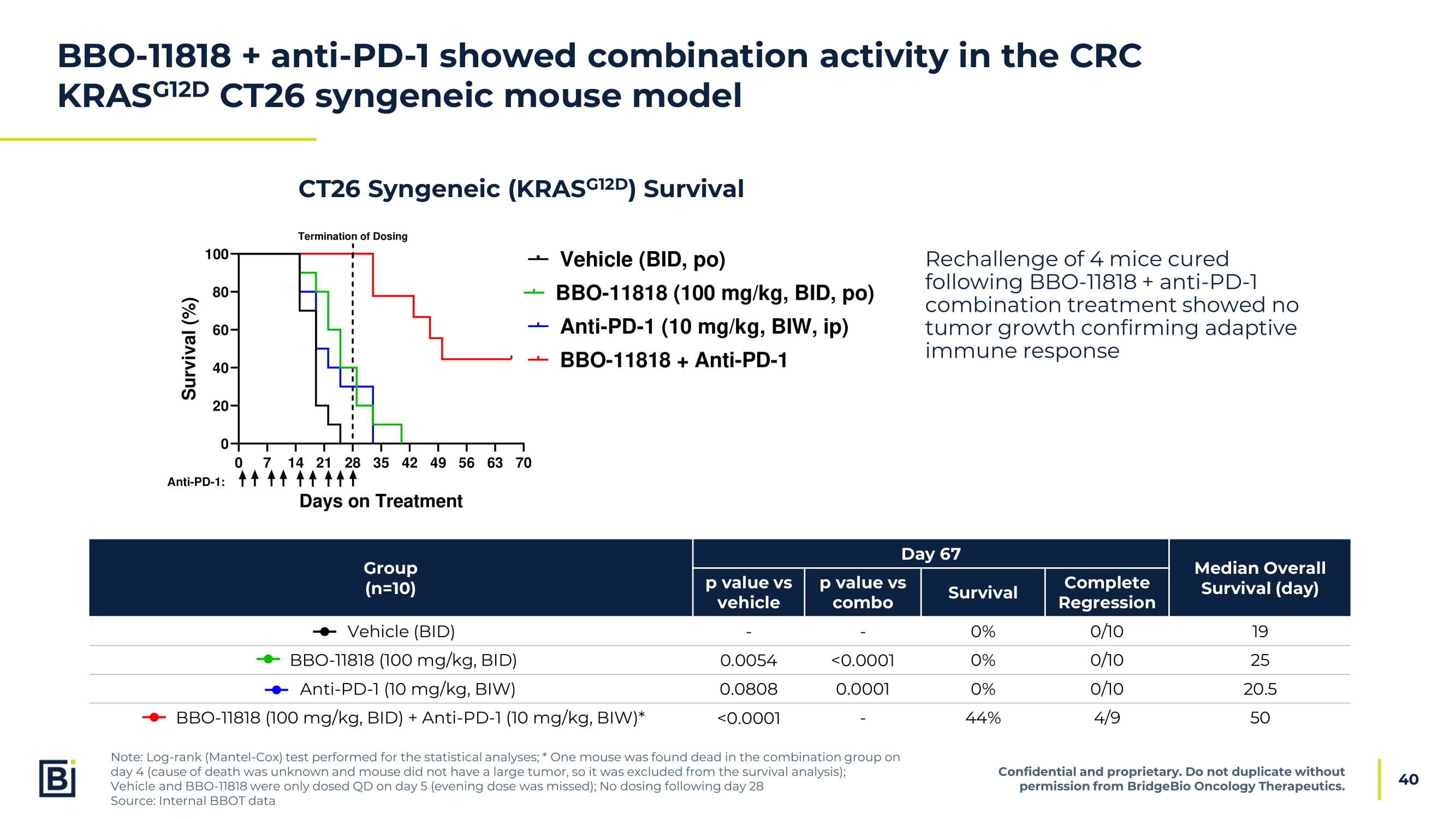 Do not duplicate without permission from BridgeBio Oncology Therapeutics. Note: Data extract date January 19, 2025; * Efficacy evaluable defined as at least two on treatment scans; ** Intra - cohort escal ated to 200mg QD; ^ Patient chose to discontinue treatment; → indicates patient is still on drug; cPR = confirmed partial response; PD = progressive disease; E = Patient received KRAS G12C inhibitor prior to BBO - 8520; N = Patient is KRAS G12C inhibitor naïve prior to BBO - 8520 Source: EDC data from ONKORAS - 101 trial, extract date Jan 19 th , 2025 100mg QD 200mg QD 300mg QD Efficacy evaluable* patients with NSCLC in ONKORAS - 101 study n=10 0 2 4 6 8 10 12 14 16 18 20 22 24 26 28 30 32 34 Weeks on treatment ** E N **N E N N N N E E → → → → → → → → Tumor response over time Weeks on treatment -60 -50 -40 -30 -20 -10 0 10 20 30 % change from baseline in target lesions Baseline C3 Week 6 C5 Week 12 C7 Week 18 C9 Week 24 C11 Week 30 N ** E** → E ^ E → N → E → N → N → N → N → 100mg QD 200mg QD 300mg QD cPR PD Voluntary withdrawal ^ BBO - 11818 + anti - PD - 1 showed combination activity in the CRC KRAS G12D CT26 syngeneic mouse model 40 Median Overall Survival (day) Day 67 Group (n=10) Complete Regression Survival p value vs combo p value vs vehicle 19 0/10 0% - - Vehicle (BID) 25 0/10 0% <0.0001 0.0054 BBO - 11818 (100 mg/kg, BID) 20.5 0/10 0% 0.0001 0.0808 Anti - PD - 1 (10 mg/kg, BIW) 50 4/9 44% - <0.0001 BBO - 11818 (100 mg/kg, BID) + Anti - PD - 1 (10 mg/kg, BIW)* CT26 Syngeneic (KRAS G12D ) Survival 0 7 14 21 28 35 42 49 56 63 70 0 20 40 60 80 100 Days on Treatment S u r v i v a l ( % ) Vehicle (BID, po) Anti-PD-1 (10 mg/kg, BIW, ip) BBO-11818 (100 mg/kg, BID, po) BBO-11818 + Anti-PD-1 Anti-PD-1: Termination of Dosing Confidential and proprietary.