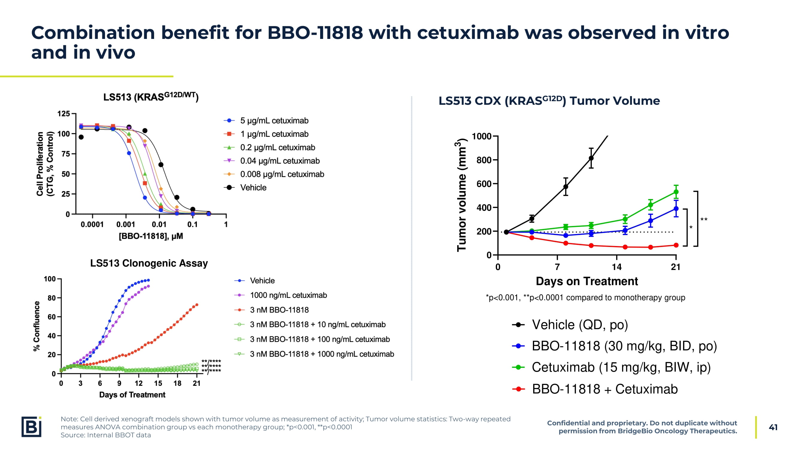 Do not duplicate without permission from BridgeBio Oncology Therapeutics. Note: Log - rank (Mantel - Cox) test performed for the statistical analyses; * One mouse was found dead in the combination group on day 4 (cause of death was unknown and mouse did not have a large tumor, so it was excluded from the survival analysis); Vehicle and BBO - 11818 were only dosed QD on day 5 (evening dose was missed); No dosing following day 28 Source: Internal BBOT data Rechallenge of 4 mice cured following BBO - 11818 + anti - PD - 1 combination treatment showed no tumor growth confirming adaptive immune response Combination benefit for BBO - 11818 with cetuximab was observed in vitro and in vivo 41 LS513 CDX (KRAS G12D ) Tumor Volume Confidential and proprietary.