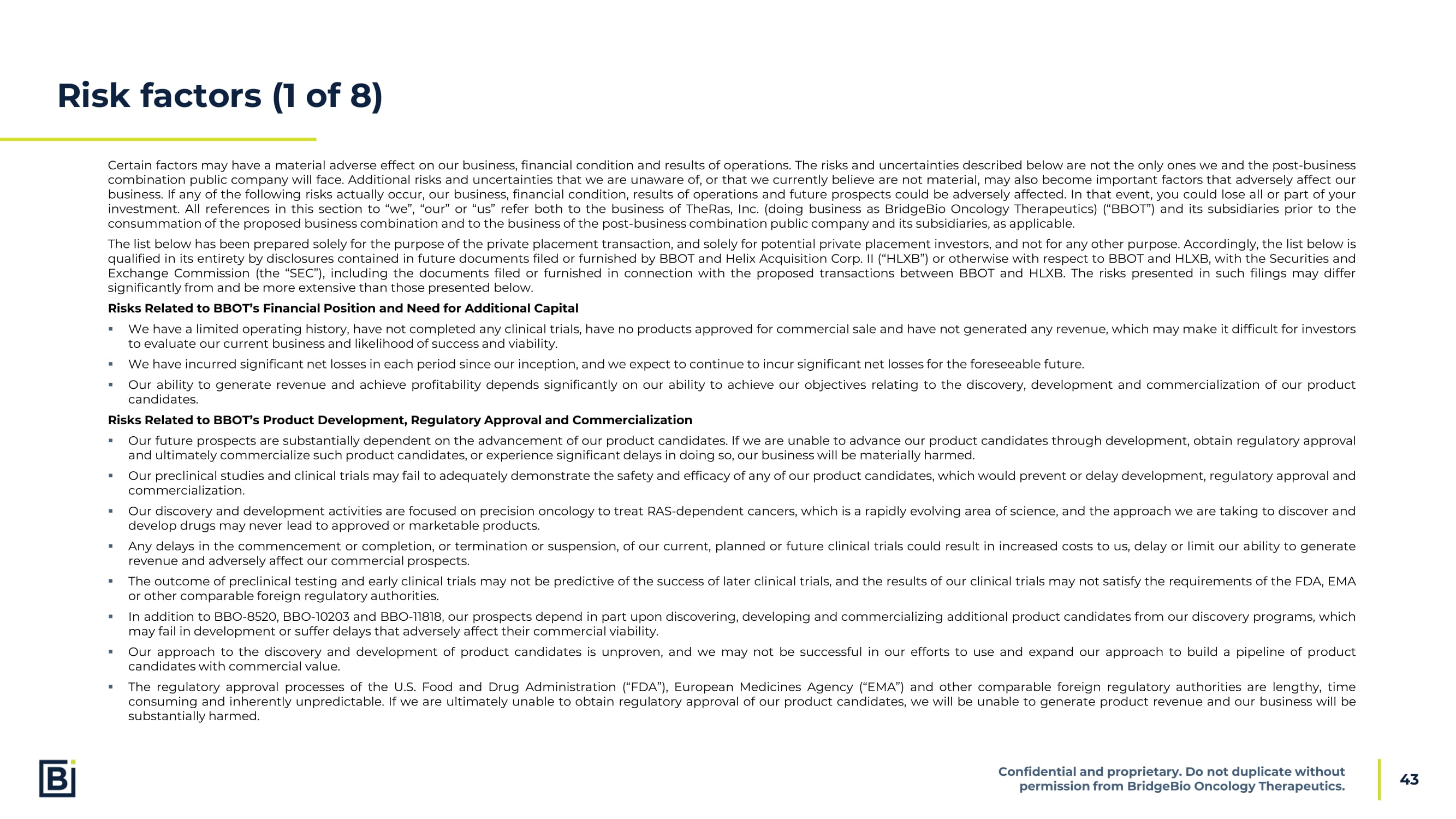 Do not duplicate without permission from BridgeBio Oncology Therapeutics. Certain factors may have a material adverse effect on our business, financial condition and results of operations . The risks and uncertainties described below are not the only ones we and the post - business combination public company will face . Additional risks and uncertainties that we are unaware of, or that we currently believe are not material, may also become important factors that adversely affect our business . If any of the following risks actually occur, our business, financial condition, results of operations and future prospects could be adversely affected . In that event, you could lose all or part of your investment . All references in this section to “we”, “our” or “us” refer both to the business of TheRas , Inc . (doing business as BridgeBio Oncology Therapeutics) (“BBOT”) and its subsidiaries prior to the consummation of the proposed business combination and to the business of the post - business combination public company and its subsidiaries, as applicable . The list below has been prepared solely for the purpose of the private placement transaction, and solely for potential private placement investors, and not for any other purpose . Accordingly, the list below is qualified in its entirety by disclosures contained in future documents filed or furnished by BBOT and Helix Acquisition Corp . II (“HLXB”) or otherwise with respect to BBOT and HLXB, with the Securities and Exchange Commission (the “SEC”), including the documents filed or furnished in connection with the proposed transactions between BBOT and HLXB . The risks presented in such filings may differ significantly from and be more extensive than those presented below . Risks Related to BBOT’s Financial Position and Need for Additional Capital ▪ We have a limited operating history, have not completed any clinical trials, have no products approved for commercial sale and have not generated any revenue, which may make it difficult for investors to evaluate our current business and likelihood of success and viability . ▪ We have incurred significant net losses in each period since our inception, and we expect to continue to incur significant net losses for the foreseeable future . ▪ Our ability to generate revenue and achieve profitability depends significantly on our ability to achieve our objectives relating to the discovery, development and commercialization of our product candidates . Risks Related to BBOT’s Product Development, Regulatory Approval and Commercialization ▪ Our future prospects are substantially dependent on the advancement of our product candidates . If we are unable to advance our product candidates through development, obtain regulatory approval and ultimately commercialize such product candidates, or experience significant delays in doing so, our business will be materially harmed . ▪ Our preclinical studies and clinical trials may fail to adequately demonstrate the safety and efficacy of any of our product candidates, which would prevent or delay development, regulatory approval and commercialization . ▪ Our discovery and development activities are focused on precision oncology to treat RAS - dependent cancers, which is a rapidly evolving area of science, and the approach we are taking to discover and develop drugs may never lead to approved or marketable products . ▪ Any delays in the commencement or completion, or termination or suspension, of our current, planned or future clinical trials could result in increased costs to us, delay or limit our ability to generate revenue and adversely affect our commercial prospects . ▪ The outcome of preclinical testing and early clinical trials may not be predictive of the success of later clinical trials, and the results of our clinical trials may not satisfy the requirements of the FDA, EMA or other comparable foreign regulatory authorities . ▪ In addition to BBO - 8520 , BBO - 10203 and BBO - 11818 , our prospects depend in part upon discovering, developing and commercializing additional product candidates from our discovery programs, which may fail in development or suffer delays that adversely affect their commercial viability . ▪ Our approach to the discovery and development of product candidates is unproven, and we may not be successful in our efforts to use and expand our approach to build a pipeline of product candidates with commercial value . ▪ The regulatory approval processes of the U . S . Food and Drug Administration (“FDA”), European Medicines Agency (“EMA”) and other comparable foreign regulatory authorities are lengthy, time consuming and inherently unpredictable . If we are ultimately unable to obtain regulatory approval of our product candidates, we will be unable to generate product revenue and our business will be substantially harmed .