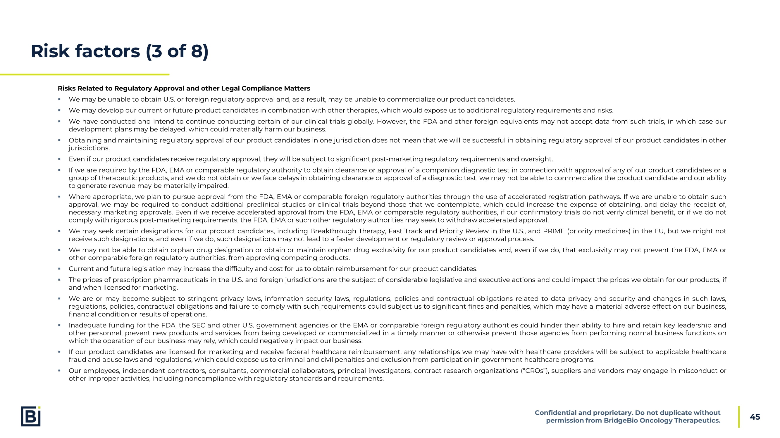 Risk factors (2 of 8) 44 Confidential and proprietary. Do not duplicate without permission from BridgeBio Oncology Therapeutics. Risks Related to BBOT’s Product Development, Regulatory Approval and Commercialization (cont . ) ▪ We may not be able to submit investigational new drug applications (“INDs”), clinical trial applications (“CTAs”) or comparable applications to commence clinical trials on the timelines we expect, and even if we are able to, the FDA, EMA or any comparable foreign regulatory authority may not permit us to proceed . ▪ Our product candidates may cause significant adverse events, toxicities or other undesirable adverse events when used alone or in combination with other approved products or investigational new drugs that may result in a safety profile that could prevent regulatory approval, prevent market acceptance, limit their commercial potential or result in significant negative consequences . ▪ Interim, preliminary and topline data from our preclinical studies and clinical trials that we announce or publish from time to time may change as more data become available and are subject to audit and verification procedures that could result in material changes in the final data . ▪ If we experience delays or difficulties in the enrollment or maintenance of patients in clinical trials, our regulatory submissions or receipt of necessary marketing approvals could be delayed or prevented . ▪ We have limited resources and are currently focusing our efforts on the development of BBO - 8520 , BBO - 10203 and BBO - 11818 in particular indications and advancing our discovery programs . As a result, we may fail to capitalize on other indications or product candidates that may ultimately have proven to be more profitable . ▪ We rely on third parties to manufacture preclinical and clinical drug supplies, and we intend to rely on third parties to produce commercial supplies of any approved product, which increases the risk that we will not have sufficient quantities of these product candidates or products or such quantities at an acceptable cost, which could delay, prevent or impair our development or commercialization efforts . ▪ We face substantial competition which may result in others discovering, developing or commercializing products before or more successfully than we do . ▪ Our product candidates may not achieve adequate market acceptance among physicians, patients, healthcare payors and others in the medical community necessary for commercial success . ▪ The market opportunities for any product candidates we develop, if approved, may be limited to certain smaller patient subsets and may be smaller than we estimate them to be . ▪ Any product candidates we develop may become subject to unfavorable third - party coverage and reimbursement practices, as well as pricing regulations . ▪ Our business entails a significant risk of product liability and if we are unable to obtain sufficient insurance coverage such inability could have an adverse effect on our business and financial condition . ▪ Certain of our product candidates are novel, complex and difficult to manufacture . We could experience manufacturing problems that result in delays in our development or commercialization programs or otherwise harm our business . ▪ Certain of our product candidates are under development for the treatment of patient populations with significant comorbidities that may result in deaths or serious adverse or unacceptable side effects and require us to abandon or limit our clinical development activities . ▪ Shutdowns or disruptions at the FDA and other government agencies caused by funding shortages or global health concerns could hinder their ability to hire, retain or deploy key leadership and other personnel, or otherwise prevent new or modified products from being developed, approved or commercialized in a timely manner or at all, which could negatively impact our business .