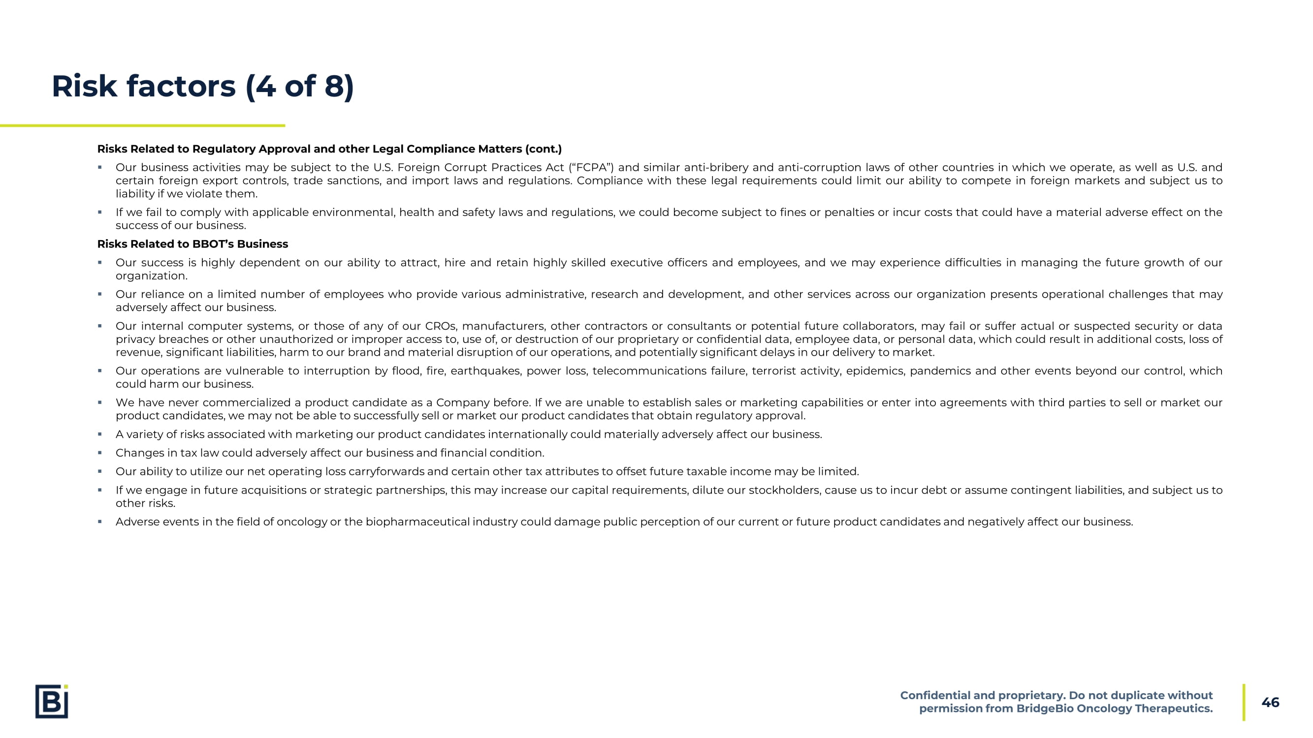 Risk factors (3 of 8) 45 Confidential and proprietary. Do not duplicate without permission from BridgeBio Oncology Therapeutics. Risks Related to Regulatory Approval and other Legal Compliance Matters ▪ We may be unable to obtain U . S . or foreign regulatory approval and, as a result, may be unable to commercialize our product candidates . ▪ We may develop our current or future product candidates in combination with other therapies, which would expose us to additional regulatory requirements and risks . ▪ We have conducted and intend to continue conducting certain of our clinical trials globally . However, the FDA and other foreign equivalents may not accept data from such trials, in which case our development plans may be delayed, which could materially harm our business . ▪ Obtaining and maintaining regulatory approval of our product candidates in one jurisdiction does not mean that we will be successful in obtaining regulatory approval of our product candidates in other jurisdictions . ▪ Even if our product candidates receive regulatory approval, they will be subject to significant post - marketing regulatory requirements and oversight . ▪ If we are required by the FDA, EMA or comparable regulatory authority to obtain clearance or approval of a companion diagnostic test in connection with approval of any of our product candidates or a group of therapeutic products, and we do not obtain or we face delays in obtaining clearance or approval of a diagnostic test, we may not be able to commercialize the product candidate and our ability to generate revenue may be materially impaired . ▪ Where appropriate, we plan to pursue approval from the FDA, EMA or comparable foreign regulatory authorities through the use of accelerated registration pathways . If we are unable to obtain such approval, we may be required to conduct additional preclinical studies or clinical trials beyond those that we contemplate, which could increase the expense of obtaining, and delay the receipt of, necessary marketing approvals . Even if we receive accelerated approval from the FDA, EMA or comparable regulatory authorities, if our confirmatory trials do not verify clinical benefit, or if we do not comply with rigorous post - marketing requirements, the FDA, EMA or such other regulatory authorities may seek to withdraw accelerated approval . ▪ We may seek certain designations for our product candidates, including Breakthrough Therapy, Fast Track and Priority Review in the U . S . , and PRIME (priority medicines) in the EU, but we might not receive such designations, and even if we do, such designations may not lead to a faster development or regulatory review or approval process . ▪ We may not be able to obtain orphan drug designation or obtain or maintain orphan drug exclusivity for our product candidates and, even if we do, that exclusivity may not prevent the FDA, EMA or other comparable foreign regulatory authorities, from approving competing products . ▪ Current and future legislation may increase the difficulty and cost for us to obtain reimbursement for our product candidates . ▪ The prices of prescription pharmaceuticals in the U . S . and foreign jurisdictions are the subject of considerable legislative and executive actions and could impact the prices we obtain for our products, if and when licensed for marketing . ▪ We are or may become subject to stringent privacy laws, information security laws, regulations, policies and contractual obligations related to data privacy and security and changes in such laws, regulations, policies, contractual obligations and failure to comply with such requirements could subject us to significant fines and penalties, which may have a material adverse effect on our business, financial condition or results of operations . ▪ Inadequate funding for the FDA, the SEC and other U . S . government agencies or the EMA or comparable foreign regulatory authorities could hinder their ability to hire and retain key leadership and other personnel, prevent new products and services from being developed or commercialized in a timely manner or otherwise prevent those agencies from performing normal business functions on which the operation of our business may rely, which could negatively impact our business . ▪ If our product candidates are licensed for marketing and receive federal healthcare reimbursement, any relationships we may have with healthcare providers will be subject to applicable healthcare fraud and abuse laws and regulations, which could expose us to criminal and civil penalties and exclusion from participation in government healthcare programs . ▪ Our employees, independent contractors, consultants, commercial collaborators, principal investigators, contract research organizations (“CROs”), suppliers and vendors may engage in misconduct or other improper activities, including noncompliance with regulatory standards and requirements .