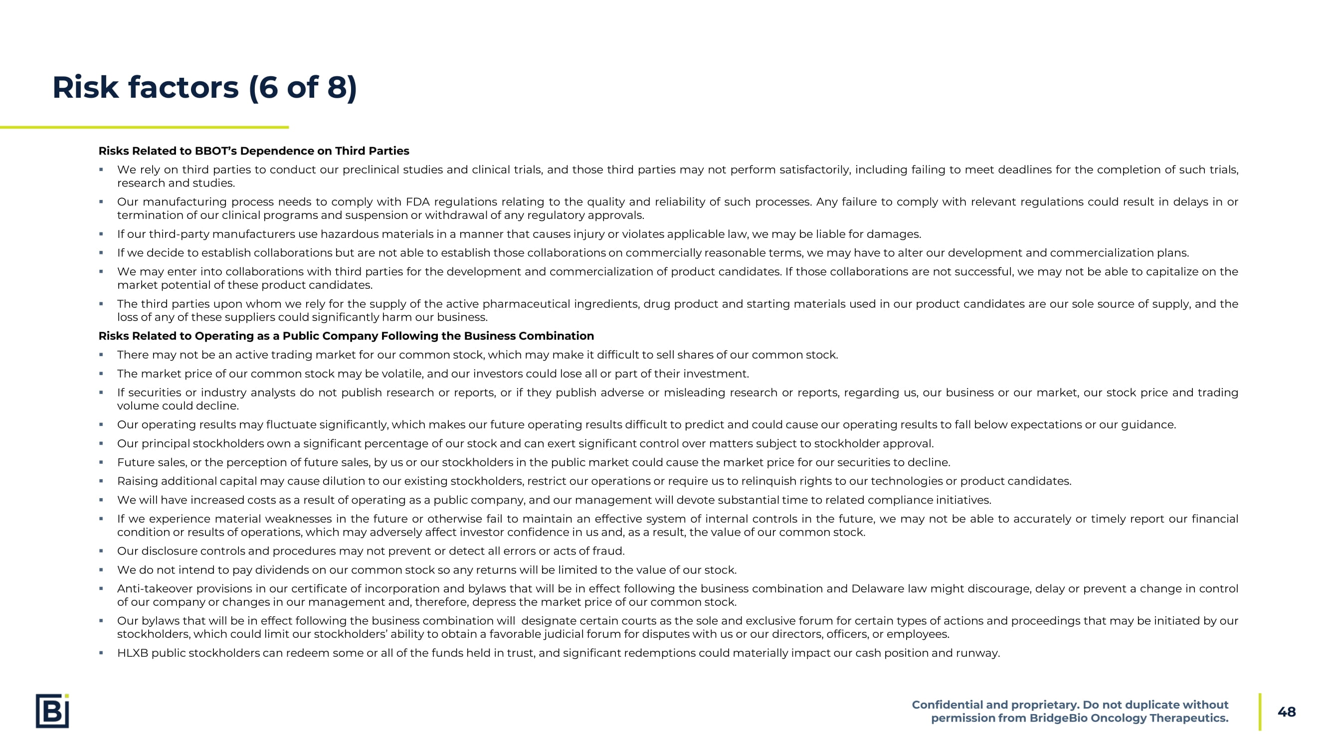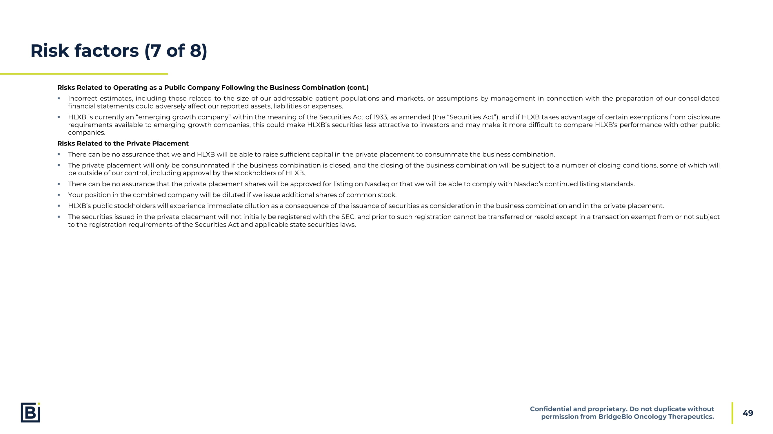 Risk factors (6 of 8) 48 Confidential and proprietary. Do not duplicate without permission from BridgeBio Oncology Therapeutics. Risks Related to BBOT’s Dependence on Third Parties ▪ We rely on third parties to conduct our preclinical studies and clinical trials, and those third parties may not perform satisfactorily, including failing to meet deadlines for the completion of such trials, research and studies . ▪ Our manufacturing process needs to comply with FDA regulations relating to the quality and reliability of such processes . Any failure to comply with relevant regulations could result in delays in or termination of our clinical programs and suspension or withdrawal of any regulatory approvals . ▪ If our third - party manufacturers use hazardous materials in a manner that causes injury or violates applicable law, we may be liable for damages . ▪ If we decide to establish collaborations but are not able to establish those collaborations on commercially reasonable terms, we may have to alter our development and commercialization plans . ▪ We may enter into collaborations with third parties for the development and commercialization of product candidates . If those collaborations are not successful, we may not be able to capitalize on the market potential of these product candidates . ▪ The third parties upon whom we rely for the supply of the active pharmaceutical ingredients, drug product and starting materials used in our product candidates are our sole source of supply, and the loss of any of these suppliers could significantly harm our business . Risks Related to Operating as a Public Company Following the Business Combination ▪ There may not be an active trading market for our common stock, which may make it difficult to sell shares of our common stock . ▪ The market price of our common stock may be volatile, and our investors could lose all or part of their investment . ▪ If securities or industry analysts do not publish research or reports, or if they publish adverse or misleading research or reports, regarding us, our business or our market, our stock price and trading volume could decline . ▪ Our operating results may fluctuate significantly, which makes our future operating results difficult to predict and could cause our operating results to fall below expectations or our guidance . ▪ Our principal stockholders own a significant percentage of our stock and can exert significant control over matters subject to stockholder approval . ▪ Future sales, or the perception of future sales, by us or our stockholders in the public market could cause the market price for our securities to decline . ▪ Raising additional capital may cause dilution to our existing stockholders, restrict our operations or require us to relinquish rights to our technologies or product candidates . ▪ We will have increased costs as a result of operating as a public company, and our management will devote substantial time to related compliance initiatives . ▪ If we experience material weaknesses in the future or otherwise fail to maintain an effective system of internal controls in the future, we may not be able to accurately or timely report our financial condition or results of operations, which may adversely affect investor confidence in us and, as a result, the value of our common stock . ▪ Our disclosure controls and procedures may not prevent or detect all errors or acts of fraud . ▪ We do not intend to pay dividends on our common stock so any returns will be limited to the value of our stock . ▪ Anti - takeover provisions in our certificate of incorporation and bylaws that will be in effect following the business combination and Delaware law might discourage, delay or prevent a change in control of our company or changes in our management and, therefore, depress the market price of our common stock . ▪ Our bylaws that will be in effect following the business combination will designate certain courts as the sole and exclusive forum for certain types of actions and proceedings that may be initiated by our stockholders, which could limit our stockholders’ ability to obtain a favorable judicial forum for disputes with us or our directors, officers, or employees . ▪ HLXB public stockholders can redeem some or all of the funds held in trust, and significant redemptions could materially impact our cash position and runway .