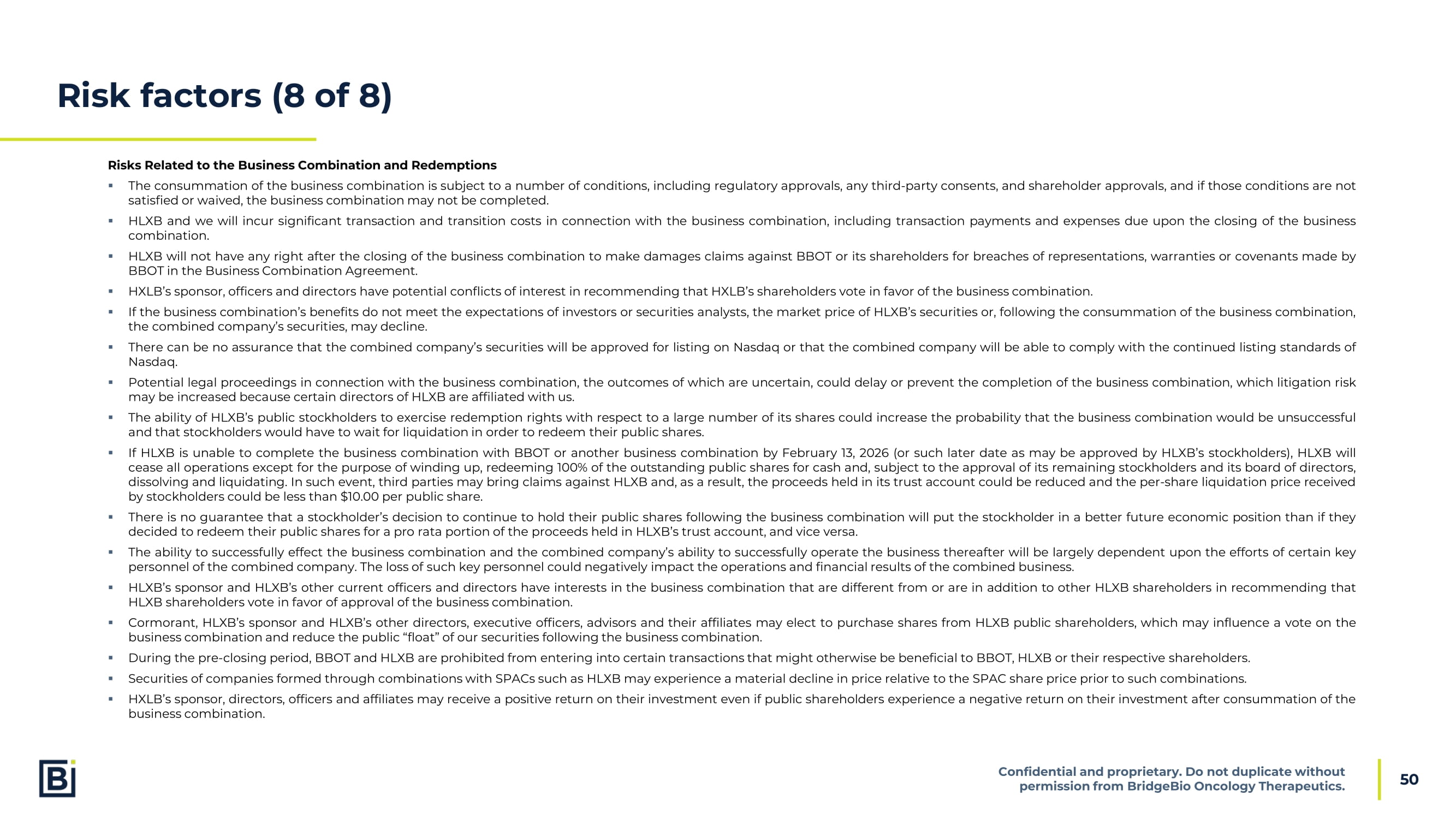 Risk factors (7 of 8) 49 Confidential and proprietary. Do not duplicate without permission from BridgeBio Oncology Therapeutics. Risks Related to Operating as a Public Company Following the Business Combination (cont . ) ▪ Incorrect estimates, including those related to the size of our addressable patient populations and markets, or assumptions by management in connection with the preparation of our consolidated financial statements could adversely affect our reported assets, liabilities or expenses . ▪ HLXB is currently an “emerging growth company” within the meaning of the Securities Act of 1933 , as amended (the “Securities Act”), and if HLXB takes advantage of certain exemptions from disclosure requirements available to emerging growth companies, this could make HLXB’s securities less attractive to investors and may make it more difficult to compare HLXB’s performance with other public companies . Risks Related to the Private Placement ▪ There can be no assurance that we and HLXB will be able to raise sufficient capital in the private placement to consummate the business combination . ▪ The private placement will only be consummated if the business combination is closed, and the closing of the business combination will be subject to a number of closing conditions, some of which will be outside of our control, including approval by the stockholders of HLXB . ▪ There can be no assurance that the private placement shares will be approved for listing on Nasdaq or that we will be able to comply with Nasdaq’s continued listing standards . ▪ Your position in the combined company will be diluted if we issue additional shares of common stock . ▪ HLXB’s public stockholders will experience immediate dilution as a consequence of the issuance of securities as consideration in the business combination and in the private placement . ▪ The securities issued in the private placement will not initially be registered with the SEC, and prior to such registration cannot be transferred or resold except in a transaction exempt from or not subject to the registration requirements of the Securities Act and applicable state securities laws .