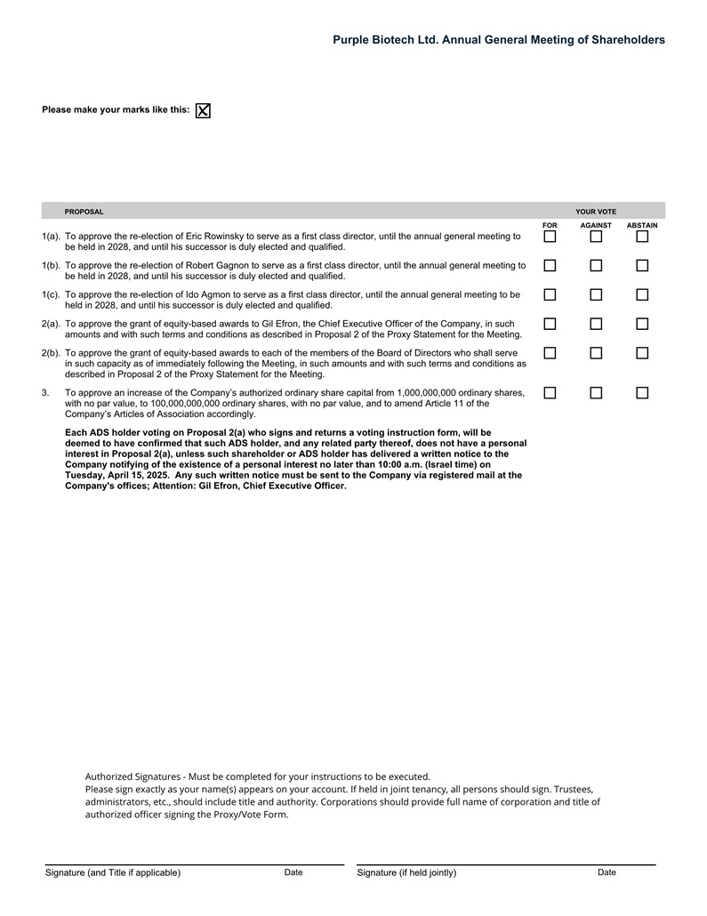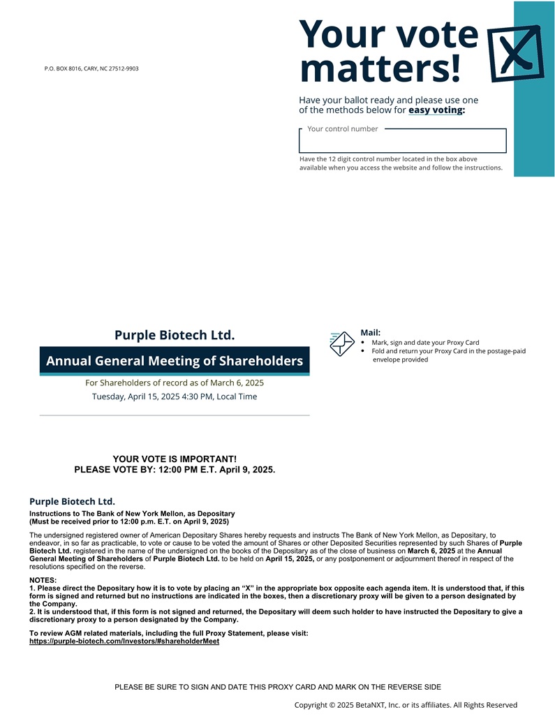 The last date for submitting a request to include a proposal in accordance with Section 66(b) of the Companies Law and the regulations thereunder, is March 7, 2025. The full version of the proposed resolutions may be viewed in the proxy statement, which, together with the accompanying voting instruction form and voting slip (collectively, the “Proxy Materials”), will be furnished to the U.S. Securities and Exchange Commission under cover of Form 6-K and will be publicly available via its website at http://www.sec.gov. This Notice of Annual General Meeting of Shareholders and the Proxy Materials will also be submitted to the ISA and TASE and will be available on their respective websites for listed company reports http://www.tase.co.il/tase/ and http://www.magna.isa.gov.il. The Proxy Materials will also be made available at the “Investor” portion of our website, which can be found at https://purple-biotech.com/investors, and may also be viewed at our offices, upon prior coordination and during regular business hours, at 4 Oppenheimer Street, Science Park, Rehovot, Israel (Tel: +972-3-9333121), until the date of the Meeting. Detailed voting instructions are provided in the proxy statement, the voting instruction form and the voting slip.