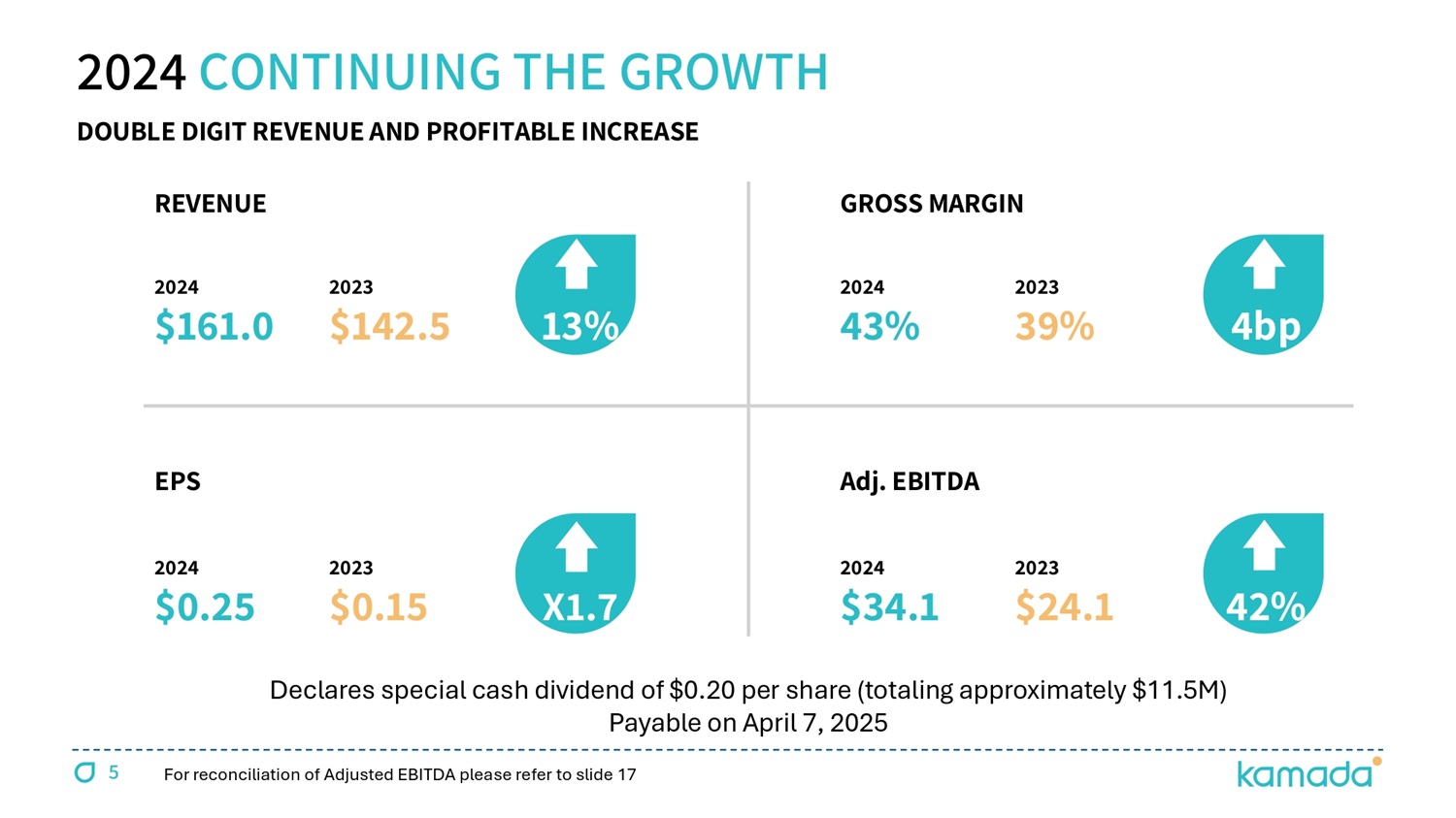 March 2025 Fourth Quarter & Year Ended December 31, 2024 Investors Call FORWARD - LOOKING STATEMENT This presentation is not intended to provide investment or medical advice . It should be noted that some products under development described herein have not been found safe or effective by any regulatory agency and are not approved for any use outside of clinical trials . This presentation contains forward - looking statements, which express the current beliefs and expectations of Kamada’s management . Such statements include 2025 financial guidance ; growth strategy and plans for double digit growth ; progression of inhaled AAT clinical study, its benefits and advantages, potential market size, potential FDA's feedback, our plan to reduce the study sample to approximately 180 patients, and to conduct an interim futility analysis by the end of 2025 ; KedRab sales, growth prospects of Cytogam and growth prospects related to the Israeli distribution business segment and the U . S . plasma segment ; success in identifying and integrating M&A targets for growth and the payment of this cash dividend . These statements involve a number of known and unknown risks and uncertainties that could cause Kamada's future results, performance or achievements to differ significantly from the projected results, performances or achievements expressed or implied by such forward - looking statements . Important factors that could cause or contribute to such differences include, but are not limited to, risks relating to Kamada's ability to successfully develop and commercialize its products and product candidates, progress and results of any clinical trials, introduction of competing products, continued market acceptance of Kamada’s commercial products portfolio, impact of geo - political environment in the middle east, impact of any changes in regulation and legislation that could affect the pharmaceutical industry, difficulty in predicting, obtaining or maintaining U . S . Food and Drug Administration, European Medicines Agency and other regulatory authority approvals, restrains related to third parties’ IP rights and changes in the health policies and structures of various countries, success of M&A strategies, environmental risks, changes in the worldwide pharmaceutical industry and other factors that are discussed under the heading “Risk Factors” of Kamada’s 2024 Annual Report on Form 20 - F (filed on March 5 , 2025 ), as well as in Kamada’s recent Forms 6 - K filed with the U . S . Securities and Exchange Commission . This presentation includes certain non - IFRS financial information, which is not intended to be considered in isolation or as a substitute for, or superior to, the financial information prepared and presented in accordance with IFRS . The non - IFRS financial measures may be calculated differently from, and therefore may not be comparable to, similarly titled measures used by other companies . In accordance with the requirement of the SEC regulations a reconciliation of these non - IFRS financial measures to the comparable IFRS measures is included in an appendix to this presentation . Management uses these non - IFRS financial measures for financial and operational decision - making and as a means to evaluate period - to - period comparisons . Management believes that these non - IFRS financial measures provide meaningful supplemental information regarding Kamada’s performance and liquidity . Forward - looking statements speak only as of the date they are made, and Kamada undertakes no obligation to update any forward - looking statement to reflect the impact of circumstances or events that arise after the date the forward - looking statement was made, except as required by applicable law . 2 KEDRAB® CYTOGAM® HEPGAM B® VARIZIG® WINRHO® GLASSIA® KAMADA - A GLOBAL BIOPHARMACEUTICAL COMPANY 6 FDA - Approved Products 15 % CAGR (from 2021) $ 178 - 182M 2025 Revenues Guidance $ 38 - 42M 2025 Adj.