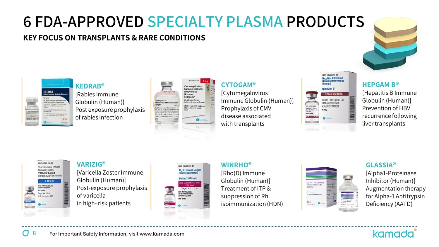 KAMADA ’ S ROADMAP FOR CONTINUED ANNUAL DOUBLE - DIGIT GROWTH 7 Organic Growth Portfolio of 6 FDA - approved products; Over 30 territories ; and Distribution portfolio in Israel M&A Transactions Support growth through M&A transactions Plasma Collection Centers Each new center expected to contribute annual revenues of $ 8 M - $ 10 M at peak capacity Inhaled AAT Phase III pivotal clinical study, targeting a market of over $2B 8 6 FDA - APPROVED SPECIALTY PLASMA PRODUCTS KEDRAB® [Rabies Immune Globulin (Human)] Post exposure prophylaxis of rabies infection CYTOGAM® [Cytomegalovirus Immune Globulin (Human)] Prophylaxis of CMV disease associated with transplants HEPGAM B® [Hepatitis B Immune Globulin (Human)] Prevention of HBV recurrence following liver transplants VARIZIG® [Varicella Zoster Immune Globulin (Human)] Post - exposure prophylaxis of varicella in high - risk patients WINRHO® [Rho(D) Immune Globulin (Human)] Treatment of ITP & suppression of Rh isoimmunization (HDN) KEY FOCUS ON TRANSPLANTS & RARE CONDITIONS For Important Safety Information, visit www.Kamada.com GLASSIA® [Alpha 1 - Proteinase Inhibitor (Human)] Augmentation therapy for Alpha - 1 Antitrypsin Deficiency (AATD)