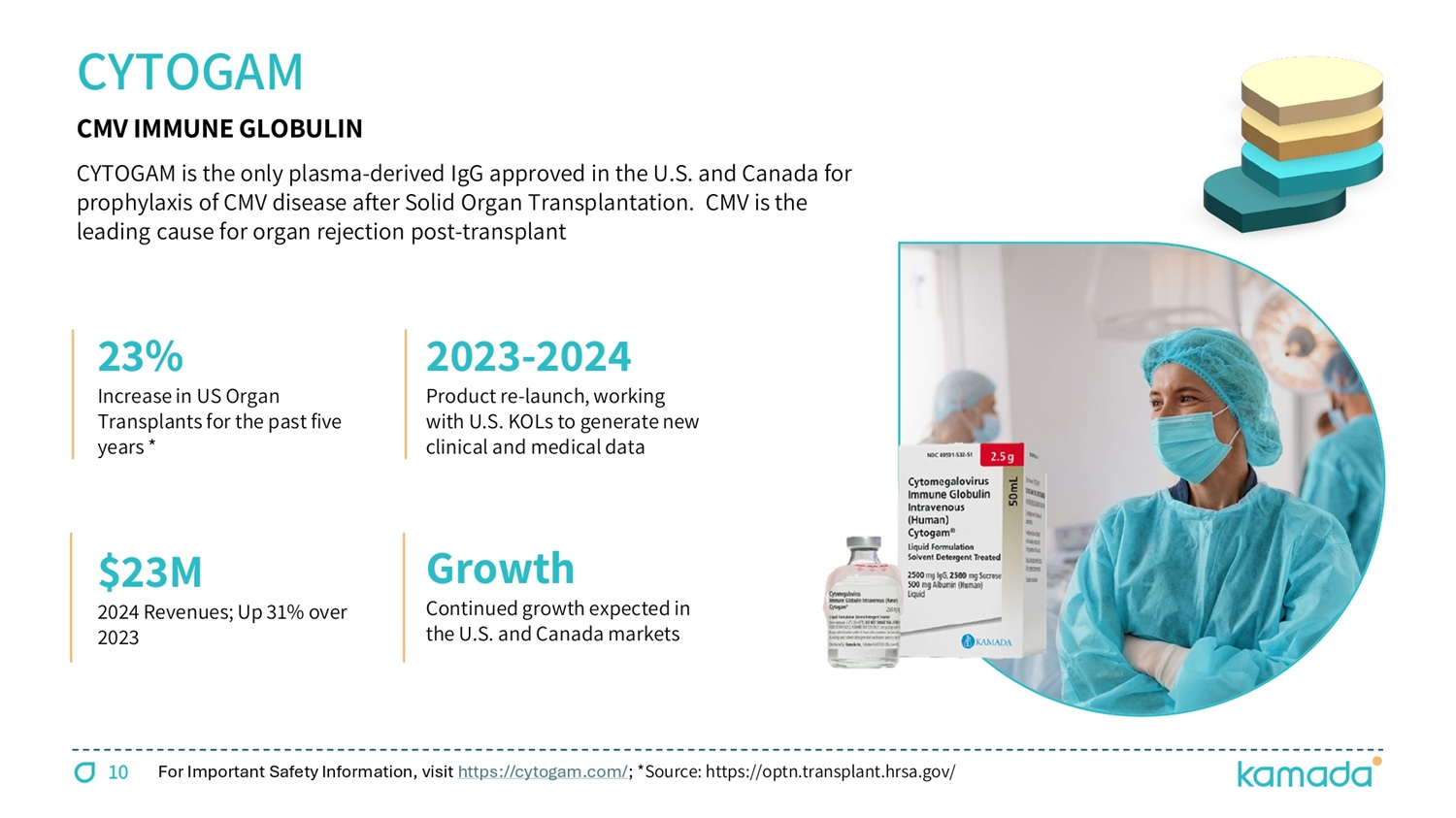 expected in 2025 - 2027 Only 2 FDA approved products Leading HRIG in Canada, Australia, Israel, Latin America and additional territories A GLOBAL LEADER IN ANTI - RABIES IMMUNE GLOBULIN (HRIG) For Important Safety Information, visit https://kedrab.com/ 9 CYTOGAM is the only plasma - derived IgG approved in the U.S. and Canada for prophylaxis of CMV disease after Solid Organ Transplantation. CMV is the leading cause for organ rejection post - transplant CYTOGAM ĎČĎď - 2024 Product re - launch, working with U.S. KOLs to generate new clinical and medical data 23 Ʊ Increase in US Organ Transplants for the past five years Ŀ $ 23 M 2024 Revenues; Up 31 % over 2023 CMV IMMUNE GLOBULIN Growth Continued growth expected in the U.S.