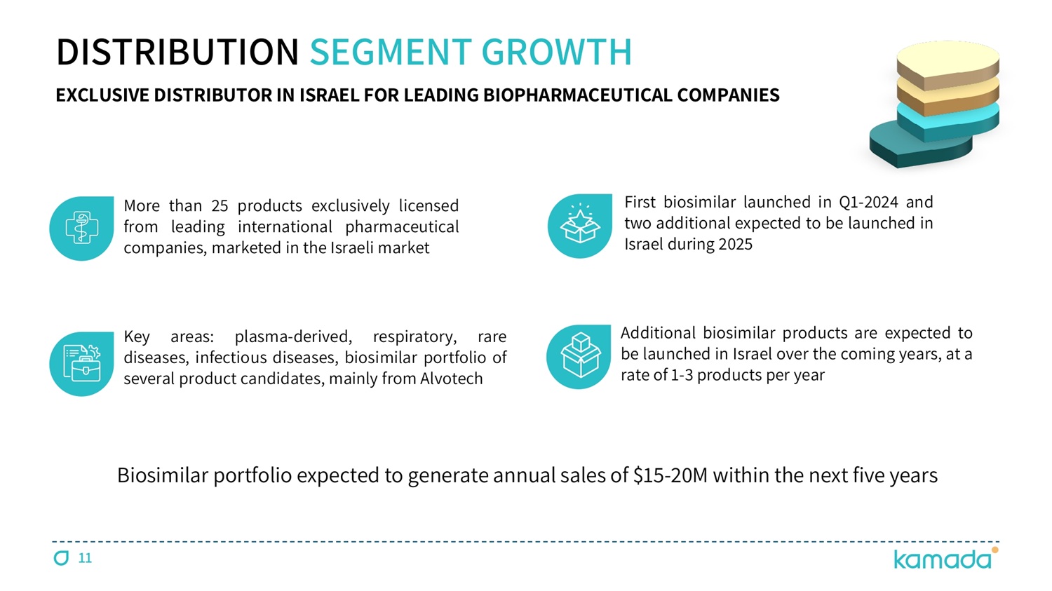 and Canada markets 10 For Important Safety Information, visit https://cytogam.com/ ; *Source: https://optn.transplant.hrsa.gov/ DISTRIBUTION SEGMENT GROWTH More than 25 products exclusively licensed from leading international pharmaceutical companies, marketed in the Israeli market EXCLUSIVE DISTRIBUTOR IN ISRAEL FOR LEADING BIOPHARMACEUTICAL COMPANIES Key areas : plasma - derived, respiratory, rare diseases, infectious diseases, biosimilar portfolio of several product candidates, mainly from Alvotech First biosimilar launched in Q 1 - 2024 and two additional expected to be launched in Israel during 2025 Additional biosimilar products are expected to be launched in Israel over the coming years, at a rate of 1 - 3 products per year Biosimilar portfolio expected to generate annual sales of $ 15 - 20 M within the next five years 11 12 M&A TRANSACTIONS AIMING TO SECURE NEW BUSINESS DEVELOPMENT AND M&A TRANSACTIONS DURING 2025 ; LEVERAGING OVERALL FINANCIAL STRENGTH AND COMMERCIAL INFRASTRUCTURE Exploring strategic business development opportunities to identify potential acquisition or in - licensing to accelerate long - term growth Focusing on products synergistic to our existing commercial and/or production activities Strong financial position, commercial infrastructure and proven successful M&A capabilities