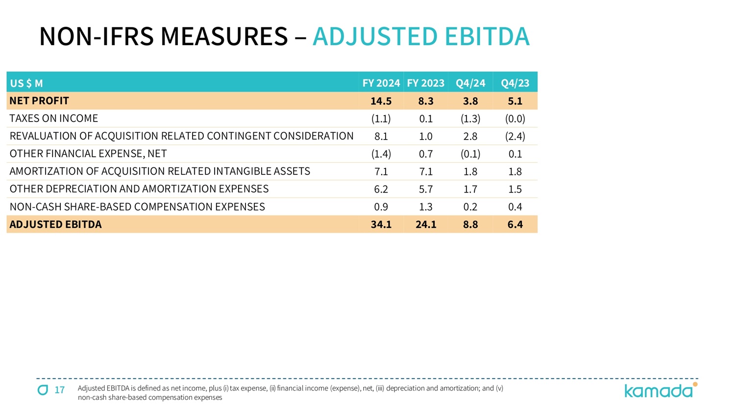 8.8 11.1 LEASE LIABILITIES Acquisition related contingent consideration 68.2 63.6 CONTINGENT LIABILITIES 244.0 259.5 EQUITY Available cash net of contingent and lease liabilities (21.4) 3.7 NET CASH (DEBT) Adjusted EBITDA is defined as net income, plus ( i ) tax expense, (ii) financial income (expense), net, (iii) depreciation and amortization ; and (v) non - cash share - based compensation expenses STRONG 2024 FINANCIAL RESULTS NL0 17 NON - IFRS MEASURES – ADJUSTED EBITDA Q4/23 Q4/24 FY 2023 FY 2024 US $ M 5.1 3.8 8.3 14.5 NET PROFIT (0.0) (1.3) 0.1 (1.1) TAXES ON INCOME (2.4) 2.8 1.0 8.1 REVALUATION OF ACQUISITION RELATED CONTINGENT CONSIDERATION 0.1 (0.1) 0.7 (1.4) OTHER FINANCIAL EXPENSE, NET 1.8 1.8 7.1 7.1 AMORTIZATION OF ACQUISITION RELATED INTANGIBLE ASSETS 1.5 1.7 5.7 6.2 OTHER DEPRECIATION AND AMORTIZATION EXPENSES 0.4 0.2 1.3 0.9 NON - CASH SHARE - BASED COMPENSATION EXPENSES 6.4 8.8 24.1 34.1 ADJUSTED EBITDA Adjusted EBITDA is defined as net income, plus ( i ) tax expense, (ii) financial income (expense), net, (iii) depreciation and amortization ; and (v) non - cash share - based compensation expenses KEDRAB® CYTOGAM® HEPGAM B® VARIZIG® WINRHO® GLASSIA® KAMADA - A GLOBAL BIOPHARMACEUTICAL COMPANY 6 FDA - Approved Products 15 % CAGR (from 2021) $ 178 - 182M 2025 Revenues Guidance $ 38 - 42M 2025 Adj.