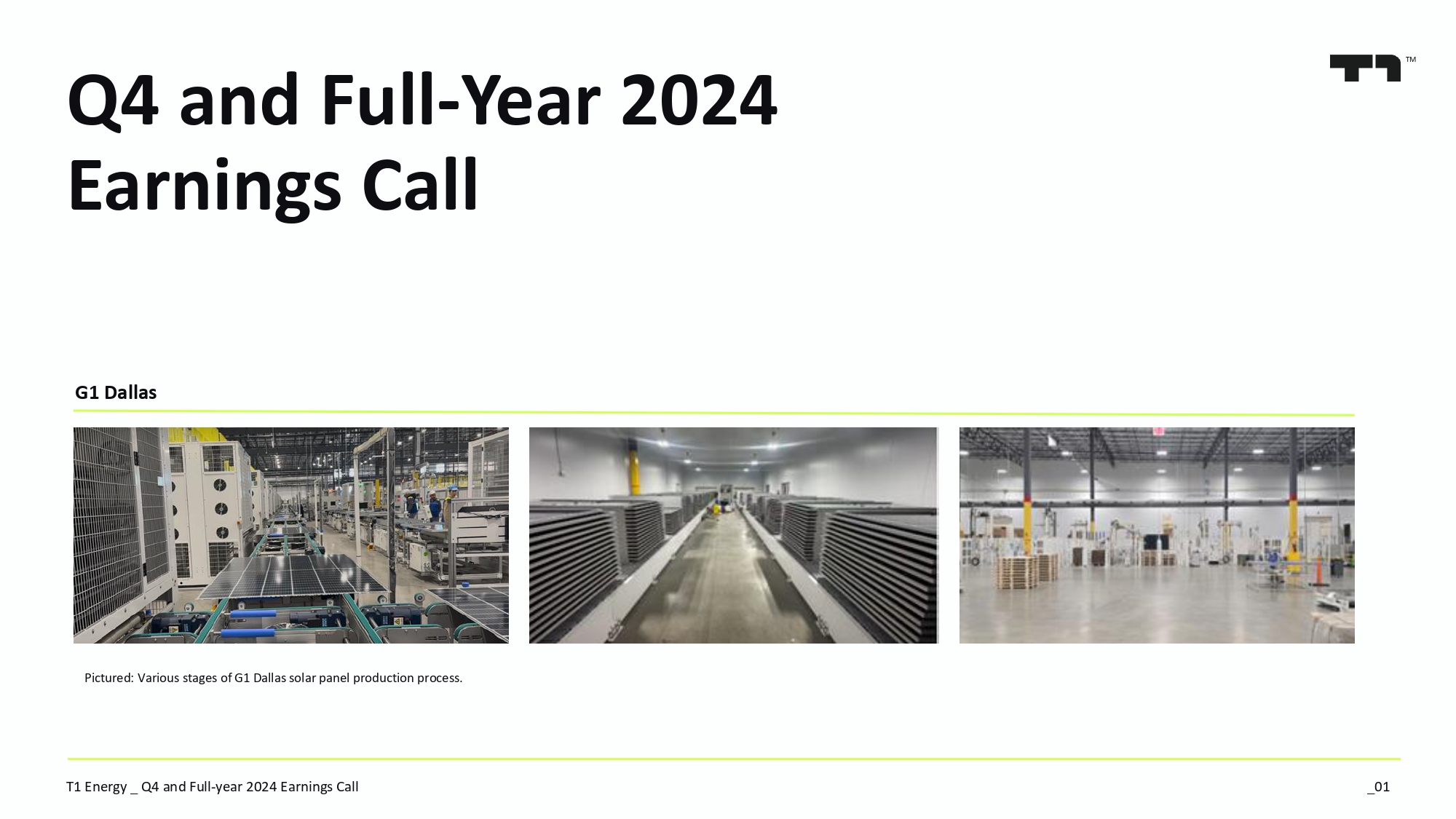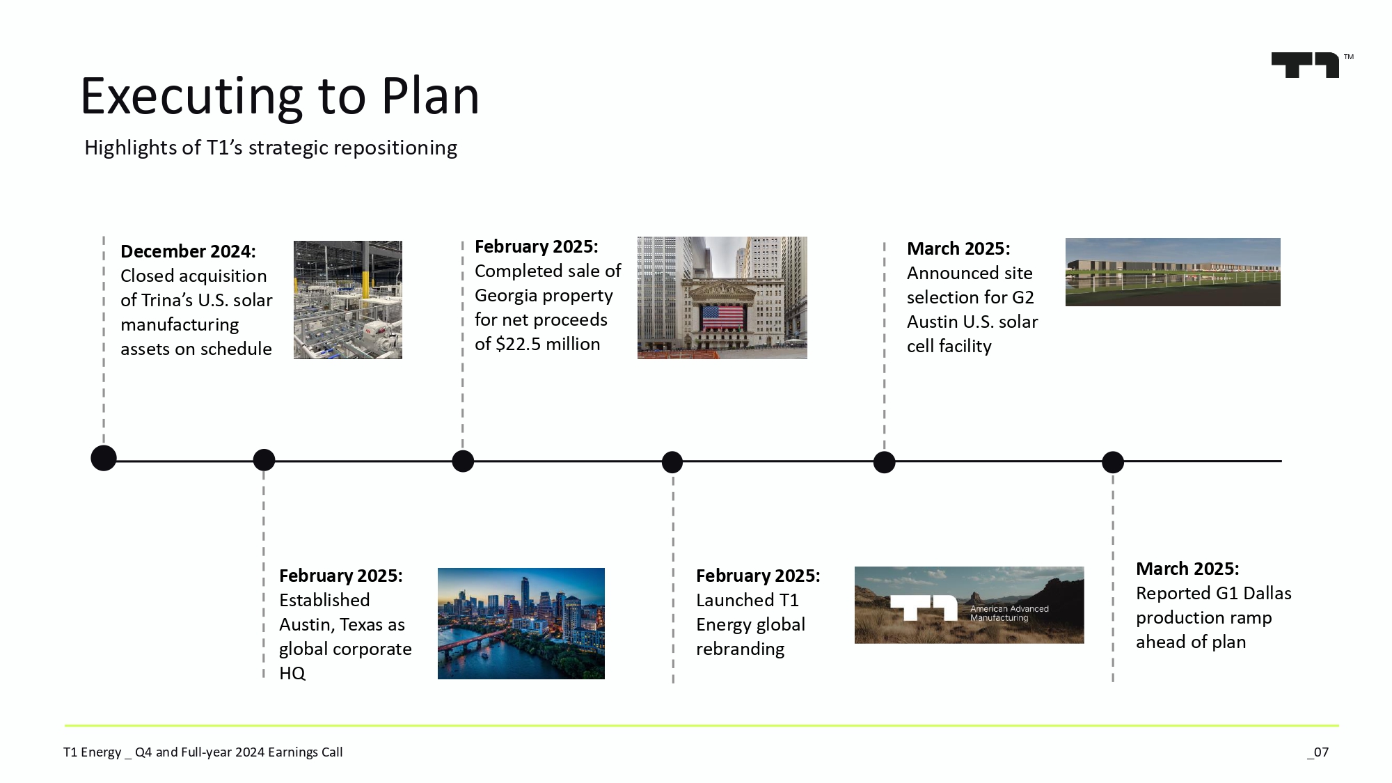 | § | トリナ・ソーラーの米国太陽光発電製造資産の変革的買収を発表2024年11月6日、当社はトリナ・ソーラー社(Trina Solar Co.(Ltd.(SHA:688599)(以下「トリナ」)の米国製造資産を総額6億2,100万ドルで買収することで合意したと発表した。この買収には、2024年11月1日に生産を開始する、テキサス州ウィルマーにある5GW、135万平方フィートの太陽電池モジュール製造施設の買収が含まれ、その後T1は「G1 Dallas」と命名した。 |
