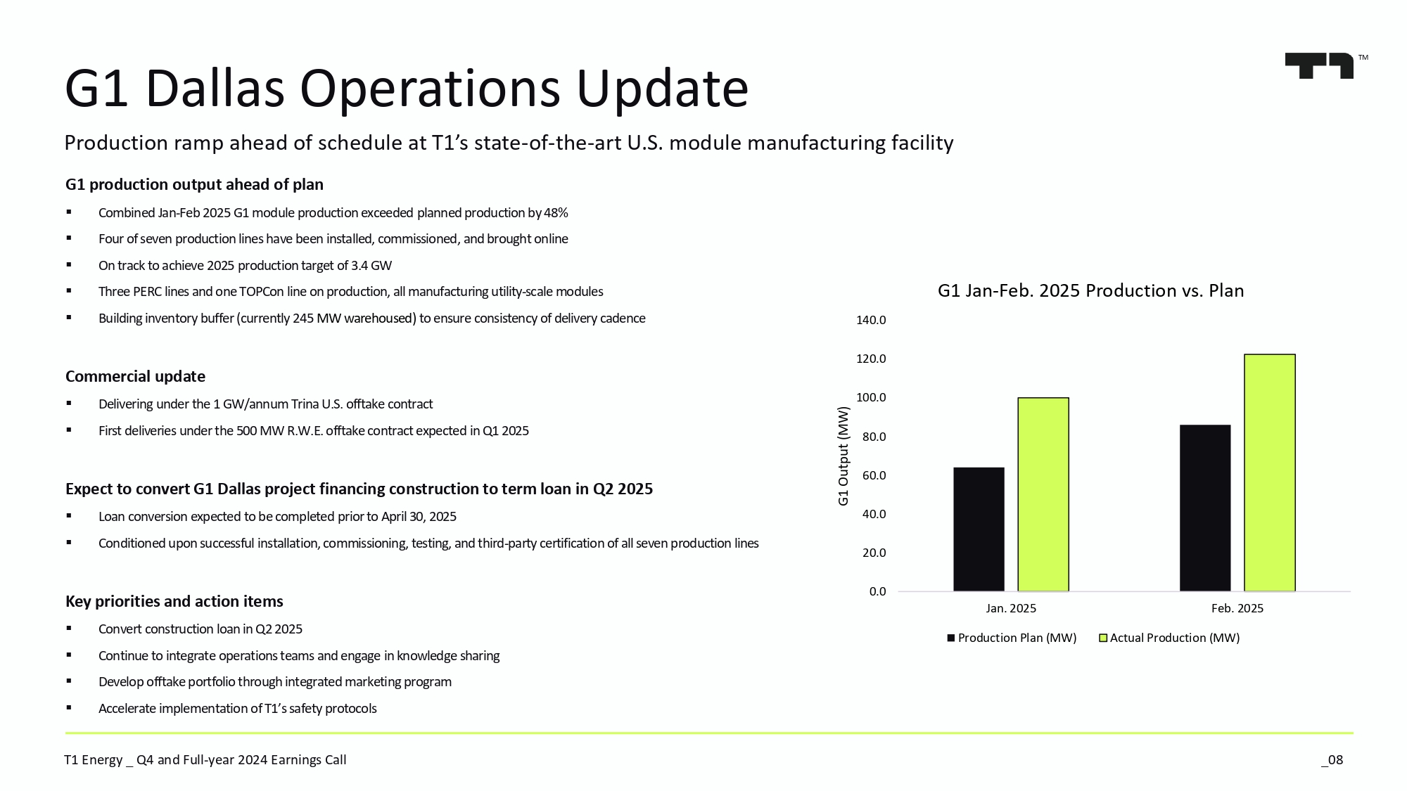 本日2025年3月17日午前8時(米国東部夏時間)より、第4四半期および2024年通年の財務・業績に関するプレゼンテーションを開催する。決算およびプレゼンテーション資料は https://ir.t1energy.com/overview/default.aspx からダウンロードできます。