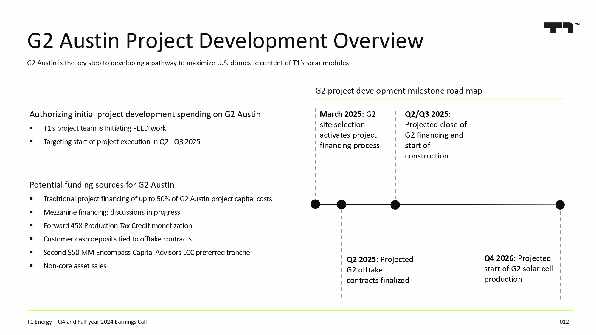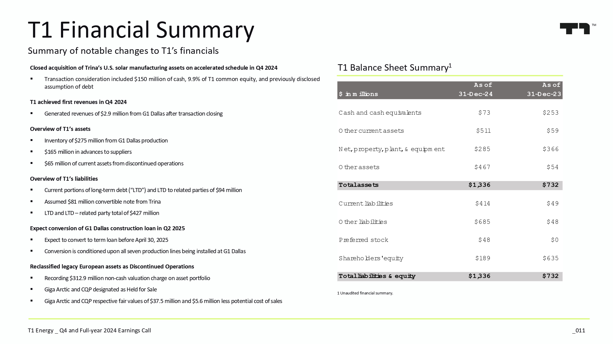 | § | トリナ社買収の早期完了2024年12月24日、T1は、トリナの米国太陽光発電製造資産の変革的買収を、事前に発表したスケジュール通りに完了したと発表した。 |