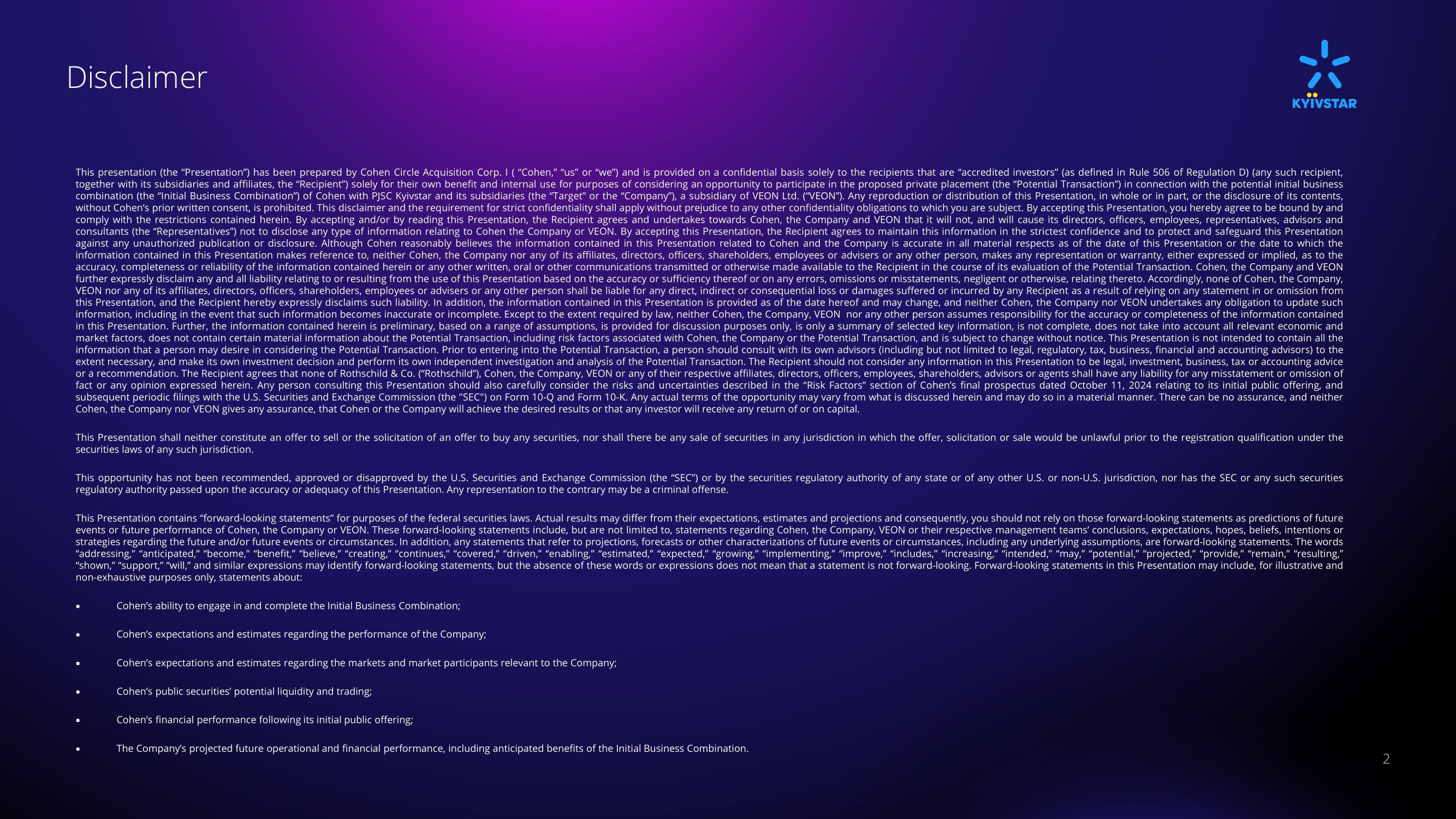 Disclaimer 2 This presentation (the “Presentation”) has been prepared by Cohen Circle Acquisition Corp . I ( “Cohen,” “us” or “we”) and is provided on a confidential basis solely to the recipients that are “accredited investors” (as defined in Rule 506 of Regulation D) (any such recipient, together with its subsidiaries and affiliates, the “Recipient”) solely for their own benefit and internal use for purposes of considering an opportunity to participate in the proposed private placement (the “Potential Transaction”) in connection with the potential initial business combination (the “Initial Business Combination”) of Cohen with PJSC Kyivstar and its subsidiaries (the “Target” or the “Company”), a subsidiary of VEON Ltd . (“VEON”) . Any reproduction or distribution of this Presentation, in whole or in part, or the disclosure of its contents, without Cohen’s prior written consent, is prohibited . This disclaimer and the requirement for strict confidentiality shall apply without prejudice to any other confidentiality obligations to which you are subject . By accepting this Presentation, you hereby agree to be bound by and comply with the restrictions contained herein . By accepting and/or by reading this Presentation, the Recipient agrees and undertakes towards Cohen, the Company and VEON that it will not, and will cause its directors, officers, employees, representatives, advisors and consultants (the “Representatives”) not to disclose any type of information relating to Cohen the Company or VEON . By accepting this Presentation, the Recipient agrees to maintain this information in the strictest confidence and to protect and safeguard this Presentation against any unauthorized publication or disclosure . Although Cohen reasonably believes the information contained in this Presentation related to Cohen and the Company is accurate in all material respects as of the date of this Presentation or the date to which the information contained in this Presentation makes reference to, neither Cohen, the Company nor any of its affiliates, directors, officers, shareholders, employees or advisers or any other person, makes any representation or warranty, either expressed or implied, as to the accuracy, completeness or reliability of the information contained herein or any other written, oral or other communications transmitted or otherwise made available to the Recipient in the course of its evaluation of the Potential Transaction . Cohen, the Company and VEON further expressly disclaim any and all liability relating to or resulting from the use of this Presentation based on the accuracy or sufficiency thereof or on any errors, omissions or misstatements, negligent or otherwise, relating thereto . Accordingly, none of Cohen, the Company, VEON nor any of its affiliates, directors, officers, shareholders, employees or advisers or any other person shall be liable for any direct, indirect or consequential loss or damages suffered or incurred by any Recipient as a result of relying on any statement in or omission from this Presentation, and the Recipient hereby expressly disclaims such liability . In addition, the information contained in this Presentation is provided as of the date hereof and may change, and neither Cohen, the Company nor VEON undertakes any obligation to update such information, including in the event that such information becomes inaccurate or incomplete . Except to the extent required by law, neither Cohen, the Company, VEON nor any other person assumes responsibility for the accuracy or completeness of the information contained in this Presentation . Further, the information contained herein is preliminary, based on a range of assumptions, is provided for discussion purposes only, is only a summary of selected key information, is not complete, does not take into account all relevant economic and market factors, does not contain certain material information about the Potential Transaction, including risk factors associated with Cohen, the Company or the Potential Transaction, and is subject to change without notice . This Presentation is not intended to contain all the information that a person may desire in considering the Potential Transaction . Prior to entering into the Potential Transaction, a person should consult with its own advisors (including but not limited to legal, regulatory, tax, business, financial and accounting advisors) to the extent necessary, and make its own investment decision and perform its own independent investigation and analysis of the Potential Transaction . The Recipient should not consider any information in this Presentation to be legal, investment, business, tax or accounting advice or a recommendation . The Recipient agrees that none of Rothschild & Co . (“Rothschild”), Cohen, the Company, VEON or any of their respective affiliates, directors, officers, employees, shareholders, advisors or agents shall have any liability for any misstatement or omission of fact or any opinion expressed herein . Any person consulting this Presentation should also carefully consider the risks and uncertainties described in the “Risk Factors” section of Cohen’s final prospectus dated October 11 , 2024 relating to its initial public offering, and subsequent periodic filings with the U . S . Securities and Exchange Commission (the "SEC") on Form 10 - Q and Form 10 - K . Any actual terms of the opportunity may vary from what is discussed herein and may do so in a material manner . There can be no assurance, and neither Cohen, the Company nor VEON gives any assurance, that Cohen or the Company will achieve the desired results or that any investor will receive any return of or on capital . This Presentation shall neither constitute an offer to sell or the solicitation of an offer to buy any securities, nor shall there be any sale of securities in any jurisdiction in which the offer, solicitation or sale would be unlaw