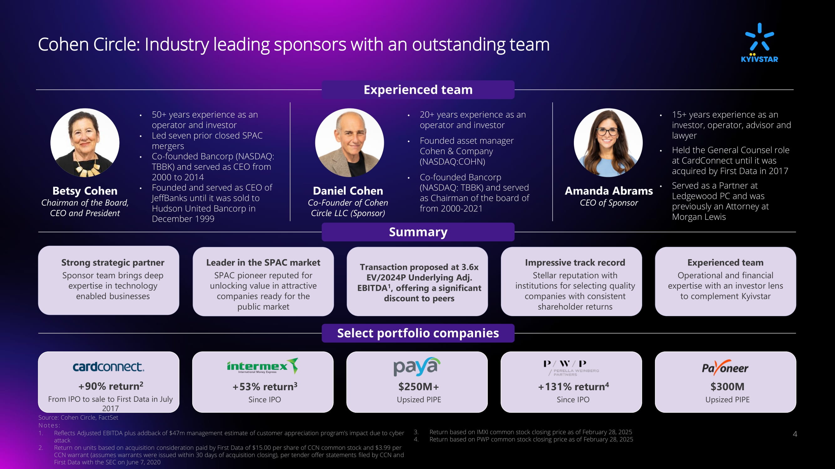 4 Cohen Circle: Industry leading sponsors with an outstanding team N o te s : 1. Reflects Adjusted EBITDA plus addback of $47m management estimate of customer appreciation program’s impact due to cyber attack 2. Return on units based on acquisition consideration paid by First Data of $15.00 per share of CCN common stock and $3.99 per CCN warrant (assumes warrants were issued within 30 days of acquisition closing), per tender offer statements filed by CCN and First Data with the SEC on June 7, 2020 3. Return based on IMXI common stock closing price as of February 28, 2025 4. Return based on PWP common stock closing price as of February 28, 2025 Select portfolio companies +90% return 2 From IPO to sale to First Data in July 2017 Source: Cohen Circle, FactSet +53% return 3 Since IPO $250M+ Upsized PIPE +131% return 4 Since IPO $300M Upsized PIPE Experienced team • 50+ years experience as an operator and investor • Led seven prior closed SPAC mergers • Co - founded Bancorp (NASDAQ: TBBK) and served as CEO from 2000 to 2014 • Founded and served as CEO of JeffBanks until it was sold to Hudson United Bancorp in December 1999 Betsy Cohen Chairman of the Board, CEO and President • 20+ years experience as an operator and investor • Founded asset manager Cohen & Company (NASDAQ:COHN) • Co - founded Bancorp (NASDAQ: TBBK) and served as Chairman of the board of from 2000 - 2021 Summary • 15+ years experience as an investor, operator, advisor and lawyer • Held the General Counsel role at CardConnect until it was acquired by First Data in 2017 • Served as a Partner at Ledgewood PC and was previously an Attorney at Morgan Lewis Daniel Cohen Co - Founder of Cohen Circle LLC (Sponsor) Amanda Abrams CEO of Sponsor Strong strategic partner Sponsor team brings deep expertise in technology enabled businesses Leader in the SPAC market SPAC pioneer reputed for unlocking value in attractive companies ready for the public market Experienced team Operational and financial expertise with an investor lens to complement Kyivstar Impressive track record Stellar reputation with institutions for selecting quality companies with consistent shareholder returns Transaction proposed at 3.6x EV/2024P Underlying Adj.