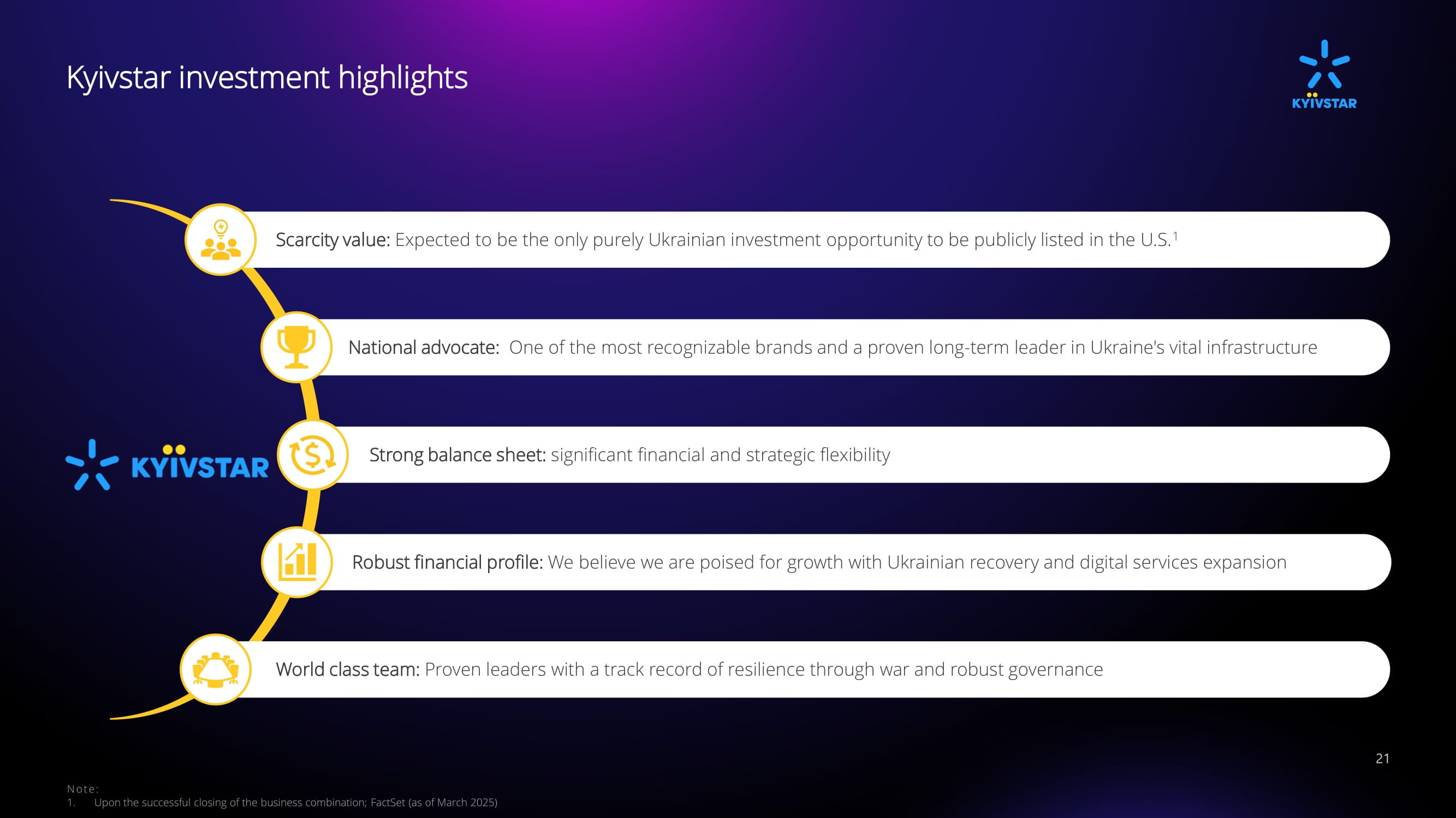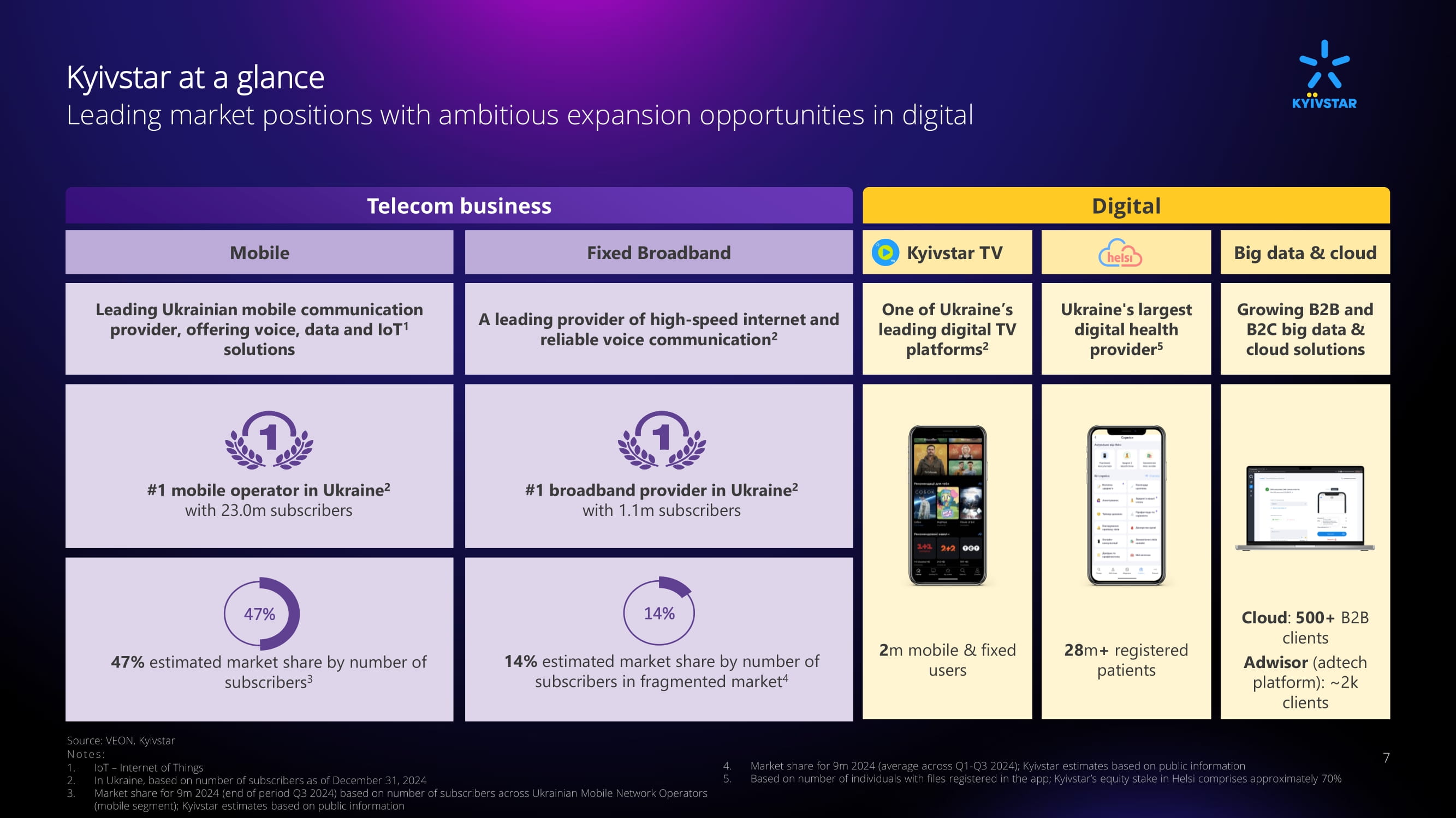 Upon the successful closing of the business combination Kyivstar at a glance Leading market positions with ambitious expansion opportunities in digital 7 Telecom business Digital Leading Ukrainian mobile communication provider, offering voice, data and IoT 1 solutions Leading Ukrainian mobile communication provider, offering voice, data and IoT 1 solutions A leading provider of high - speed internet and reliable voice communication 2 A leading provider of high - speed internet and reliable voice communication 2 One of Ukraine’s leading digital TV platforms 2 One of Ukraine’s leading digital TV platforms 2 Ukraine's largest digital health provider 5 Ukraine's largest digital health provider 5 Growing B2B and B2C big data & cloud solutions Growing B2B and B2C big data & cloud solutions Big data & cloud Big data & cloud Mobile Mobile Fixed Broadband Fixed Broadband Kyivstar TV Kyivstar TV #1 mobile operator in Ukraine 2 with 23.0m subscribers #1 broadband provider in Ukraine 2 with 1.1m subscribers 47% estimated market share by number of subscribers 3 47% 14% estimated market share by number of subscribers in fragmented market 4 14% 2 m mobile & fixed users 28 m + registered patients Cloud : 500+ B2B clients Adwisor (adtech platform): ~2k clients Source: VEON, Kyivstar N o te s : 1. IoT – Internet of Things 2. In Ukraine, based on number of subscribers as of December 31, 2024 3. Market share for 9m 2024 (end of period Q3 2024) based on number of subscribers across Ukrainian Mobile Network Operators (mobile segment); Kyivstar estimates based on public information 4. Market share for 9m 2024 (average across Q1 - Q3 2024); Kyivstar estimates based on public information 5.