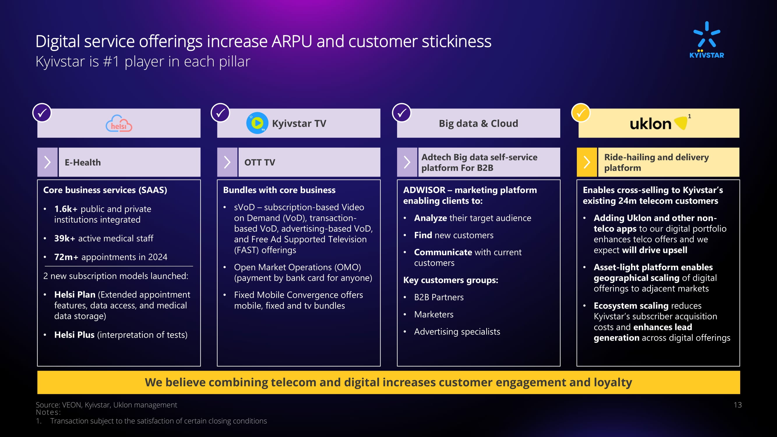 After acquisition of Volia by Lifecell official reports 2. A median among top 15 players in the market by B2C subscribers (for 9m 2024); based on Kyivstar estimates on the basis of NCEC 5. 3. The four previously largest players acquired comprise of Data Group, Volia, Vega, and Freenet 4. Average across Q1 - Q3 2024 As of December 2024 6. Fixed Mobile Convergence refers to users who are mobile and fixed broadband subscribers Estimated market share by number of subscribers (9m 2024) 4 , % 1.1 m broadband customers (85% Fixed Mobile Convergence) 6 Kyivstar key highlights 5 25% of our customers are also Digital TV users First fiber - to - the - home acquisition completed by Kyivstar in 2024 43.5k broadband - connected buildings (Dec 2024) The Ukrainian fixed broadband market is very fragmented, with the majority captured by smaller players Leadership in Fixed Broadband segment Leading market share with significant consolidation potential Ukrainian fixed broadband market Kyivstar fixed broadband segment highlights (m) ~3k broadband providers in total, with the top three players (Kyivstar, Ukrtelecom and Lifecell 1 ) controlling only ~25% of total subscribers as of Q3 2024 B2C monthly median ARPU ~US$4 2 Market consolidation opportunity (four of the largest providers have been acquired since 2021) 3 Ukrtelecom is an incumbent operator with a mostly legacy network 14.0% 5.6% 5.0% 75.4% #1 Kyivstar #2 Ukrtelecom #3 Volia Other providers 12 Leveraging our loyal subscriber base with digital products and services Strong growth with low customer acquisition costs Big Data & AdTech platform 2.0 m mobile & fixed users 6.2 m app MAU 1 0.1 m B2B end users (licenses) 0.9 m apps MAU 1 Real - time kinematic 2 , Cybersecurity, IoT platform, Digital marketplace 2.4 m app + web MAU 1 ~70 m SMS per month sent through ADWISOR platform 3.