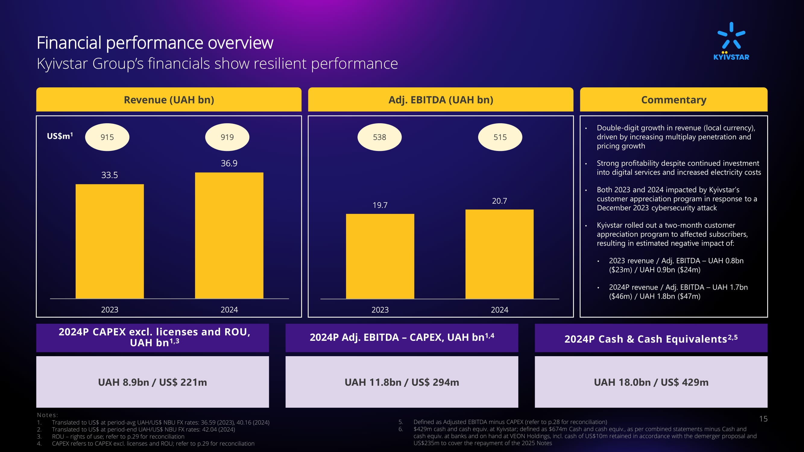 Translated to US$ at period - avg UAH/US$ NBU FX rates: 36.59 (2023), 40.16 (2024) 2. Translated to US$ at period - end UAH/US$ NBU FX rates: 42.04 (2024) 3. ROU – rights of use; refer to p.29 for reconciliation 4. CAPEX refers to CAPEX excl. licenses and ROU; refer to p.29 for reconciliation 5. Defined as Adjusted EBITDA minus CAPEX (refer to p.28 for reconciliation) 6. $429m cash and cash equiv. at Kyivstar; defined as $674m Cash and cash equiv., as per combined statements minus Cash and cash equiv. at banks and on hand at VEON Holdings, incl. cash of US$10m retained in accordance with the demerger proposal and US$235m to cover the repayment of the 2025 Notes UAH 18.0bn / US$ 429m UAH 11.8bn / US$ 294m UAH 8.9bn / US$ 221m 515 538 US$m 1 • Double - digit growth in revenue (local currency), driven by increasing multiplay penetration and pricing growth • Strong profitability despite continued investment into digital services and increased electricity costs • Both 2023 and 2024 impacted by Kyivstar’s customer appreciation program in response to a December 2023 cybersecurity attack • Kyivstar rolled out a two - month customer appreciation program to affected subscribers, resulting in estimated negative impact of: • 2023 revenue / Adj. EBITDA – UAH 0.8bn ($23m) / UAH 0.9bn ($24m) • 2024P revenue / Adj. EBITDA – UAH 1.7bn ($46m) / UAH 1.8bn ($47m) 919 36.9 915 2024P Adj. EBITDA – CAPEX, UAH bn 1,4 2024P CAPEX excl. licenses and ROU, UAH bn 1,3 2024P Cash & Cash Equivalents 2,5 Revenue (UAH bn) Adj.