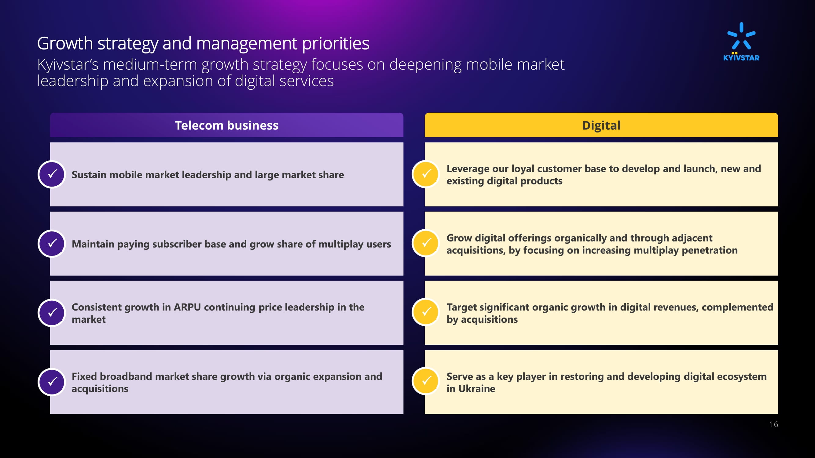 Transaction subject to the satisfaction of certain closing conditions • Cross - selling opportunities expected to enhance multiplay penetration within Kyivstar’s customer base • Margin expansion arising from low customer acquisition costs • Uklon offers access to significant additional data with extensive and valuable customer data attributes • Improved customer service and customer retention driving more targeted value - offering across different channels Operates a leading delivery platform in Ukraine Completed 3m+ deliveries in 2024 100k+ driver - partners with presence across 27 cities operate on the Uklon platform Completed 100m+ rides in 2024 $65 million revenue generated in 2024 30% revenue CAGR over the last three years (2021 – 2024) Self - sustaining business with significant growth potential Expanded to Uzbekistan in 2023 Potential synergies 19.7 20.7 2023 2024 33.5 2023 2024 15 Financial performance overview Kyivstar Group’s financials show resilient performance N o te s : 1.