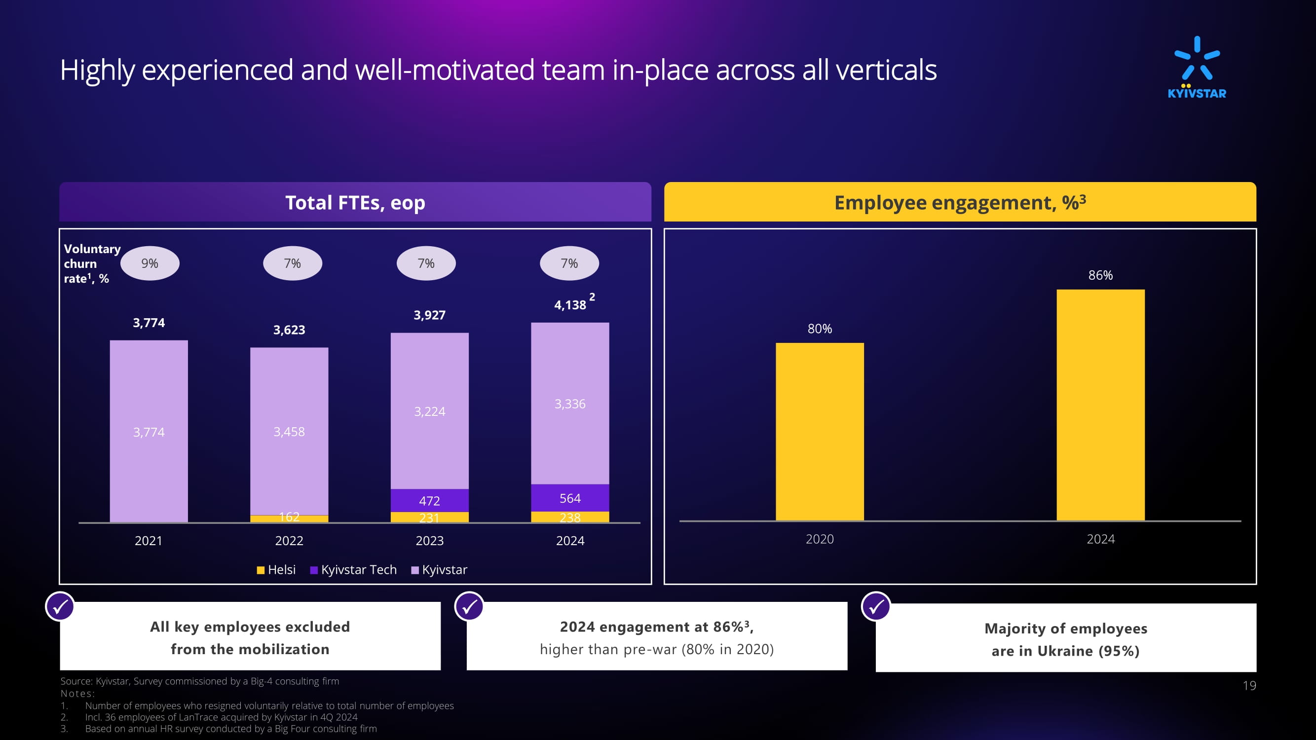 Number of employees who resigned voluntarily relative to total number of employees 2. Incl. 36 employees of LanTrace acquired by Kyivstar in 4Q 2024 3.