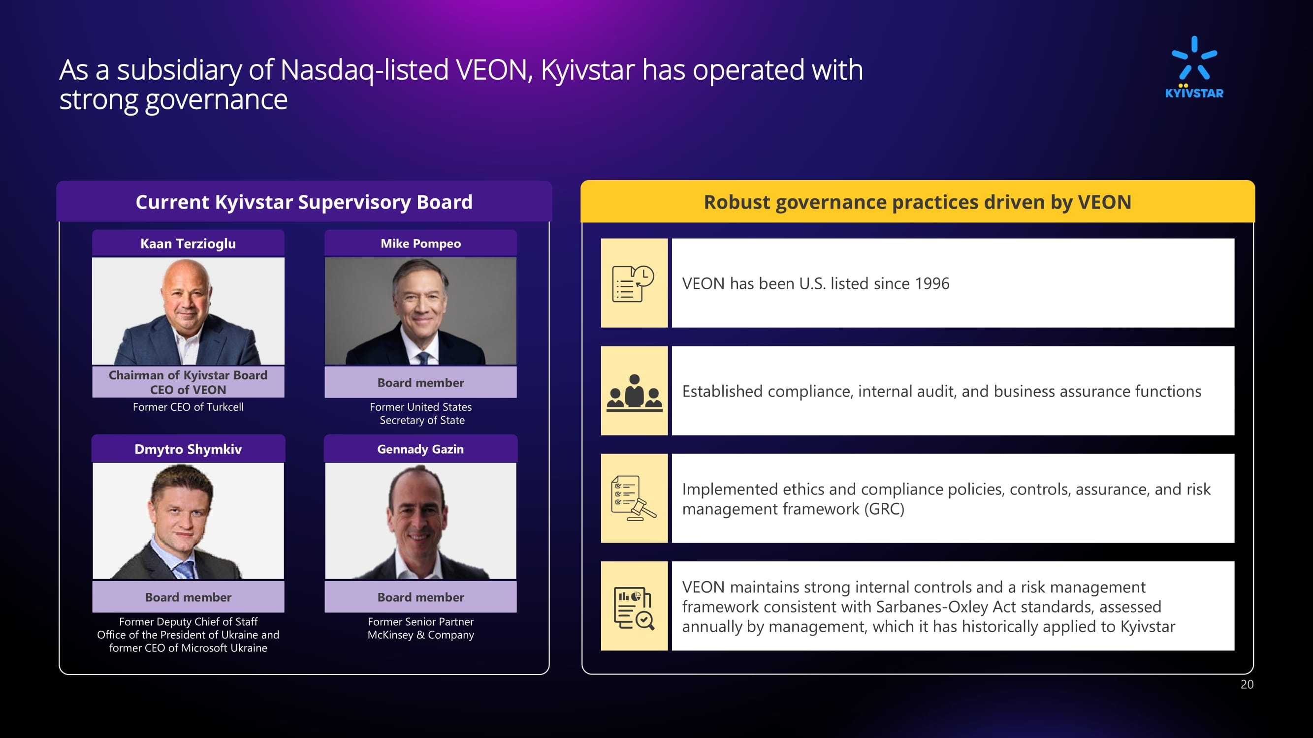 Based on annual HR survey conducted by a Big Four consulting firm Voluntary churn rate 1 , % 2 9% 7% 7% 3,774 3,458 3,224 3,336 3,774 3,623 3,927 2021 564 238 2024 162 2022 Helsi Kyivstar Tech 472 231 2023 Kyivstar 7% 4,138 2 All key employees excluded from the mobilization Majority of employees are in Ukraine (95%) 2024 engagement at 86% 3 , higher than pre - war (80% in 2020) 80% 86% 2020 2024 As a subsidiary of Nasdaq - listed VEON, Kyivstar has operated with strong governance 20 Current Kyivstar Supervisory Board Robust governance practices driven by VEON Kaan Terzioglu Dmytro Shymkiv Chairman of Kyivstar Board CEO of VEON Board member Office of the President of Ukraine Former Deputy Chief of Staff and former CEO of Microsoft Ukraine Former CEO of Turkcell Mike Pompeo Gennady Gazin Board member Board member Former Senior Partner McKinsey & Company Former United States Secretary of State VEON has been U.S.
