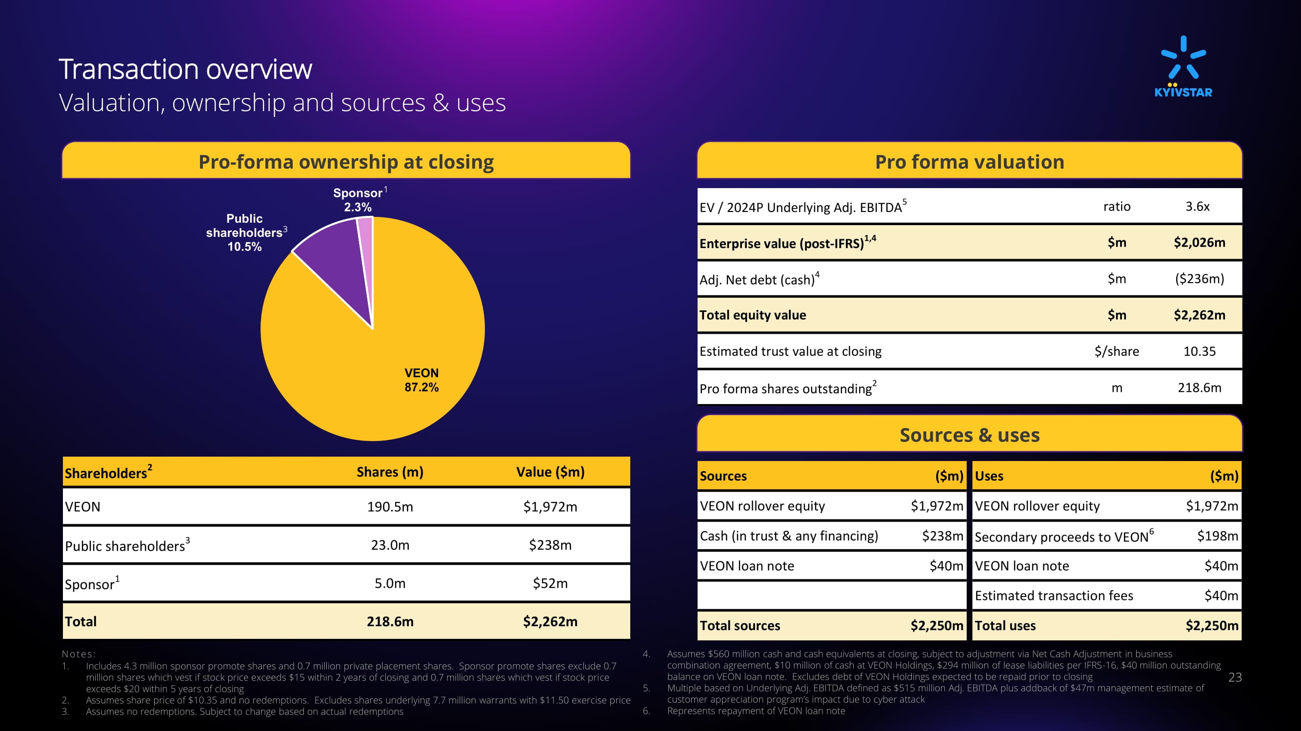 3.6x 8.0x 4.9x 5.5x 8.0x 4.8x 6.8x ~2.8x 4.8x 4.7x 7.7x 4.6x 5.0x 7.7x 3.9x 3.8x 9.2x 8.9x 8.6x 8.1x 7.8x 7.3x 4.3x 6.3x 6.0x 6.4x 6.2x 6.4x 5.5x 5.1x Attractive valuation relative to peers 22 2024 - 2025 EV / EBITDA 1 Sources: FactSet (as of 19 March 2025) calendarised to Dec YE, Equity analyst research notes Notes: Europe peers include BT, Deutsche Telekom, KPN, Orange, OTE, Proximus, Swisscom, Telecom Italia, Telefonica, Telenor, Telia, Elisa, Tele2, Vodafone, Orange Belgium, Sunrise, Orange Polska, Magyar Telekom; APAC peers include NTT, Spark NZ, SingTel, Telstra, KDDI, Softbank KK, TPG, KT Corp, Telkom Indonesia, CelcomDigi, AIS, Indosat, Axiata, LG Uplus, Maxis, SK Telecom, True, XL Axiata, Grameenphone; Emerging / MEA peers include Airtel Africa, MTN, Safaricom, Vodacom, Omantel, Zain, Mobily, STC, Etisalat, Ooredoo, Zain KSA, Du, Telkom SA; Global peers include all of the above. 1. EBITDA definition for comparable companies may not be directly comparable to Kyivstar definition; EV / 2024P Underlying Adj. EBITDA for Kyivstar; Multiple based on EV / 2024P Adj. EBITDA plus addback of $47m management estimate of customer appreciation program’s impact due to cyber attack 2. 2024 EBITDA margins above 35% 3. Defined as peers with > 75% of their total revenue deriving from a single country 4. By subscriber market share 5. Calculated as Adjusted EBITDA divided by Total operating revenues; please refer to p.29 for reconciliation 1 Ukraine Global Europe APAC peers peers peers MEA peers Kenya Ukraine GB EBITDA margin ‘24 37.2% 40.2% 46.7% 48.0% 38.2% 37.6% 35.7% 50.3% 45.7% 53.0% 47.6% 37.6% 36.7% 37.3% Average of peer group multiples NL Greece Hungary ANZ Indonesia Malaysia Thailand Thailand Multiples of EMEA / APAC single country peers 2, 3 with leading market positions 4 Median: 6.7x Median: 6.2x 2025 EV/ EBITDA 2024 EV/ EBITDA 56.0% 5 Pro forma valuation Transaction overview Valuation, ownership and sources & uses 23 N o te s : 1.