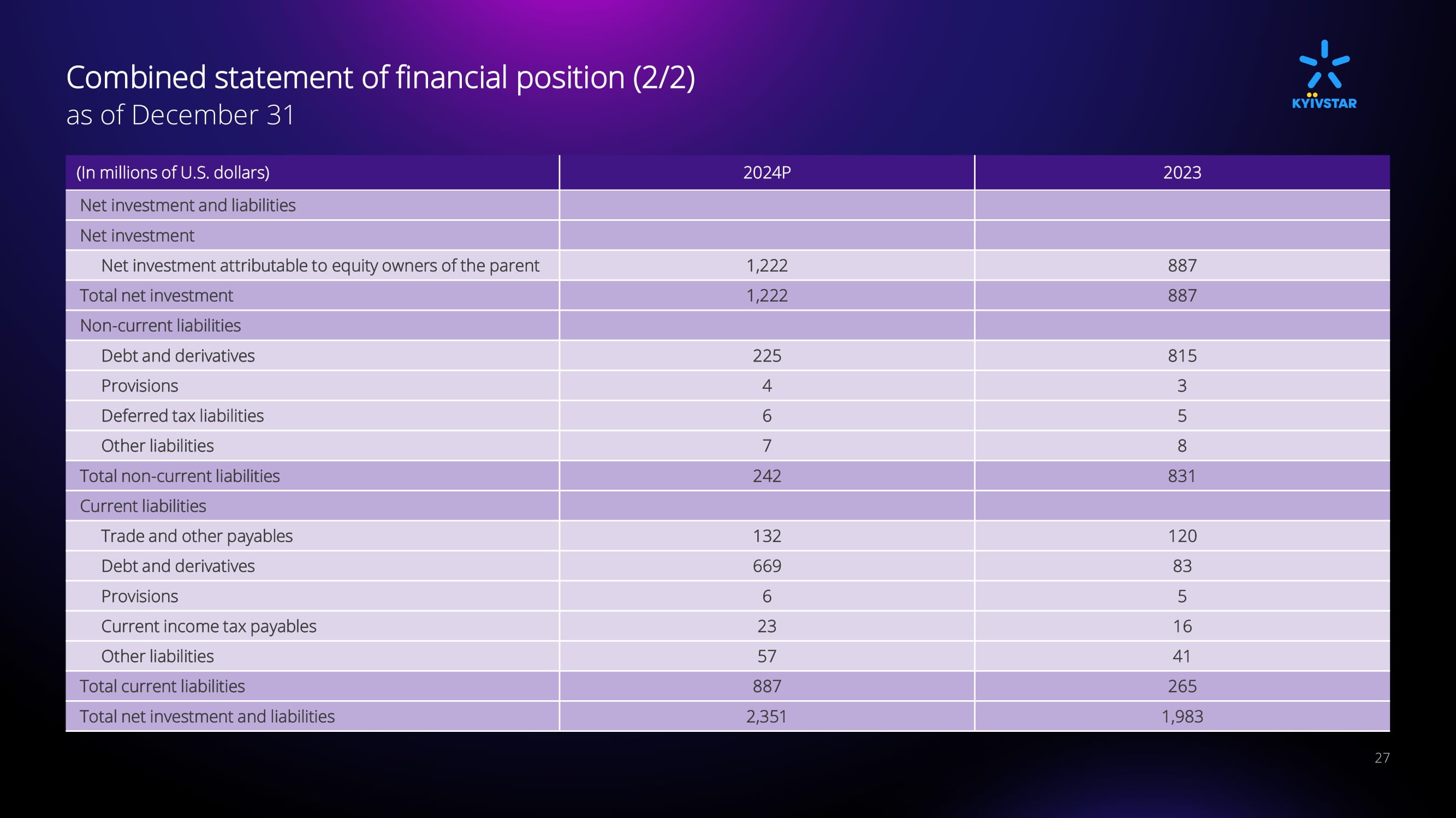 26 Combined statement of financial position (1/2) as of December 31 2023 2024P (In millions of U.S. dollars) Assets Non - current assets 597 624 Property and equipment 272 297 Intangible assets 343 - Loan receivable from VEON Amsterdam - 115 Investments and derivatives 67 80 Other assets 1,279 1,116 Total non - current assets Current assets 4 3 Inventories 55 40 Trade and other receivables - 16 Receivable from VEON Ltd.